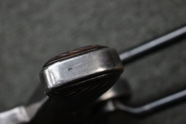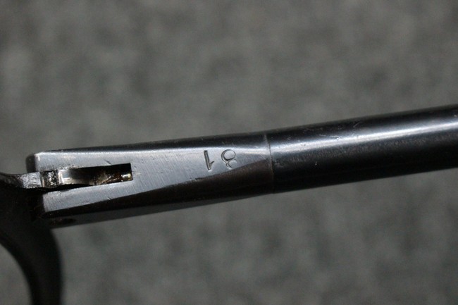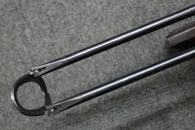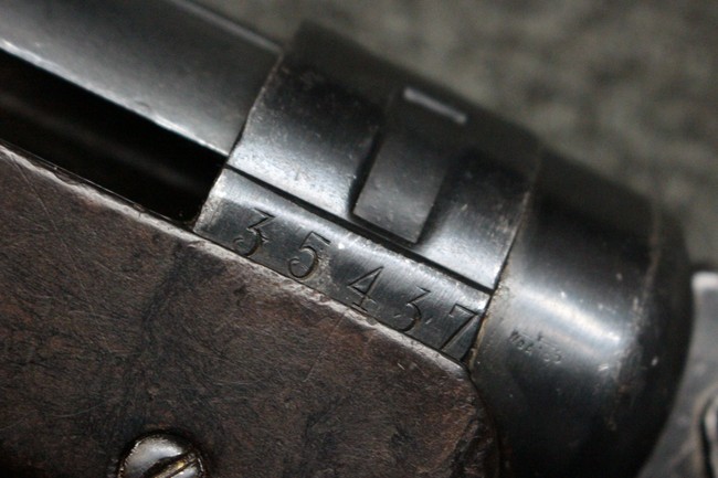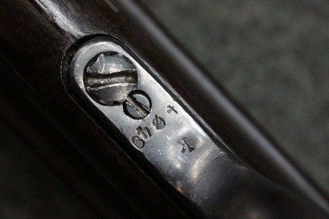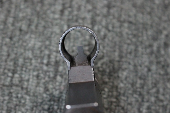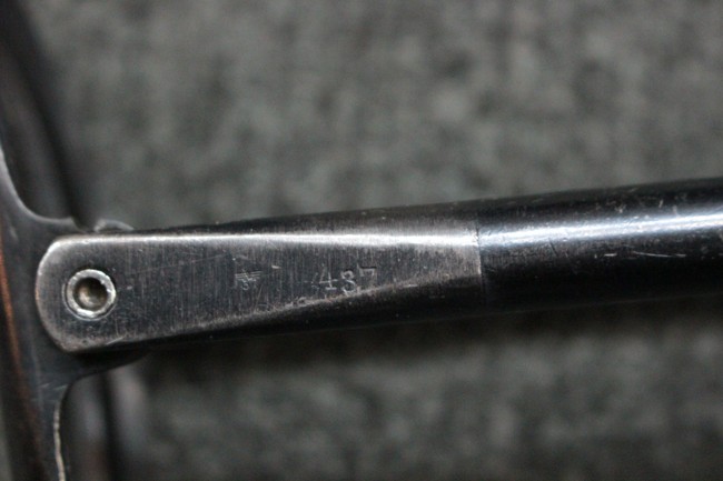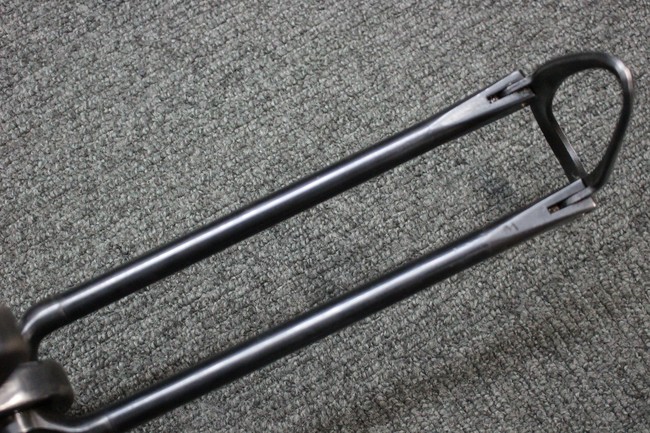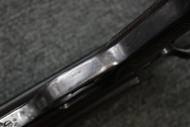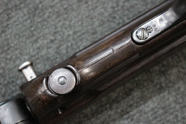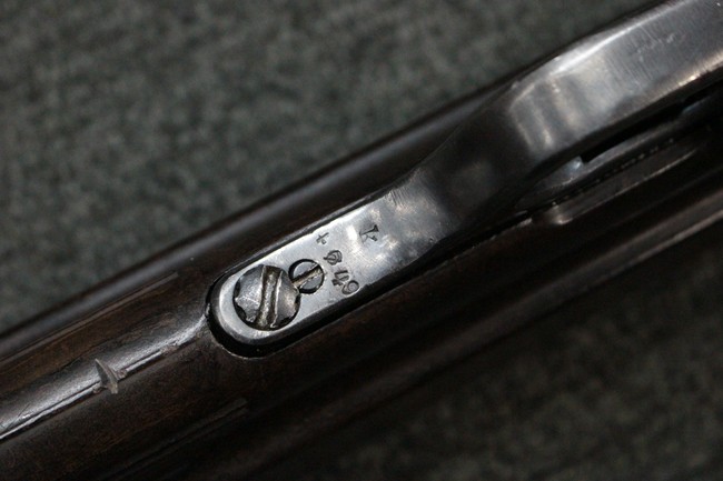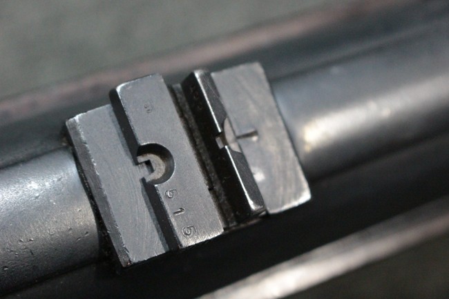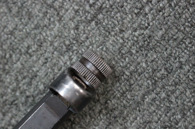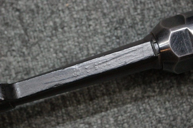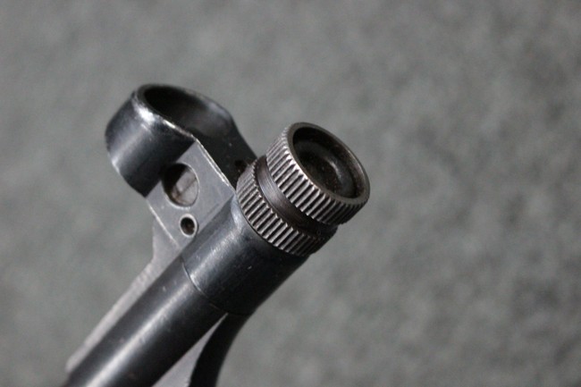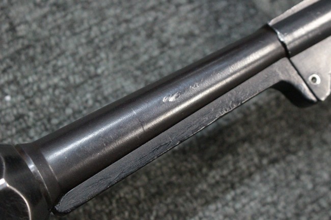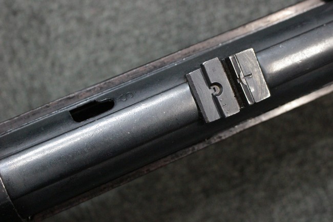 本品のレシーバー・エンド・キャップ上面にはC.G.ハーネル社製を示す「MP40 fxo 」の刻印が入っています。 マガジン・ハウジングは両面に5本の強化リブが追加されたタイプとなっています。 シリアルNo.5515はアッパー・レシーバー、フロント・サイト・ガード、銃身、リア・サイトでマッチしています。 その他の部分のシリアルNo.については、ロア・レシーバーは35437、トリガー・ガードが749、ストックのロック解除ボタンと折り畳みストックが81や437、リコイル・スプリング・アッセンブリが140となっています。 その他、各部にはアムト刻印が見られます。 マズル・リングは後期型の中央に溝のあるH型、バレル・ナットは六角型、バレル・レストは樹脂製となっており、コッキング・ハンドルは1942年半ば以降に本格的に導入されたボルト・セーフティ機能を備えた2ピース・タイプが装備されています。