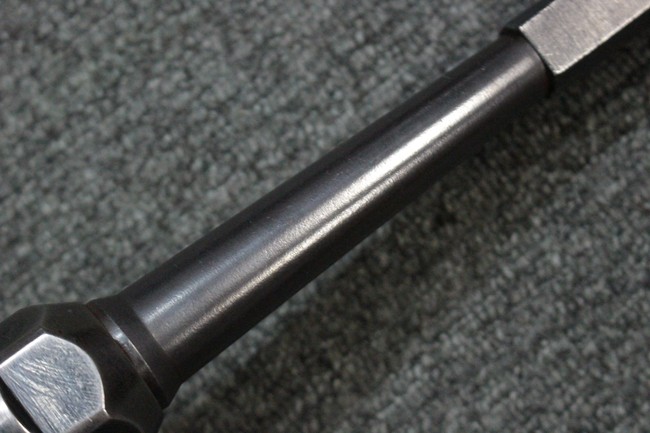 MP38ではレシーバーを無垢の鉄材からの削り出しで製作していた他、グリップ・フレームが鋳造アルミ合金製でしたが、MP40では生産性を向上させるためにレシーバー及びグリップ・フレームに鋼板プレス加工を採用しました。 これにより製造工程が簡略化された他、ドイツ国内で調達が難しかったアルミニウムの節約にも繋がりました。 また、MP38ではマガジンに弾薬を装填した状態で銃を後部から落下させた際に、ボルトが前進位置から跳ね上がって暴発する危険性がありましたが、1940年後半にドイツの銃器設計者ヒューゴ・シュマイザーによってコッキング・ハンドルを内側に押し込む事によりボルトを閉鎖位置で固定するフォワード・ロック・セーフティが開発されました。 このセーフティ機能を備えた新たな2ピース型のコッキング・ハンドルは、1942年半ば以降に製造されたMP40から本格的に装備されるようになりました。