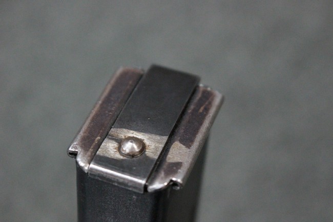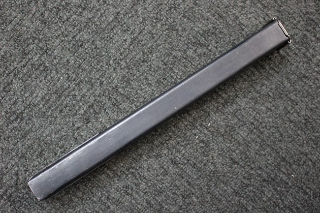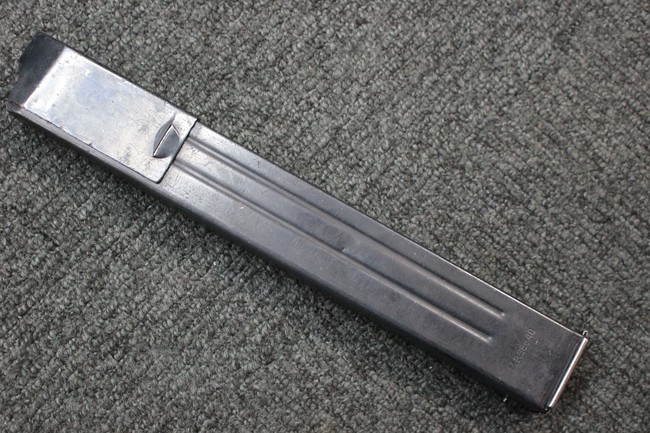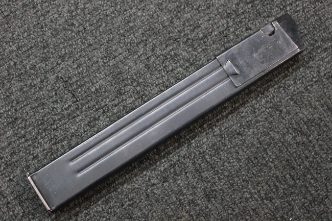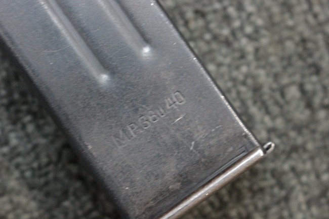 本品の金属部はやや打ち傷や擦れ、若干の表面錆や経年による褪色が見られるものの、現状目立った欠損等は見られず、全体に良くブルー仕上げが残っています。 上下レシーバーの取り付けにやや遊びが見られますが、あまり気にならないレベルのものです。 樹脂製のハンドガードやグリップ・パネル、バレル・レストについては、やや打ち傷や線傷、摩耗は見られるものの、大きな破損等は見られず、概ねしっかりとした状態が保たれています。 グリップ・パネルは左右の色味もほぼマッチしており、違和感は感じられません。 マガジンは取り付け時に前後にやや遊びが見られるものの、固定自体はしっかりとしています。 リア・サイトの切り替えやストックの展開・折り畳み操作については問題なく行う事が可能です。 ストックは展開時及び折り畳み時に遊びが見られますが、ロック機能に問題はありません。 付属のマガジンには「M.P.38 u 40」及び1942年 ステアー・ダイムラー・プフ社製を示す「kur 42」の刻印が入っています。 マガジン左側面中央にごく浅い凹みが見られ他に若干の小傷や表面仕上げの褪色が見られるものの、大きな変形等は見られず、比較的しっかりとした状態が保たれています。 ダミーのマガジン・スプリングが入っています。
