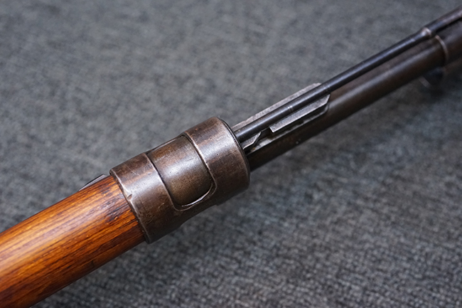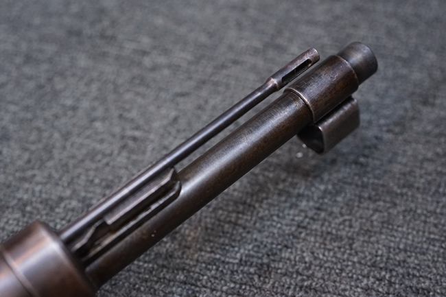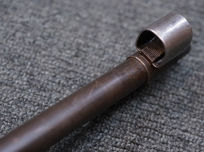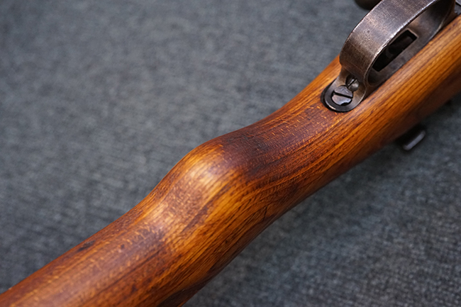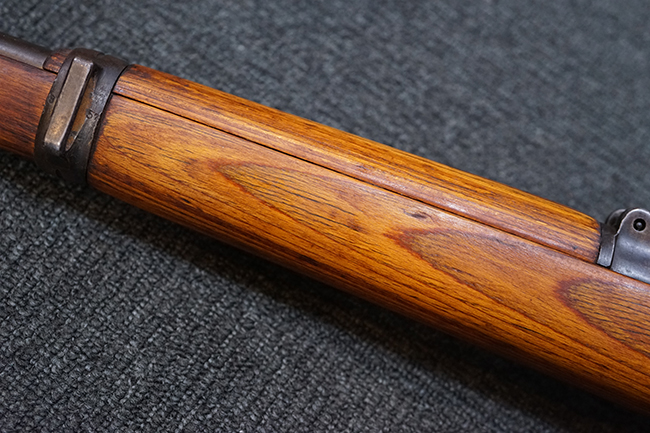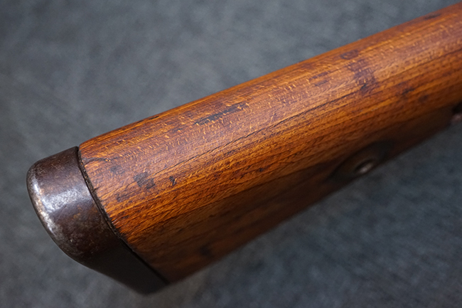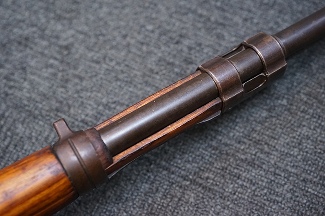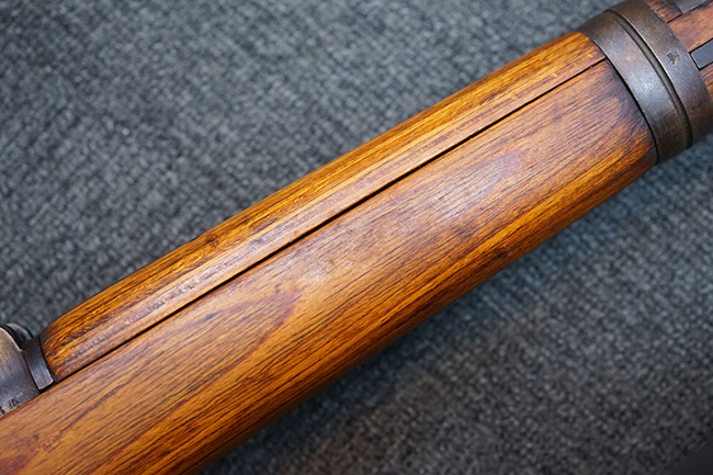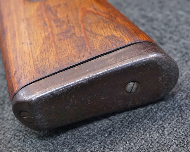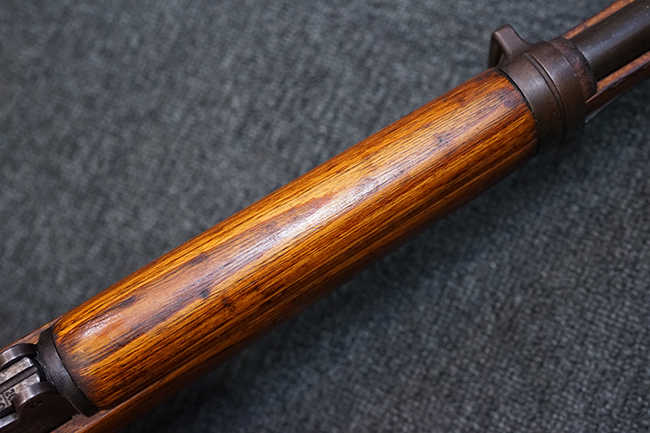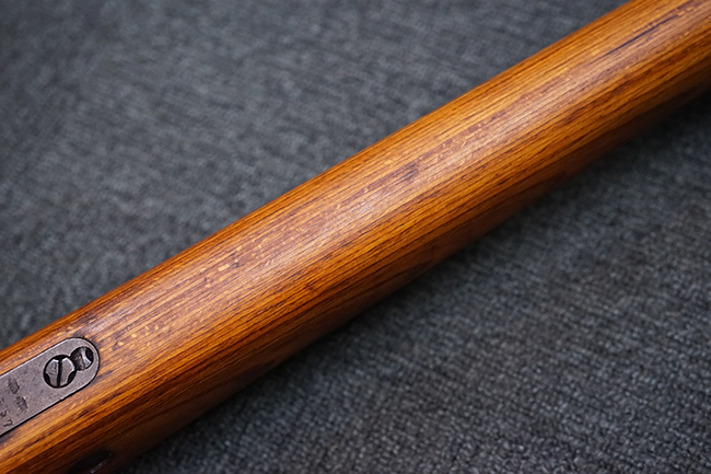 本品は全体に多少の経年が感じられ、金属部はオリジナルの仕上げも確認できますが、地金っぽくなっている部分も散見され、それらが落ち着いた状態になっています。 少々気になる点としては、除去されたファイアリング・ピンの代わりにダミーのピンが取り付けられています。 木部は角が丸くなっている印象ですが、目立った破損や劣化は見受けられず比較的良好な状態です。 ストックとアッパー・ハンドガードの色味も違和感はありません。 フロント・バンドの止め具もしっかりとはまっており脱落などの心配はございません。 傷み易いバット・プレートについても経年で色味が落ち着いており、大きな変形等は無くしっかり取り付けられています。 リア・サイトの調整については問題なく行う事が可能です。クリーニング・ロッドが付属します。 弾倉内のフォロアー及びスプリングは残っていません。