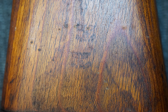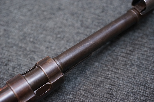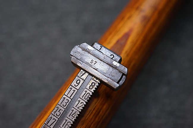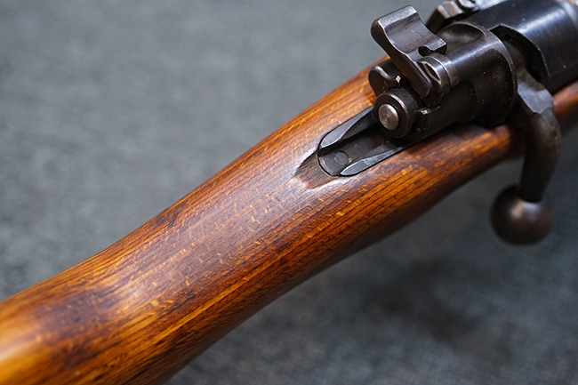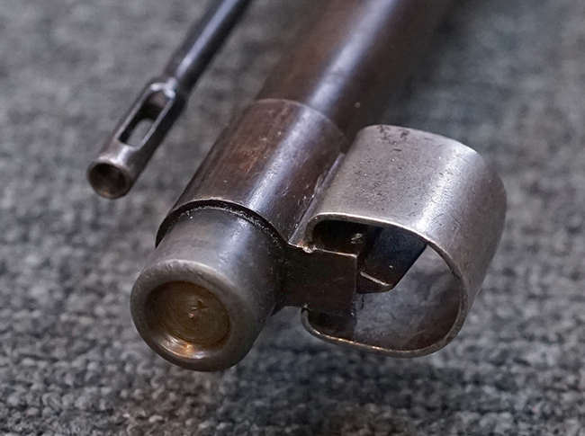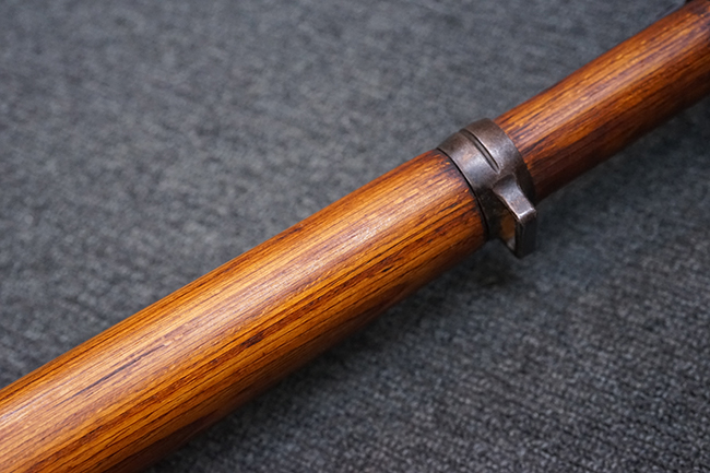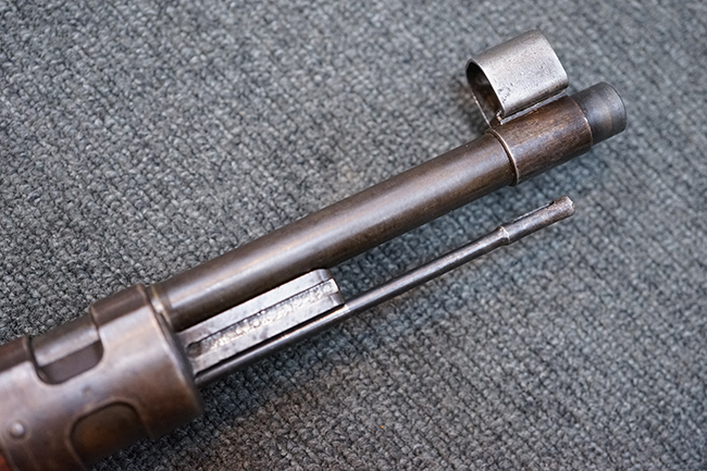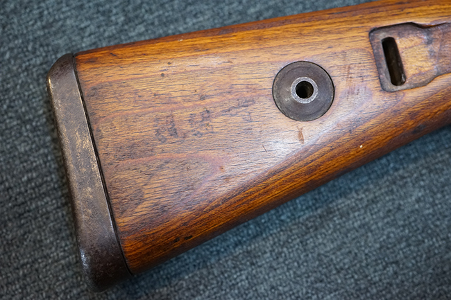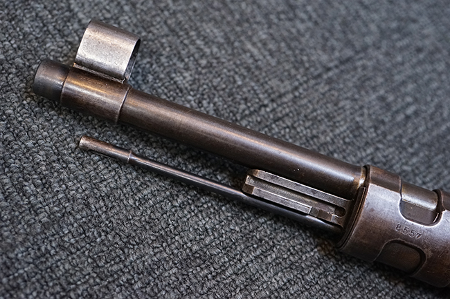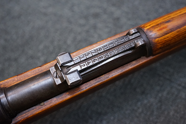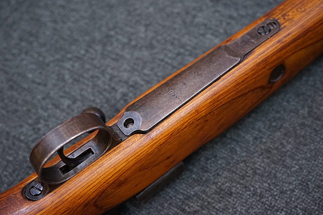 本品は全体に多少の経年が感じられ、金属部はオリジナルの仕上げも確認できますが、地金っぽくなっている部分も散見され、それらが落ち着いた状態になっています。 少々気になる点としては、除去されたファイアリング・ピンの代わりにダミーのピンが取り付けられています。 木部は角が丸くなっている印象ですが、目立った破損や劣化は見受けられず比較的良好な状態です。 ストックとアッパー・ハンドガードの色味も違和感はありません。 フロント・バンドの止め具もしっかりとはまっており脱落などの心配はございません。 傷み易いバット・プレートについても経年で色味が落ち着いており、大きな変形等は無くしっかり取り付けられています。 リア・サイトの調整については問題なく行う事が可能です。クリーニング・ロッドが付属します。 弾倉内のフォロアー及びスプリングは残っていません。