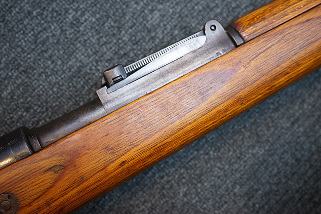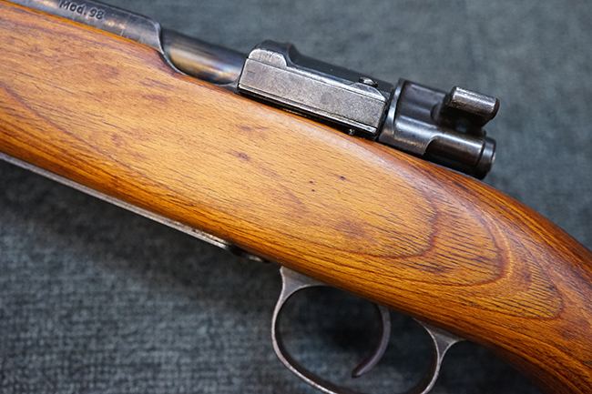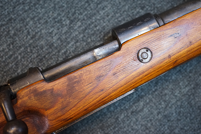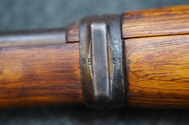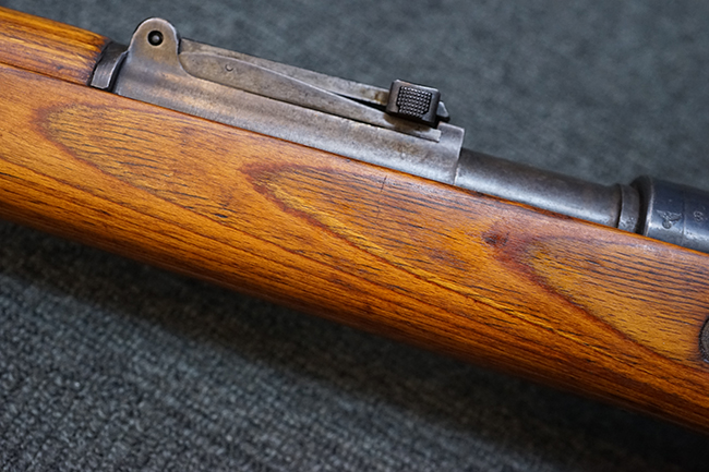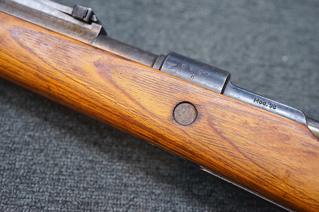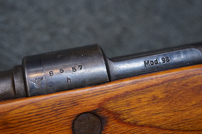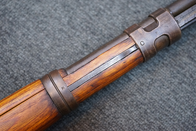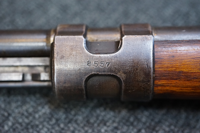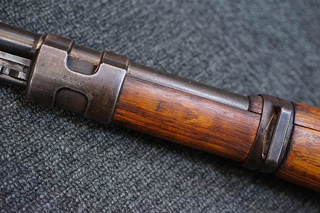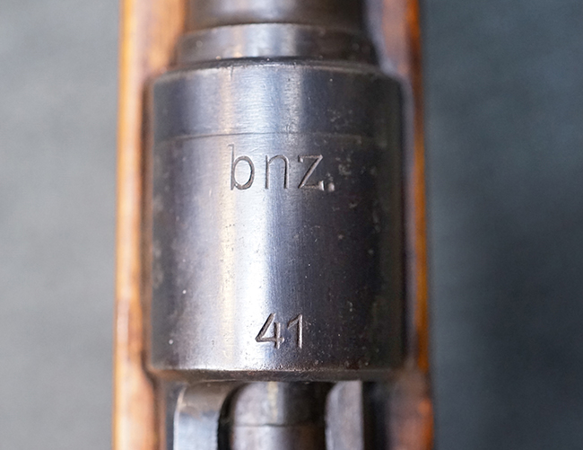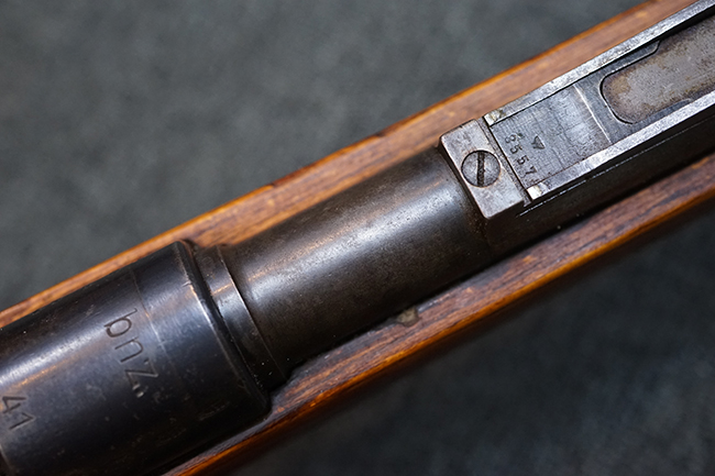 本品の薬室上部には「41 bnz」の刻印が入っている事から、1941年 ステアー社製であることが判ります。 薬室左側面にはシリアルNo.8557hが入っている他、機関部左側面に「Mod.98」の刻印が入っています。 銃床はラミネート製で、バット・プレートはカップ型の物が付いています。 また、フロント・バンドはH型が取り付けられています。 また、フロント・バンド、リア・バンド、ボルト・キャッチ、リア・サイト・リーフ、トリガー・ハウジング、にも本体と同じ番号が刻印されています。 一方でシリアルがマッチしていない部品も見られます。 各部のアムト刻印も多数打刻されています。