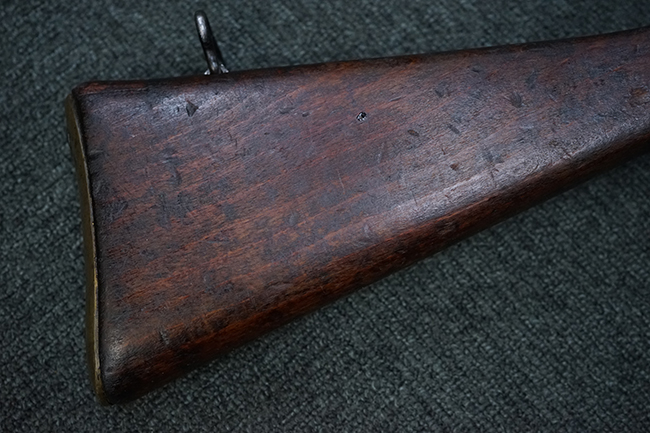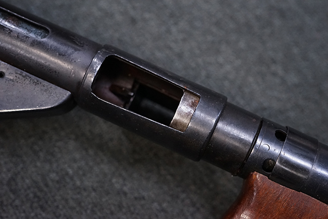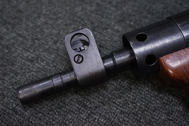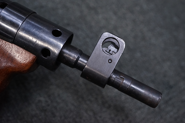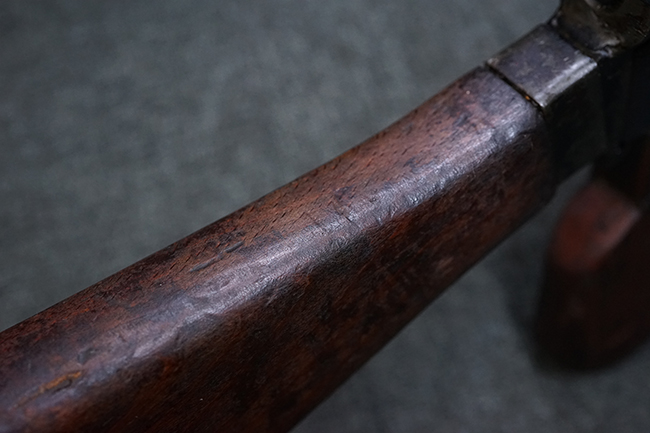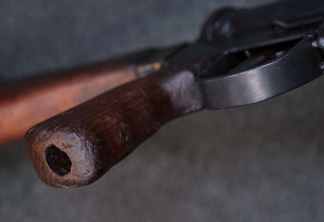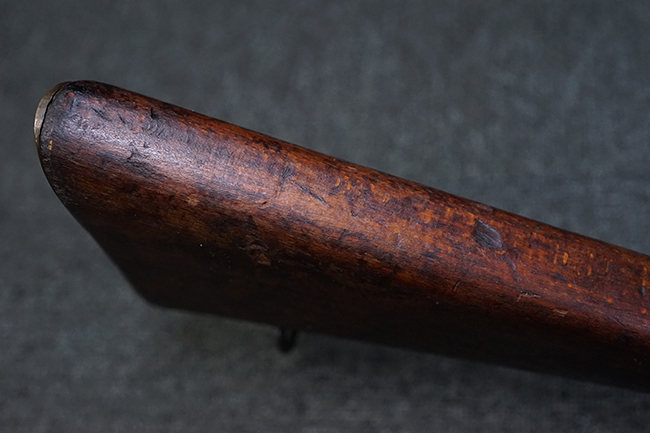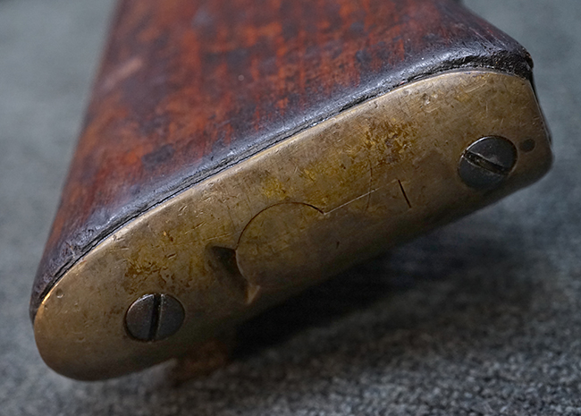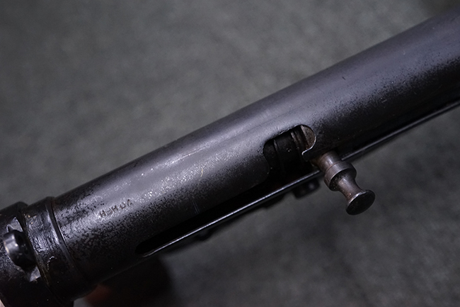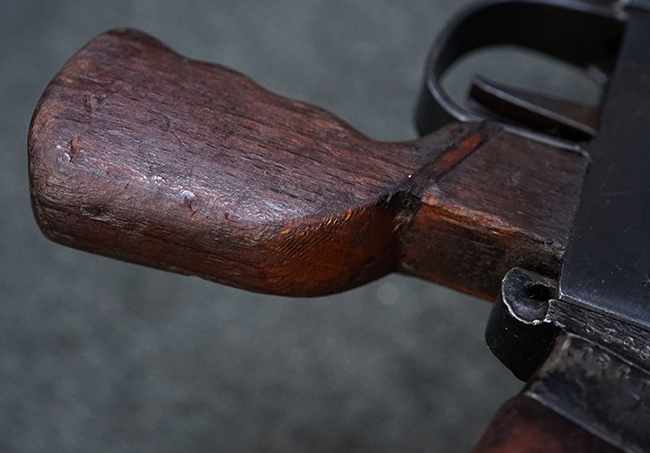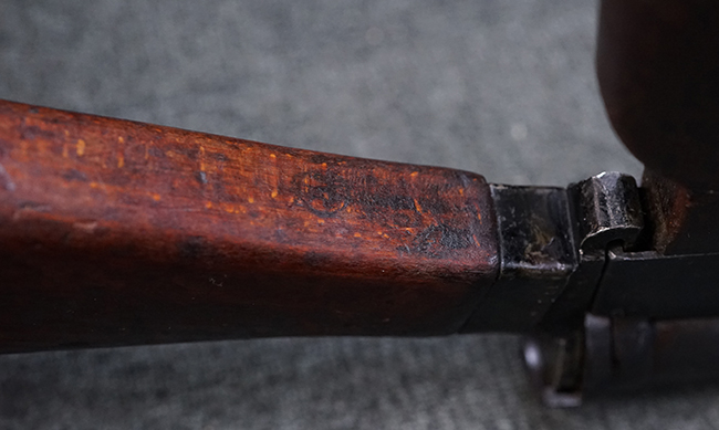 本品は全体に適度な使用感が見受けられ、機関部やバレル・ジャケットといった金属部は、やや打ち傷や擦れが見受けられるものの、目立った欠損等は見られず、概ねしっかりとした状態が保たれています。 木製バット・ストックについても、やや打ち傷や線傷等は見受けられますが、こちらも目立った破損や欠損等は見られず、概ねしっかりとした状態が保たれています。 ストックはガタツキなくしっかりと固定されています。 バット・プレートは真鍮製でコンパートメントの蓋の開閉も問題ありません。 木製グリップは背面上部が削り込まれていますが、グリップの取り付けにガタツキは見られません。 また、グリップの両側面には当時軍内で行われたと思われる正規の接ぎ木補修痕が見られますが、木質もマッチしている