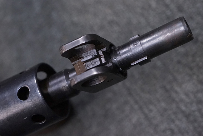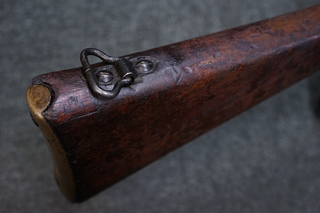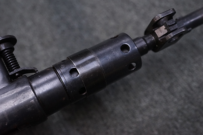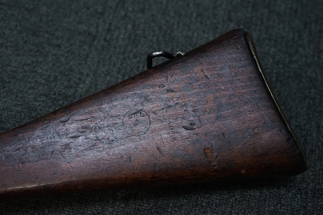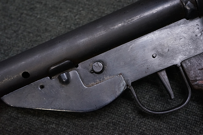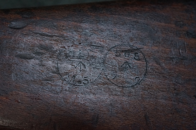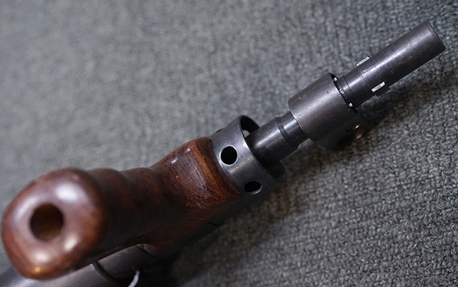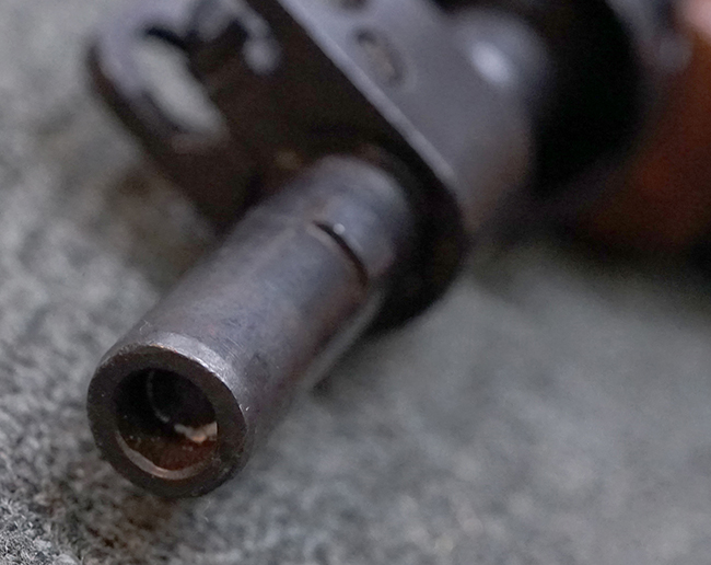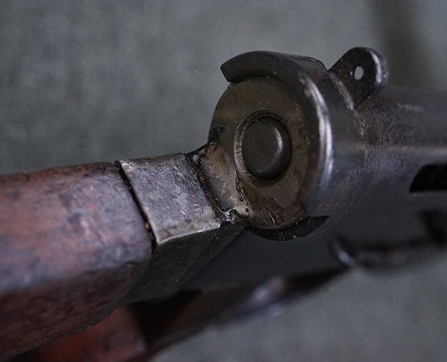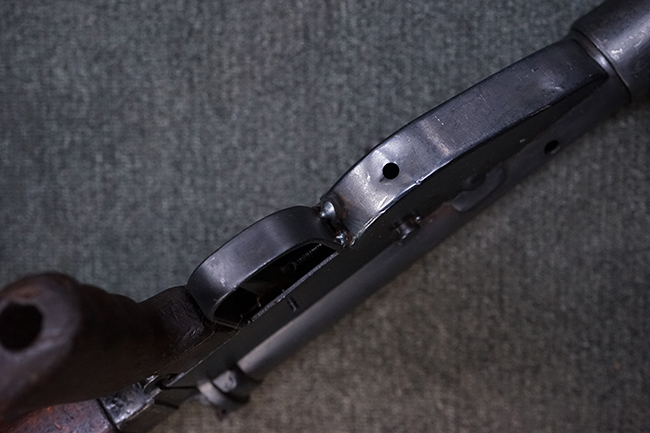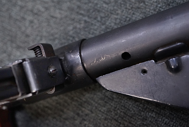 本品は全体に適度な使用感が見受けられ、機関部やバレル・ジャケットといった金属部は、やや打ち傷や擦れが見受けられるものの、目立った欠損等は見られず、概ねしっかりとした状態が保たれています。 木製バット・ストックについても、やや打ち傷や線傷等は見受けられますが、こちらも目立った破損や欠損等は見られず、概ねしっかりとした状態が保たれています。 ストックはガタツキなくしっかりと固定されています。 バット・プレートは真鍮製でコンパートメントの蓋の開閉も問題ありません。 木製グリップは背面上部が削り込まれていますが、グリップの取り付けにガタツキは見られません。 また、グリップの両側面には当時軍内で行われたと思われる正規の接ぎ木補修痕が見られますが、木質もマッチしている