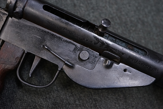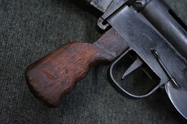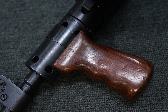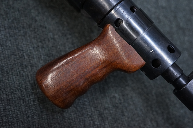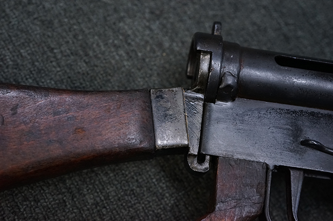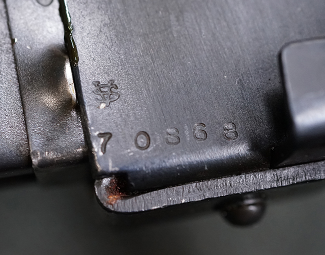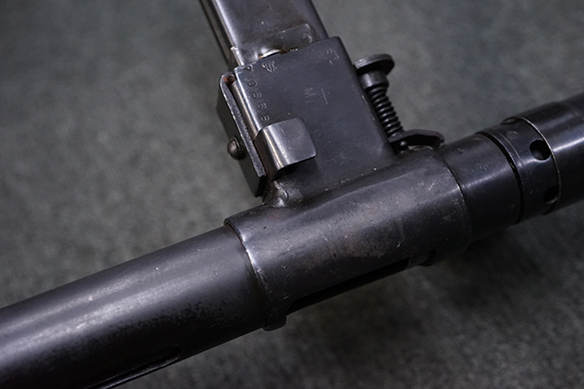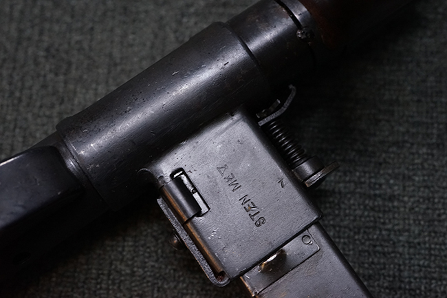 本品のマガジン・ハウジング上面にはシリアルNo.70868と「SV」の刻印、下面には「STEN MKV」のモデル名刻印が入っています。 また、レシーバー上面にも70868の刻印が見られます。 バットストック基部金具には63903を打ち消し、181127の刻印が入っています。 バットストック左側面には円の中に508とブロードアローの打刻が見られます。 本品には復刻品のフォア・グリップが付属しています。