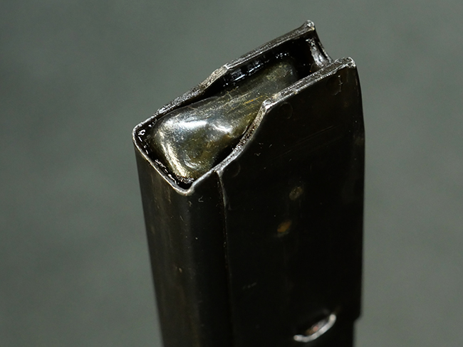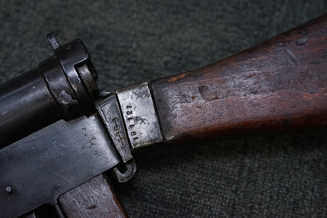 付属のマガジンは、戦後にインドでシングル・カラムに改造された19連仕様で、前面に「C.R.1.」の刻印が見られます。 若干の擦れや表面錆痕は見受けられますが、大きな凹みや変形等は見られず、比較的良好な状態が保たれています。 マガジンは装着時にやや遊びが見られますが、固定自体はしっかりとしています。 尚、マガジン・スプリングは入っています。
