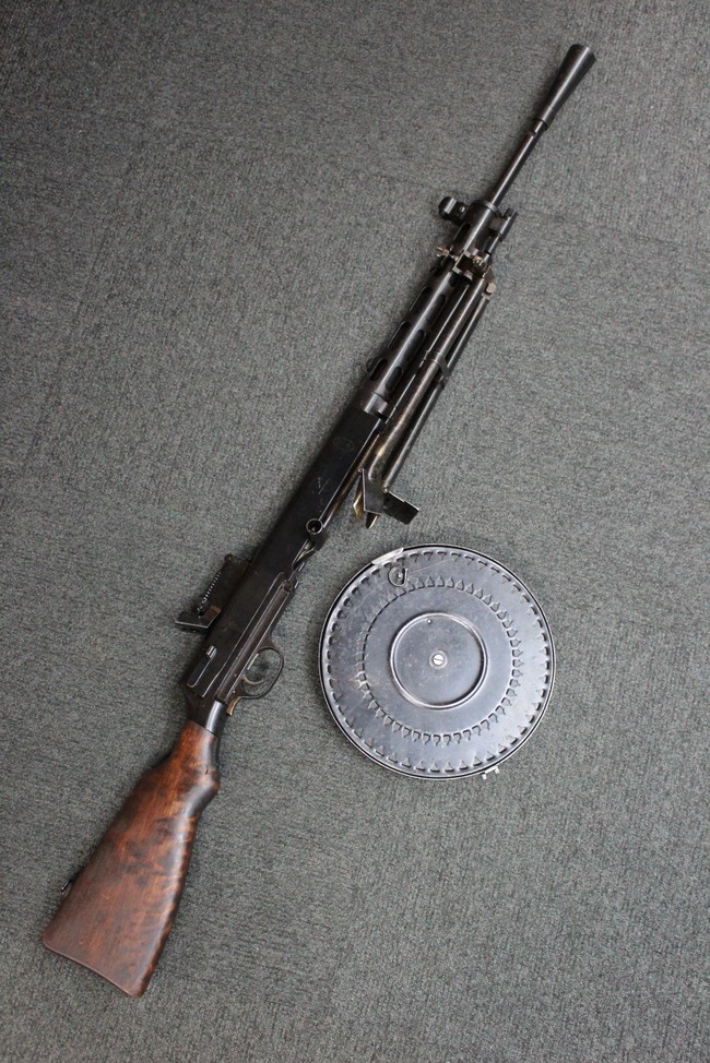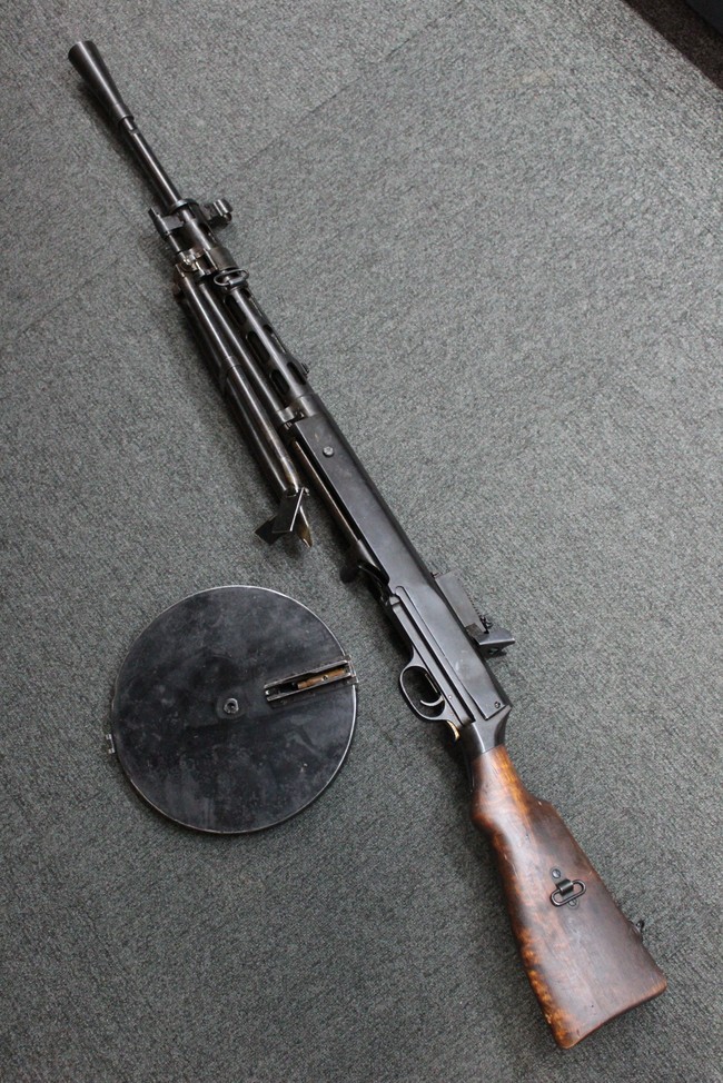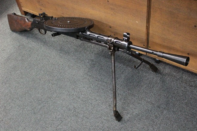 作動方式はガス圧利用式で、ロッキング・フラップによる閉鎖機構を備えています。 本銃の使用弾薬である7,62mm×54Rはリムド・カートリッジのため、マガジンは強いアーチを描くバナナ・マガジン形状となりますが、その延長として生まれたと言われる円盤型の47連パン・マガジンが本銃の最大の特徴となっています。 また、銃身から機関部にかけての細身の外観も独特で、銃身の取り外しが難しい初期型と、機関部側面に銃身ロックを設け銃身交換を容易にした後期型があります。