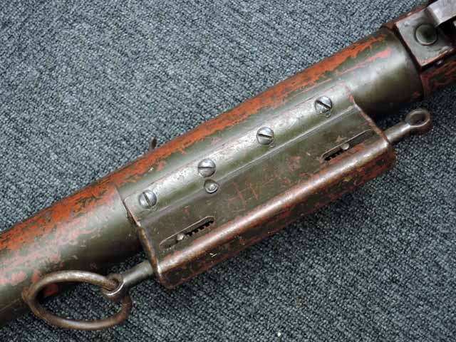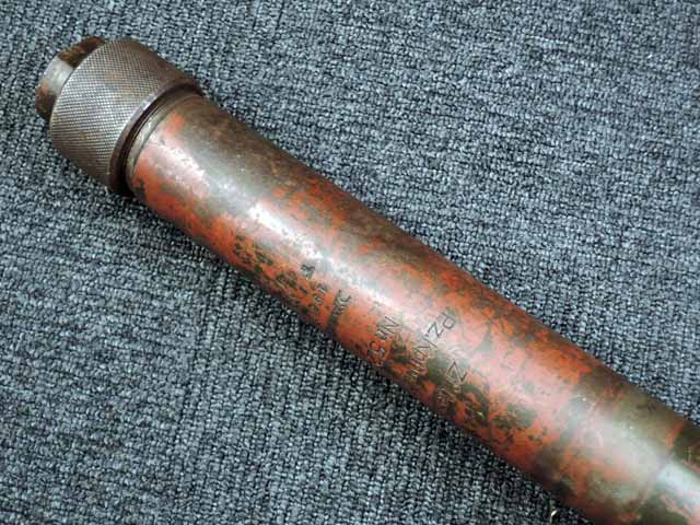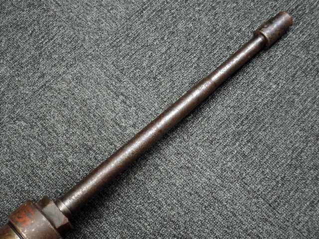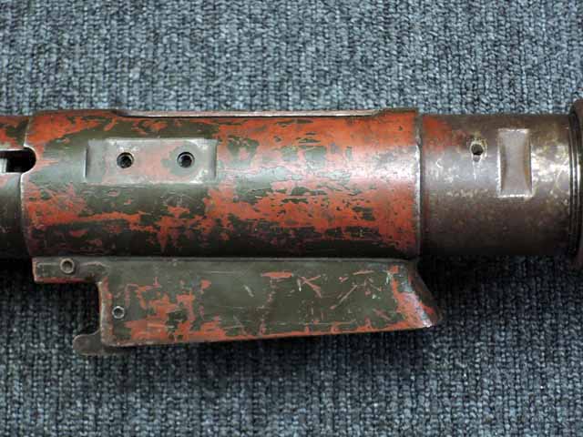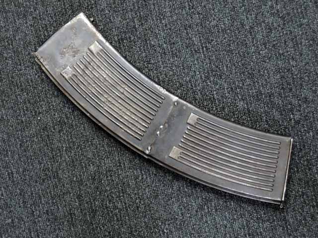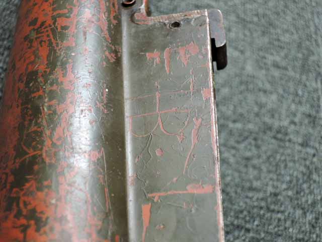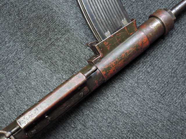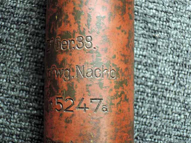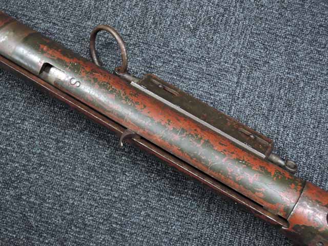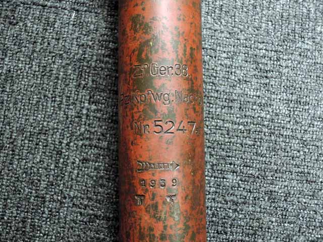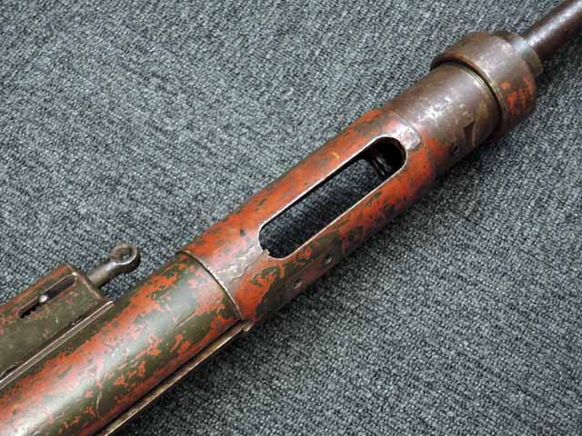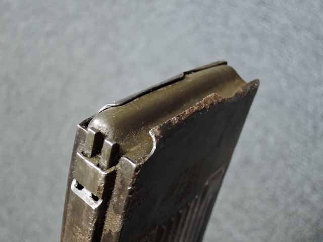 本品は通常のドイツ軍小火器に見られるようなブルーイングではなく、赤の錆止めの上にダークグリーンの塗装が施されています。 ダーク・グリーンの塗膜は大部分が失われており、全体的に赤の錆止めが露出していますが、本品の希少性とオリジナルの状態が残っている事を鑑みれば、非常に価値のあるものと言えます。 その他表面錆も散見されますが状態は安定しており、劣化が進行している様子は有りません。 本体後部に「ZfGer.38.」の刻印が見られ、続けて「Pz.Kpfwg.Nachb.」(Panzerkampfwagen-Nachbildung) が打刻されており、本品が戦車型の標的に搭載されたZf.38Pzである事が判ります。 またシリアル5247と生産年を示す1939の刻印からかなり後期の生産品である事も窺えます。 その他矢型のハーネル社の刻印やアムト印が散見され、マガジン・ハウジングにはアルファベットのような引っかき跡が見られます。 マガジンはM13のマガジン2つを溶接固定したものが付属し、マガジン・リップ側に朽ち込みの跡が散見されます。 とはいえフォロアーの動きはスムーズで、しっかりとしたテンションが残っています。 マガジンを取り付けた際前後に大きな遊びがありますが、ロック自体はかかっておりキャッチを操作しない限り脱落しません。 ZF ゲレート 38用とされるマガジンとは若干形状が異なるため、戦中/戦後に応急的に製作された可能性があります。