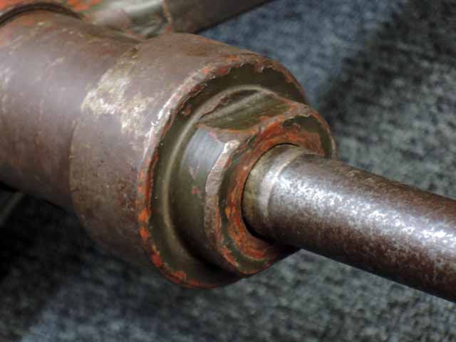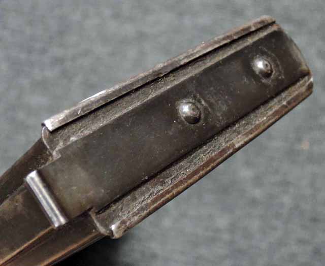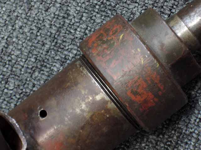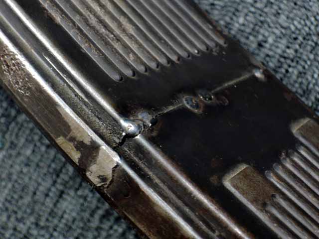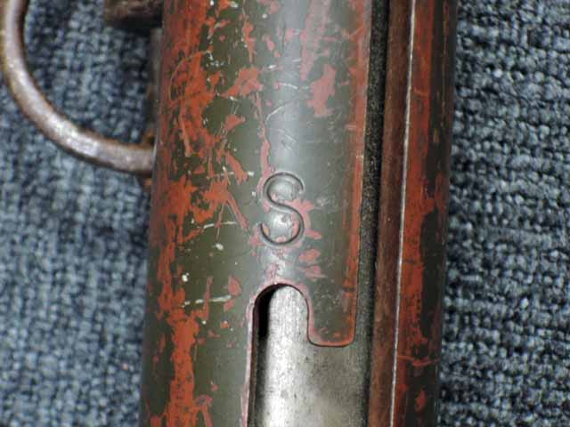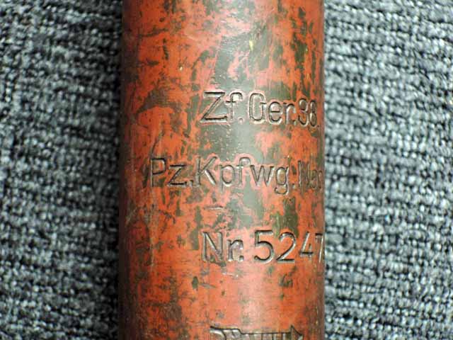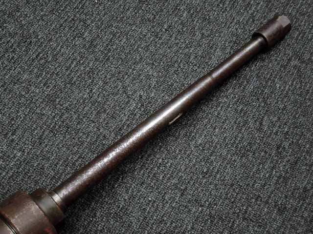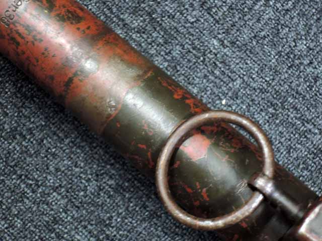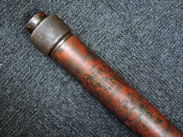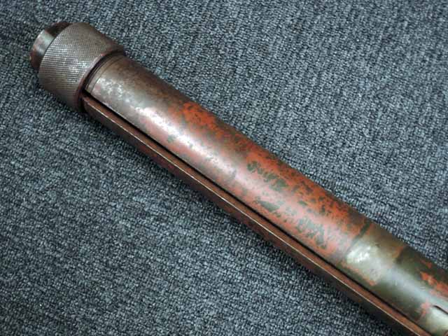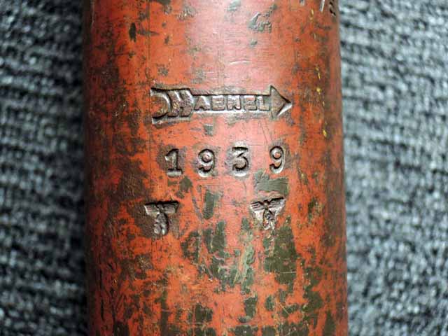 本品は通常のドイツ軍小火器に見られるようなブルーイングではなく、赤の錆止めの上にダークグリーンの塗装が施されています。 ダーク・グリーンの塗膜は大部分が失われており、全体的に赤の錆止めが露出していますが、本品の希少性とオリジナルの状態が残っている事を鑑みれば、非常に価値のあるものと言えます。 その他表面錆も散見されますが状態は安定しており、劣化が進行している様子は有りません。 本体後部に「ZfGer.38.」の刻印が見られ、続けて「Pz.Kpfwg.Nachb.」(Panzerkampfwagen-Nachbildung) が打刻されており、本品が戦車型の標的に搭載されたZf.38Pzである事が判ります。 またシリアル5247と生産年を示す1939の刻印からかなり後期の生産品である事も窺えます。 その他矢型のハーネル社の刻印やアムト印が散見され、マガジン・ハウジングにはアルファベットのような引っかき跡が見られます。 マガジンはM13のマガジン2つを溶接固定したものが付属し、マガジン・リップ側に朽ち込みの跡が散見されます。 とはいえフォロアーの動きはスムーズで、しっかりとしたテンションが残っています。 マガジンを取り付けた際前後に大きな遊びがありますが、ロック自体はかかっておりキャッチを操作しない限り脱落しません。 ZF ゲレート 38用とされるマガジンとは若干形状が異なるため、戦中/戦後に応急的に製作された可能性があります。