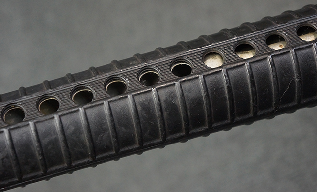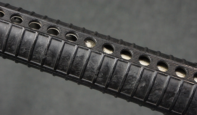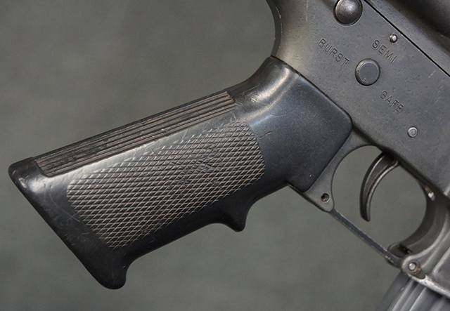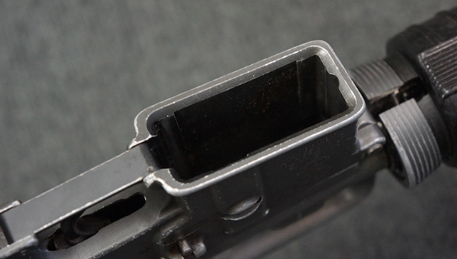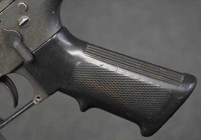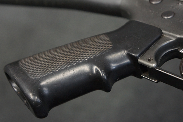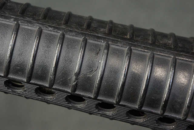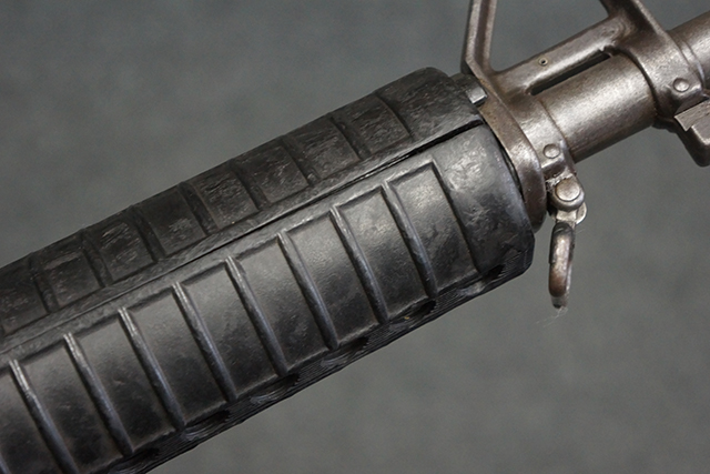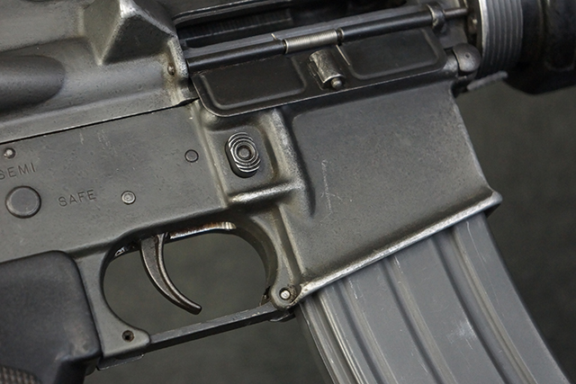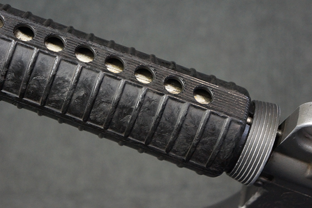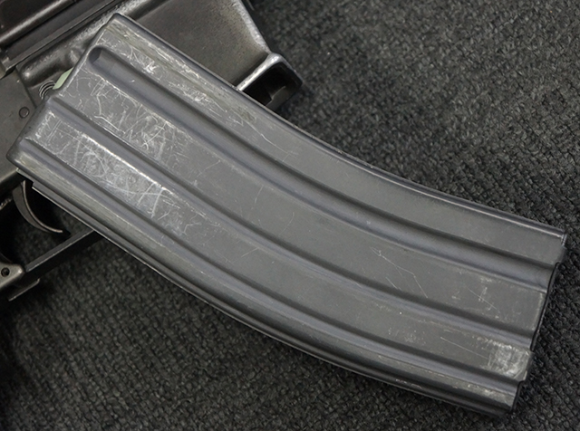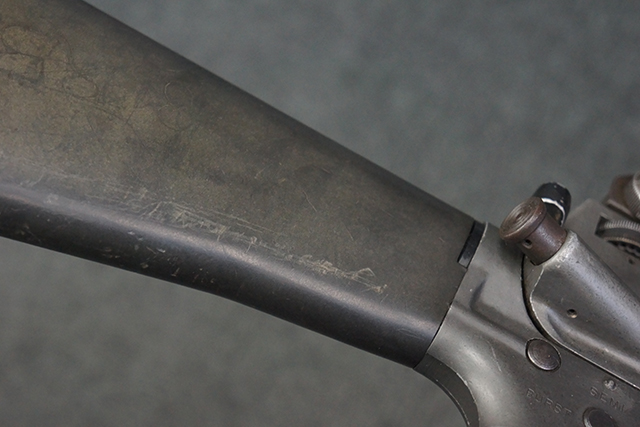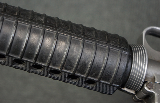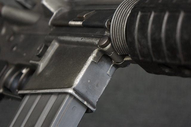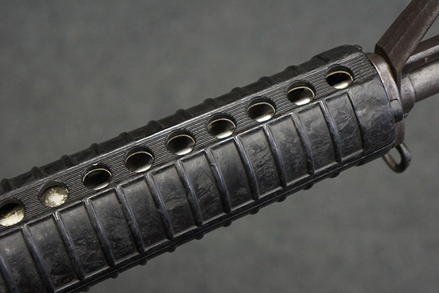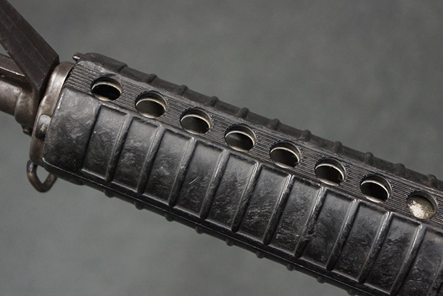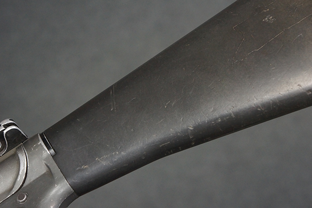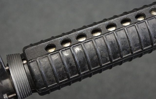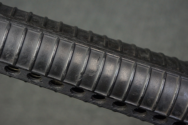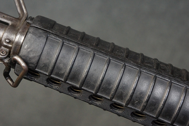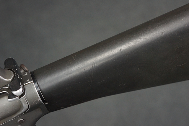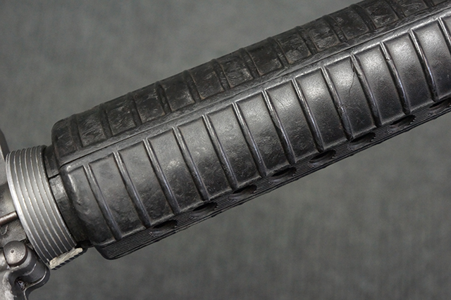 本品は全体にやや使用感が見受けられ、金属部には小傷の他、角の部分を中心に表面仕上げが落ちてアルミの地肌が表れていますが、全体的には仕上げが残っております。 ロア・レシーバーに比べアッパー・レシーバーの仕上げはやや明るい印象ですが、大きな違和感は感じられません。 樹脂製のハンドガードやストックについても全体的に小傷や擦れ等の使用感が見られ、ロア・ハンド・ガード左側面の一部にクラックが見受けられますが、その他目立った破損などは見られず、比較的しっかりとした状態が保たれています。 樹脂製のグリップについても目立った破損は見られませんが、左側面にやや摩耗が見受けられ、チェッカリングが全体的にやや薄くなっています。