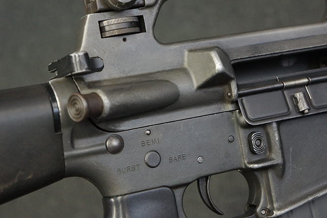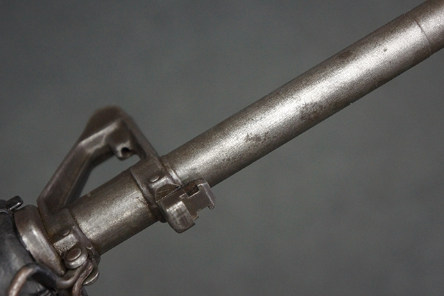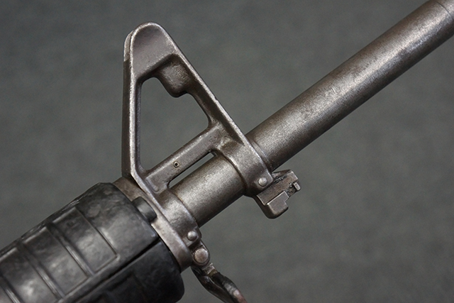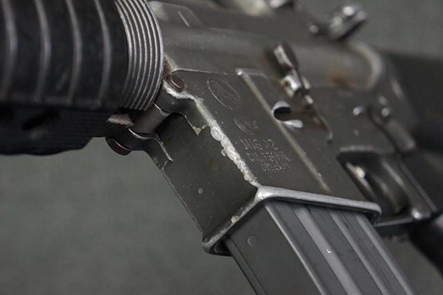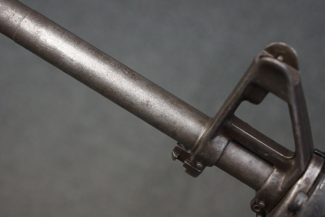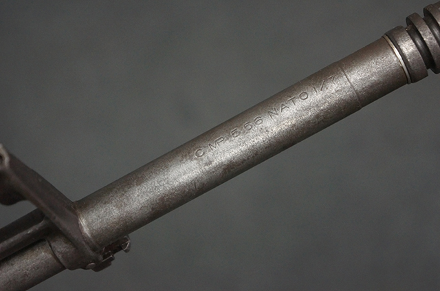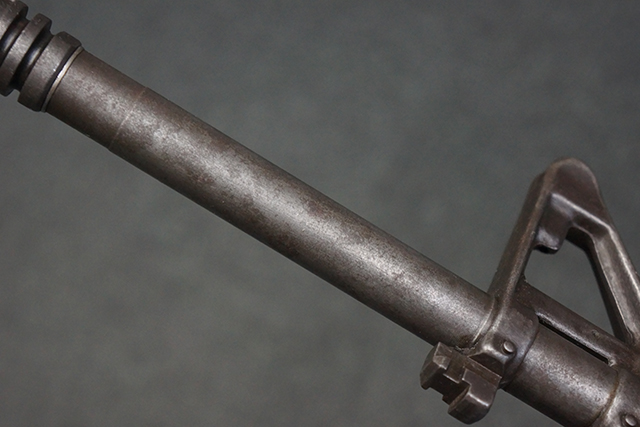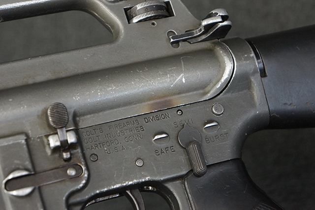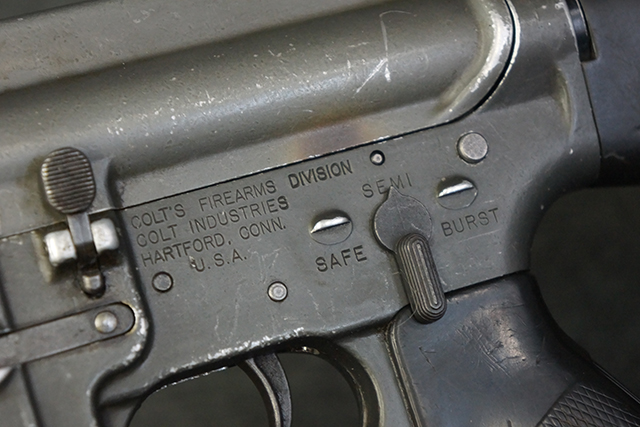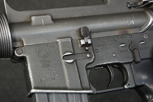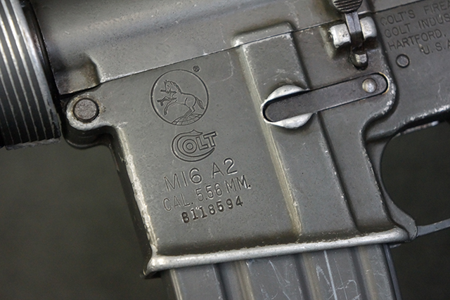 本品は軍用のM16A2モデルで、レシーバー左側面にはM16A2のモデル名の他、口径表示及びシリアルNo.が打たれています。 また、セレクター前方のレシーバー側面には「COLT'S FIREARMS DIVISION COLT INDUSTRIES HARTFORD, CONN. U.S.A.」のメーカー刻印が打刻されています。 セレクター表示はM16A2らしく「SAFE-SEMI-BURST」となっています。 銃身には「C MP 5.56 NATO 1/7」の刻印が入っています。 最初の「C」はコルト社製造を示し次の「MP」は強度テスト合格を示すプルーフマーク、「5.56 NATO」は使用弾薬 (SS109 ※米軍ではM855と呼称) を表し、1/7はライフリング・ツイストが1回転7インチ (A1は12インチ) である事を示しています。