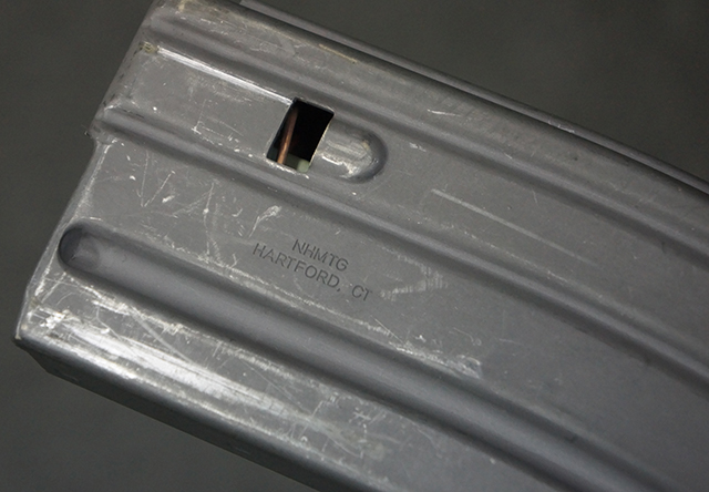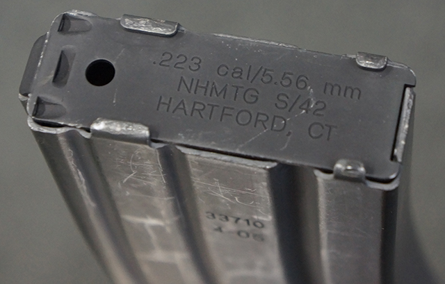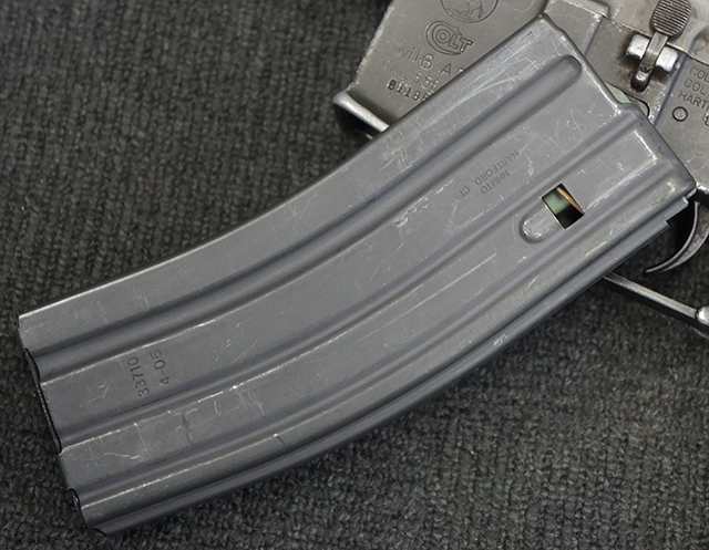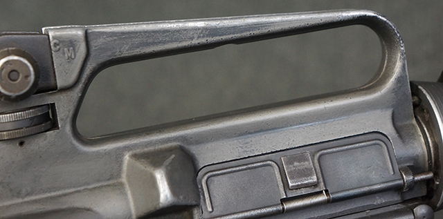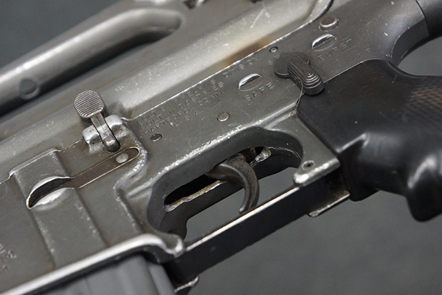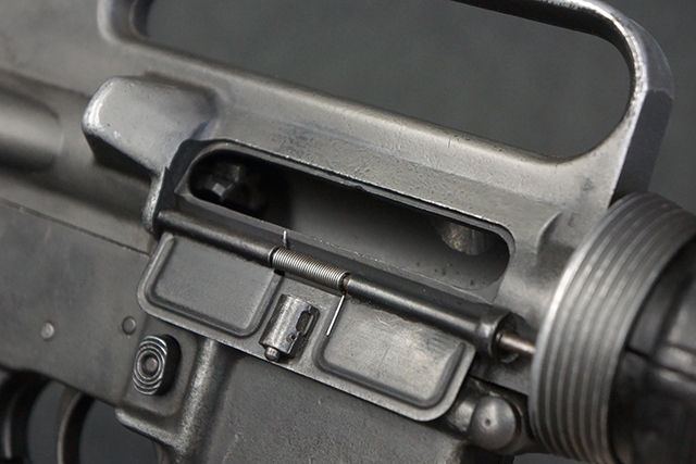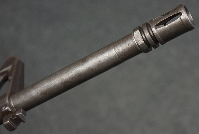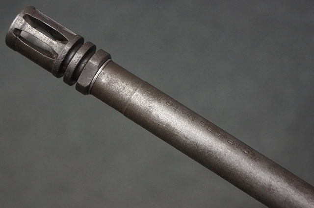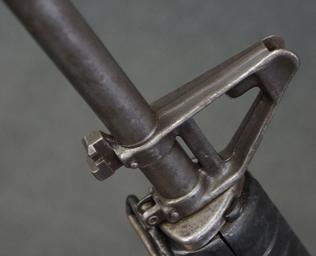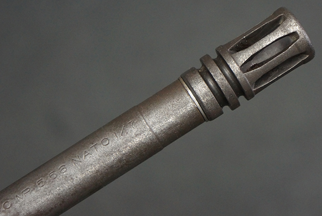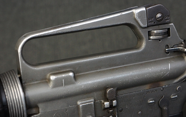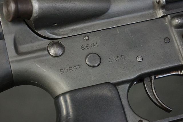 本品は軍用のM16A2モデルで、レシーバー左側面にはM16A2のモデル名の他、口径表示及びシリアルNo.が打たれています。 また、セレクター前方のレシーバー側面には「COLT'S FIREARMS DIVISION COLT INDUSTRIES HARTFORD, CONN. U.S.A.」のメーカー刻印が打刻されています。 セレクター表示はM16A2らしく「SAFE-SEMI-BURST」となっています。 銃身には「C MP 5.56 NATO 1/7」の刻印が入っています。 最初の「C」はコルト社製造を示し次の「MP」は強度テスト合格を示すプルーフマーク、「5.56 NATO」は使用弾薬 (SS109 ※米軍ではM855と呼称) を表し、1/7はライフリング・ツイストが1回転7インチ (A1は12インチ) である事を示しています。