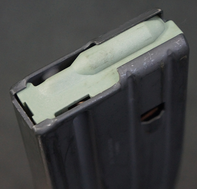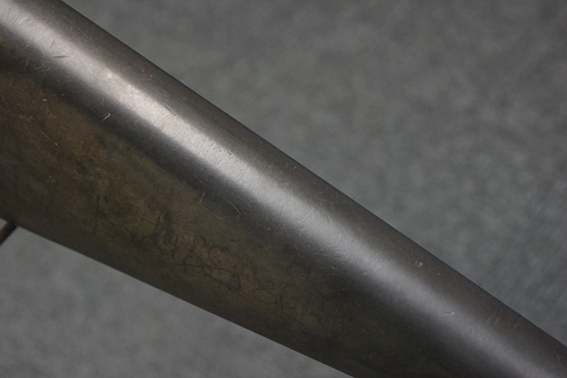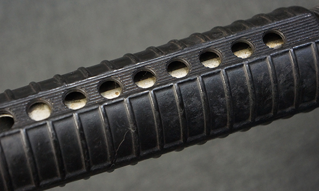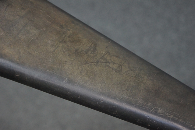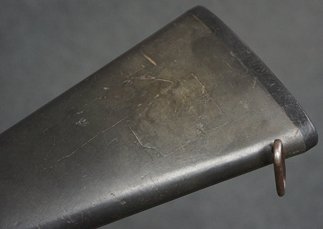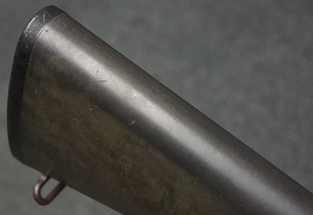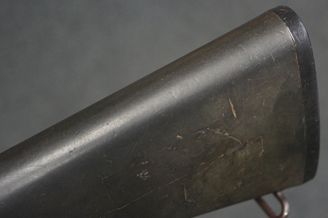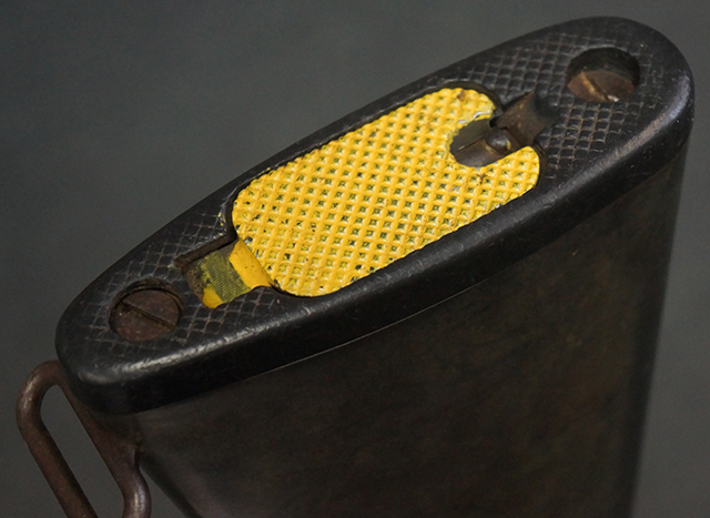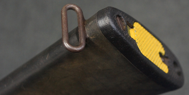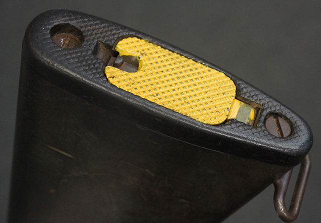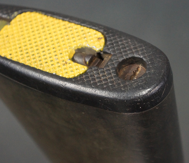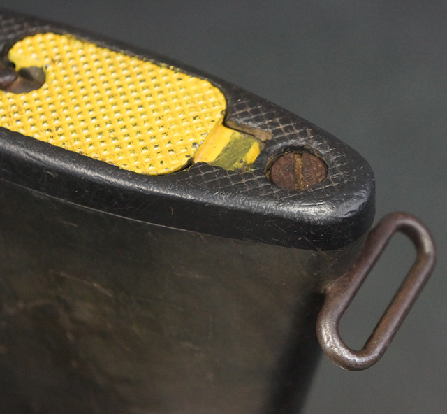 バット・プレート部のコンパートメントの蓋は黄色にペイントされています。 樹脂部分の滑り止めの溝は摩耗により外周にかけて一部消えている箇所もございますが、割れや欠けは見られず、強度的にしっかりとした状態が保たれています。 前後のスリング・スイベルには若干の表面錆が見られ、フロントのスリング・スイベルにコーティングの剥落が見られます。