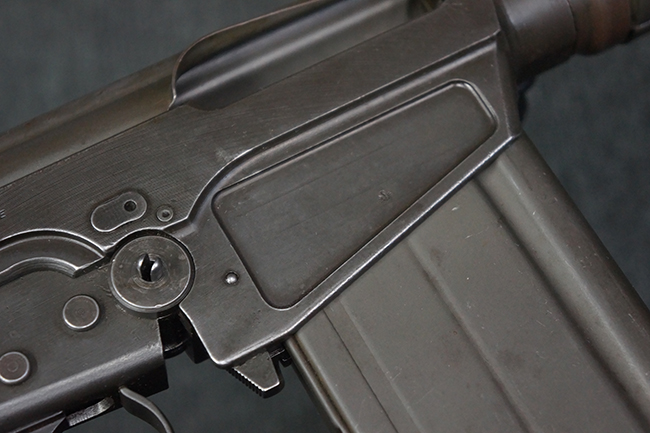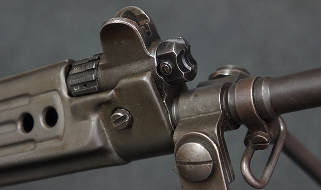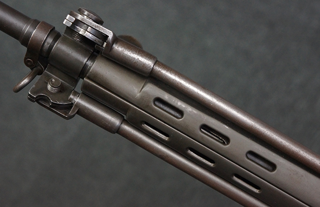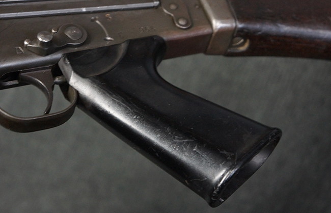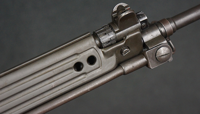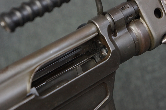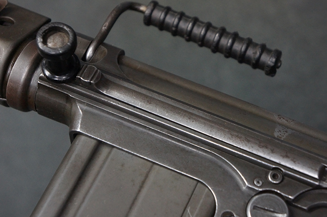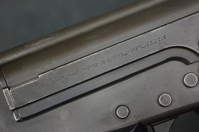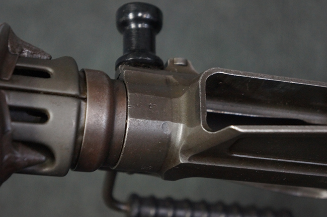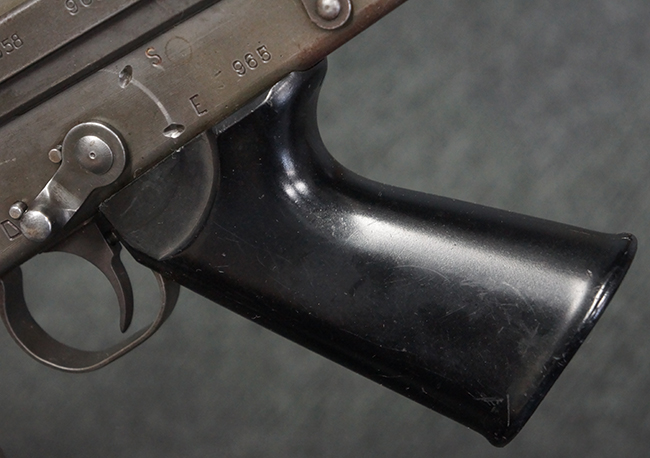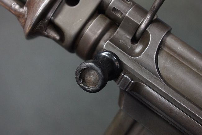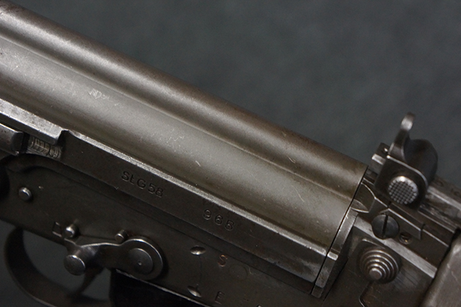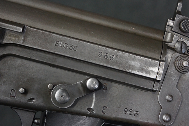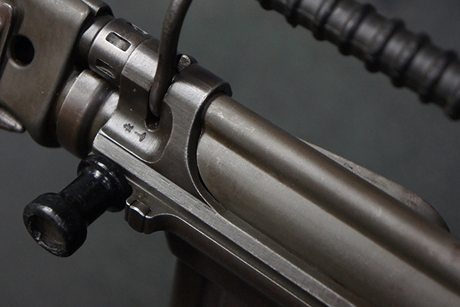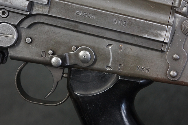 本品はアッパー・レシーバー右側面にはFN社を示す「FABRIQUE NATIONALE D'ARMES DE GUERRE HERSTAL BELGIQUE」のメーカー刻印が入っている事から、初期にベルギー FN社で生産されたStG.58 自動小銃である事が判ります。 本品のバット・ストックは木製で、セレクターは「S-E-D」のドイツ語表記となっています。 シリアルNo.は、アッパー/ロア・レシーバー及びボルト・キャリアでマッチしています。