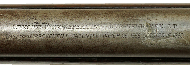本品は米国ウィンチェスター社製のオリジナル品です。 ロア・タング根元辺りにシリアルNo.105972が打たれている他、機関部に右側面に「*」の刻印、薬室上部に「J」の刻印が見受けられます。 また105972というシリアルナンバーから、3rd Modelとしては後期の生産である事が判ります。 リア・サイトの前には、一部判読しづらい箇所もありますが「WINCHESTER'S-RPEATING-ARMS-NEWHAVEN.CT. KING'S-IMPROVEMENT-PATENTED-MARCH 29.1866 OCTOBER16.1860」と打刻されています。 約160年前に製造された珍しいモデルである事を考えると本品の程度は充分に良いものです。 銃身、マガジン・チューブを始め鉄製の部品は地金っぽくなっており、表面錆の跡が散見されるものの、適度な光沢を残しており状態は安定しています。 併せて多少の小傷は見受けられますが大きなダメージは見られません。 砲金製フレームも同様に小傷こそありますが、ゆがみもなく経年による変色も大きくありません。 経年を感じさせる落ち着いた雰囲気です。 バット・プレートも同様のコンディションで、コンパートメントの蓋はスムーズに開閉できます。
