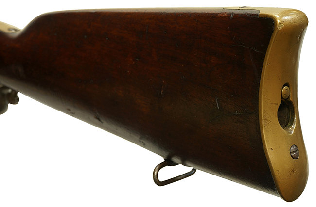 幕末に日本にもイエローボーイは少数が輸入されましたが、このマスケット・モデルは輸入された記録はありません。 日本語では「直動鎖閂式(ささんしき)銃」と呼び、同じレバー・アクション式の「底碪式(ていがんしき)銃」と混同されやすいが、遊底(ボルト)が(回転することなく)前後するので「直動鎖閂式」になり、ブリーチが上下する「底碪式」とは構造的には全く異なるものです。 (MM)