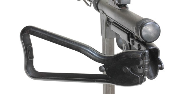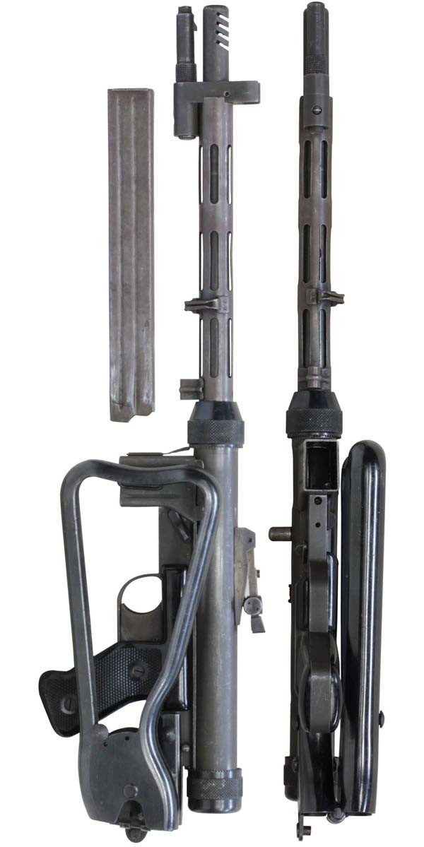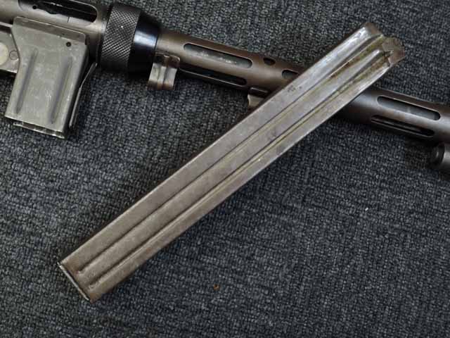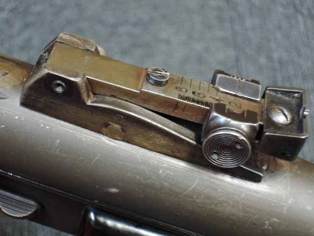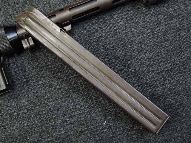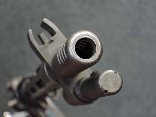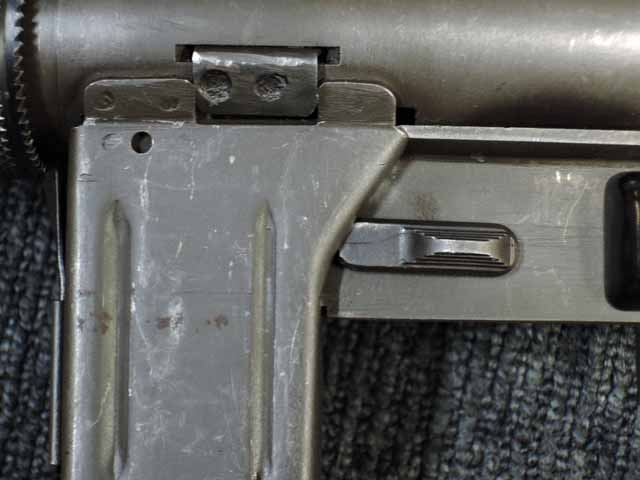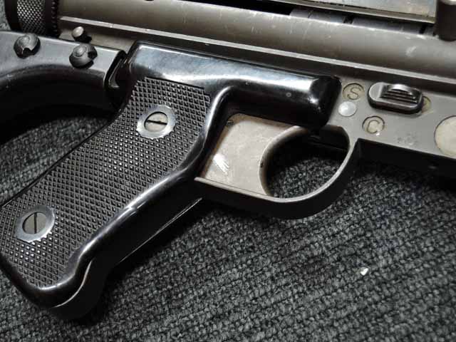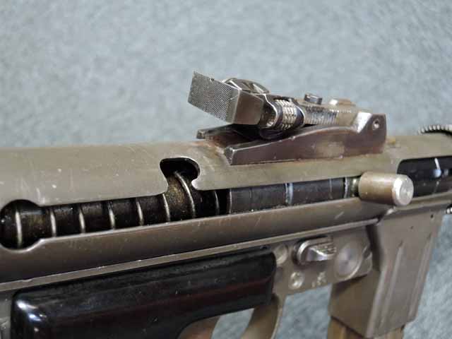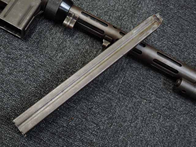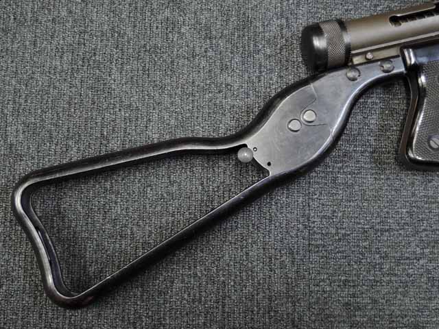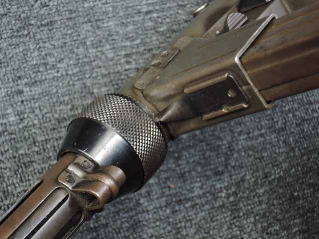 全体に小傷が散見され、バレル・ジャケットがやや赤っぽく退色していますが、表面処理自体はしっかりと残っており、特に機関部はオリジナルの雰囲気を良く残しています。 ブルー仕上げのストックも同様に小傷はありますが、ブルーイングが鮮やかに残っており、ストックの開閉もスムーズでがたつきはありません。 樹脂製のグリップ・パネルはやはり小傷こそあるものの、割れや欠けはみられず完全です。 マガジンは取り付けた際に若干の遊びが見られますが、しっかりと保持されており脱落する心配はまずありません。 セレクターはしっかりとしたクリック感があり、各ポジションでトリガーの引きが変わります。 エキストラクターが除去されており、リア・サイトは実銃用の代用品と思われますが、外観上の違和感はあまりありません。 特徴的な取り外し収納式スパイク銃剣については基部で切断されており、剣先は付属致しません。