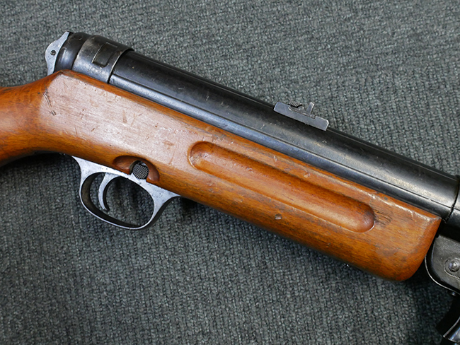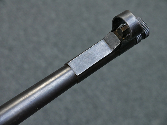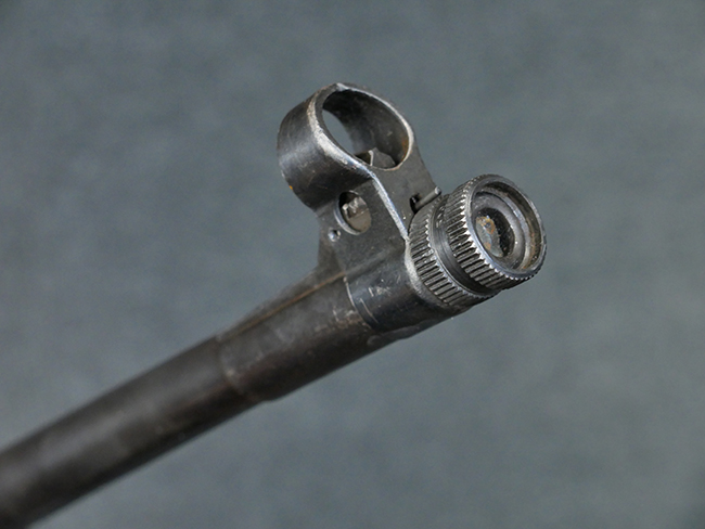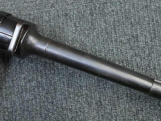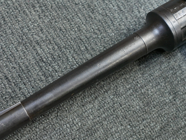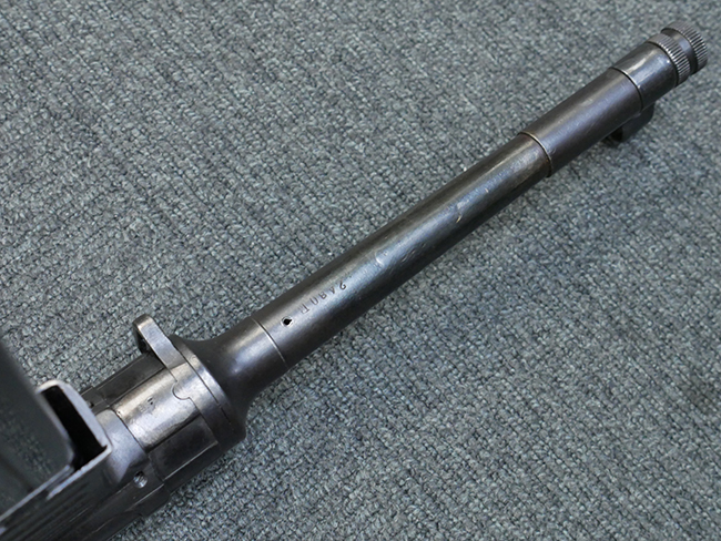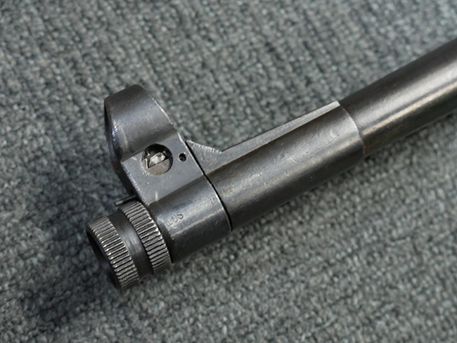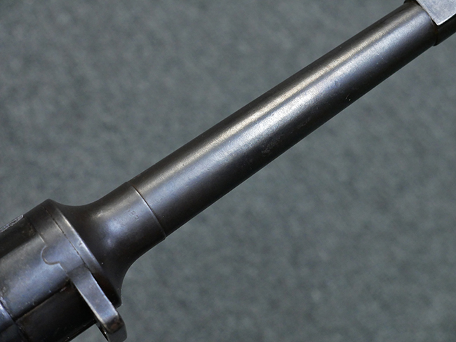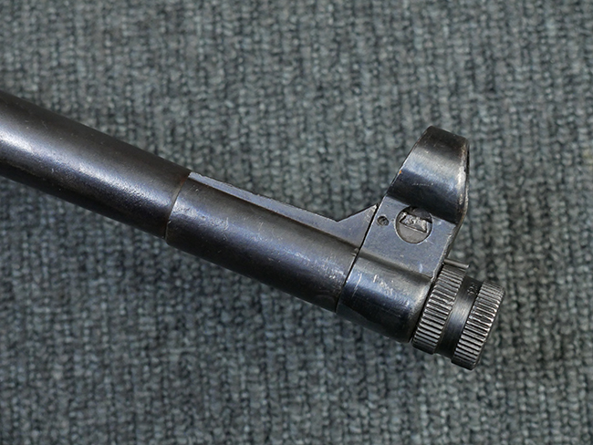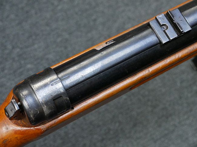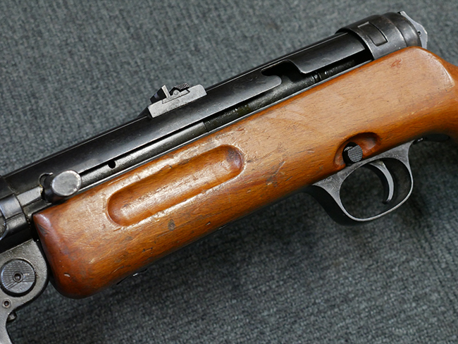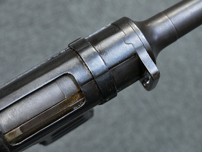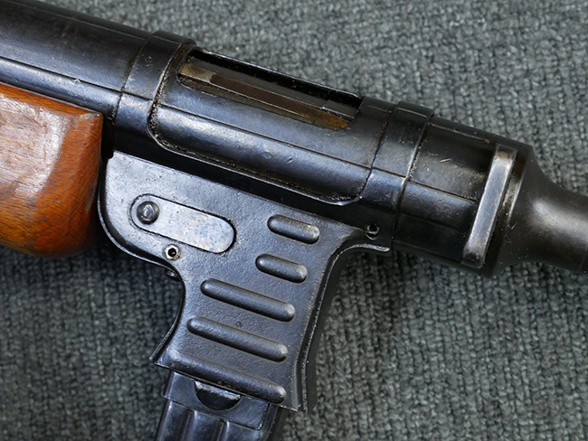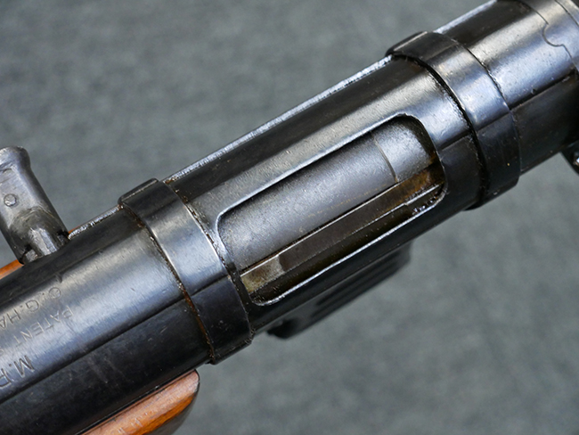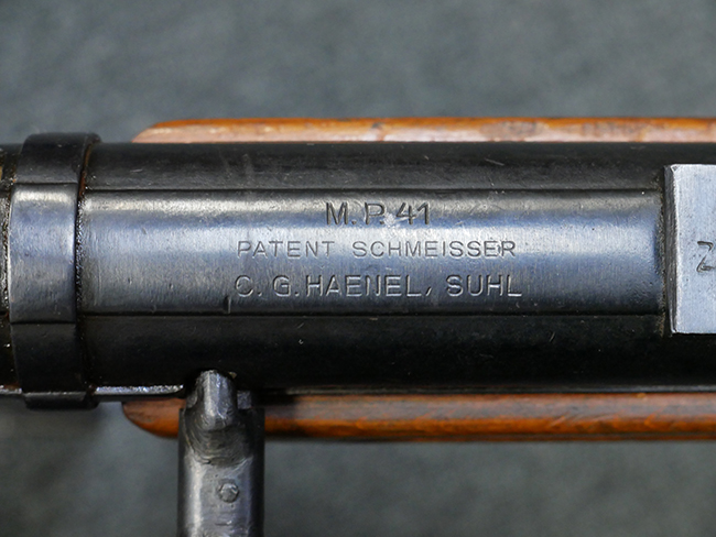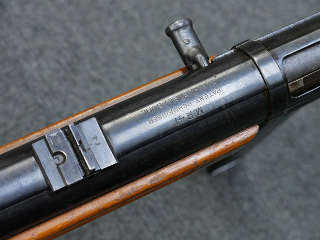本品のレシーバー上面には「MP41 PATENT SCHMEISSER C.G.HANEL, SUHL」のパテント刻印がはっきりと入っています。 金属部分については若干の擦れや小傷は見受けられるものの、全体にオリジナルの表面仕上げが残っており、良好な状態が保たれています。 レシーバー・エンド・キャップや前部スリング取り付け金具の角等にやや表面仕上げが落ちて金属の地肌が表れている箇所が見受けられるものの、目立った表面錆等は見られません。
