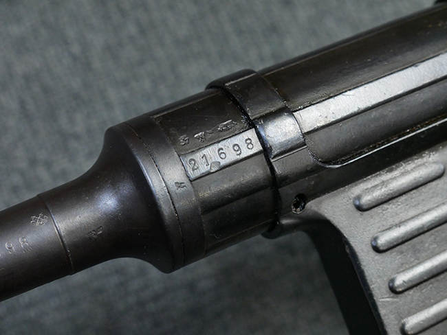 この他、MP40からMP41への大きな変更点として、銃身のレシーバーへの取り付け方法の変更が挙げられます。 MP40ではバレル・ナットを使用して銃身をレシーバーに固定していましたが、MP41ではバレル・ナットを使用せずに銃身を薬室に挿入し、薬室側から六角形のブロックにより銃身をネジ留めした上で、本体側面から六角ブロックをピンで固定する方式に変更されました。 尚、ヒューゴ・シュマイザーはこの銃身の取り付け方法に関する特許を取得しており、MP41本体にもそのパテント刻印が打刻されています。 また、連合国がMP40をシュマイザーによる設計と勘違いをしてシュマイザーと呼称していたきっかけとして、本銃のシュマイザー・パテント刻印を読んだ為とも言われています。