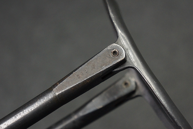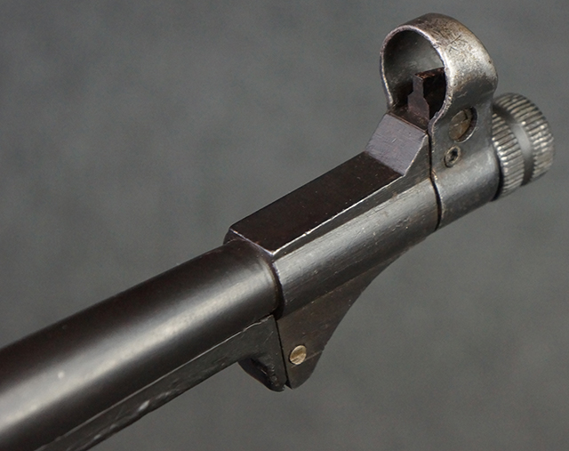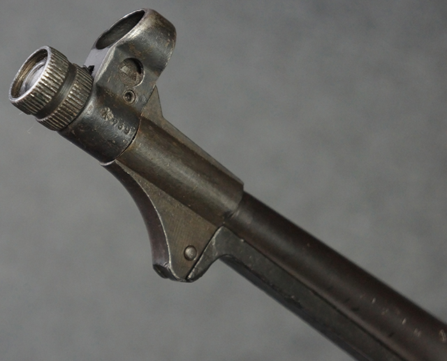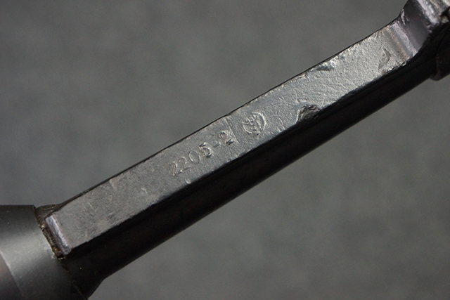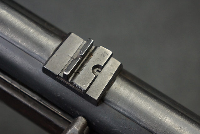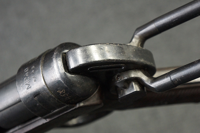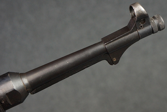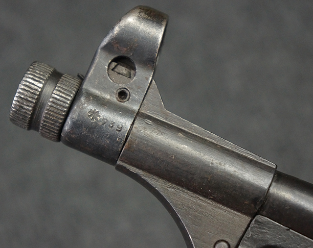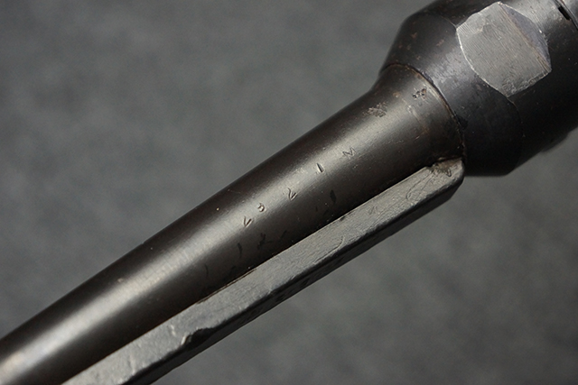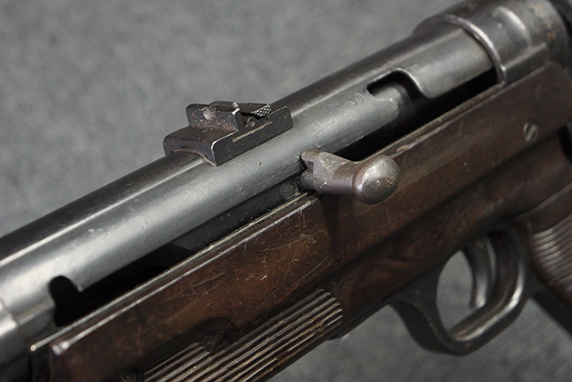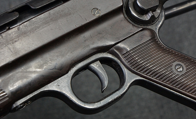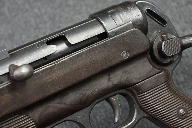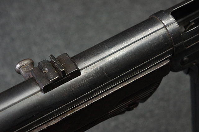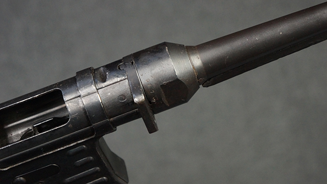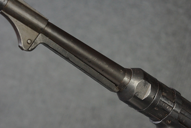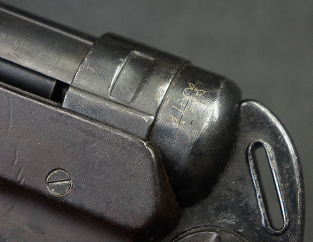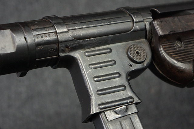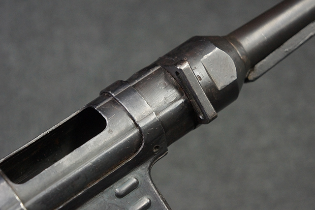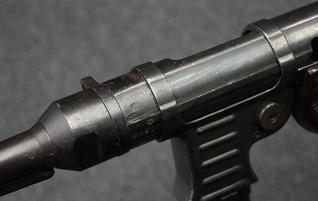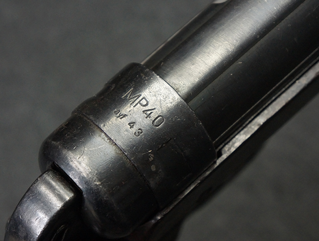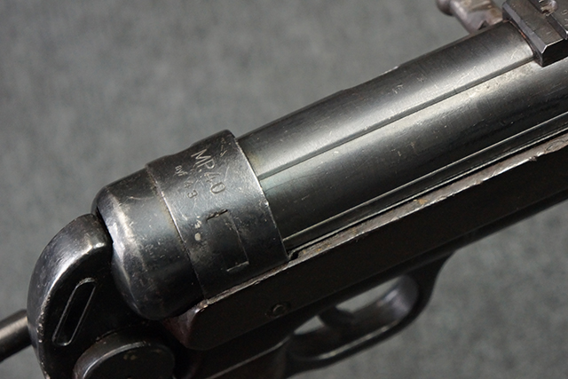 本品のレシーバー・エンド・キャップ上面には1943年エルマ社製を示す「MP40 ayf 43」の刻印が入っています。 各部のシリアルNo.はアッパー・レシーバー、銃身が2927、バレル・ナットとリア・サイトで927と一致しています。 ロア・レシーバーのシリアルNo.は2458で、他のシリアルNo.は各パーツ毎に異なっています。 マズル・リングは後期型の中央に溝のあるH型の物が、バレル・レストは樹脂製、バレル・ナットは平面部分が2箇所のみの型がそれぞれ装着されています。 マガジン・ハウジングは1941年以降のモデルに見られる、両側面に5本の強化リブが追加されているタイプとなっています。 コッキング・ハンドルは1942年半ば以降に本格的に導入された、ボルト・セーフティ機能を備えた2ピース・タイプが装着されています。 本体各部にはヴァッフェン・アムト刻印が打刻されていますが、アッパー・レシーバー、バレル・ナット、銃身のアムト刻印は点状の刻印により上から打ち消されています。