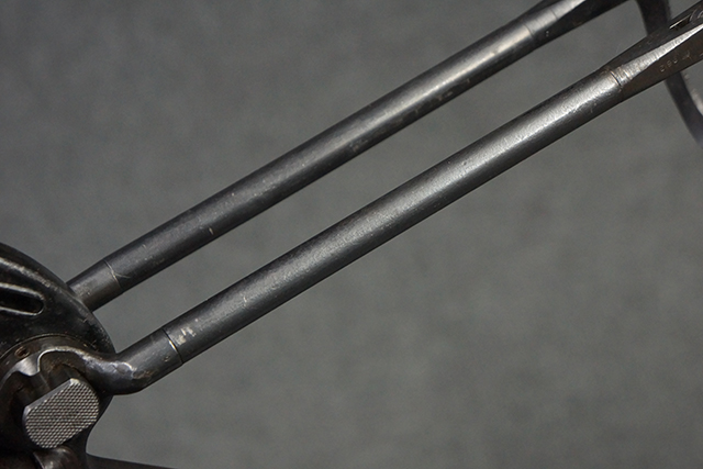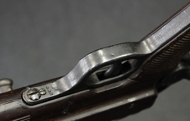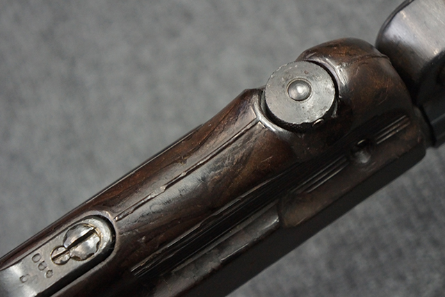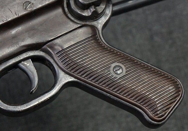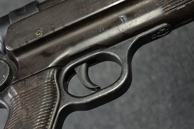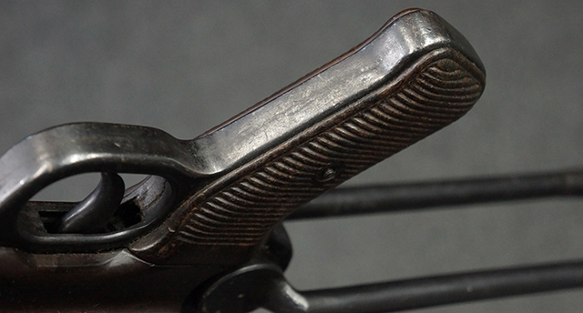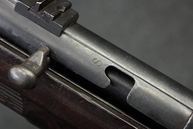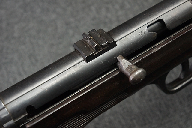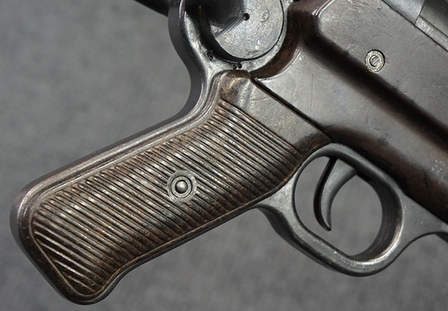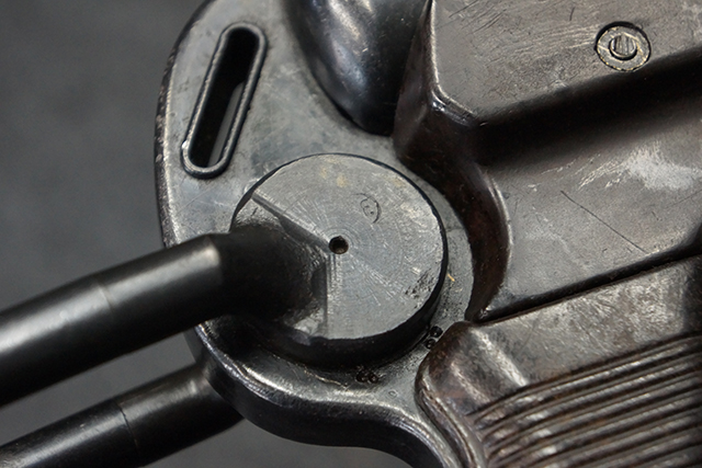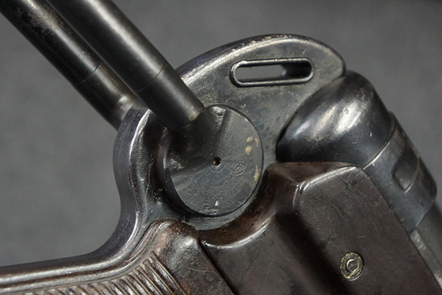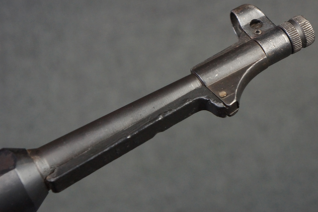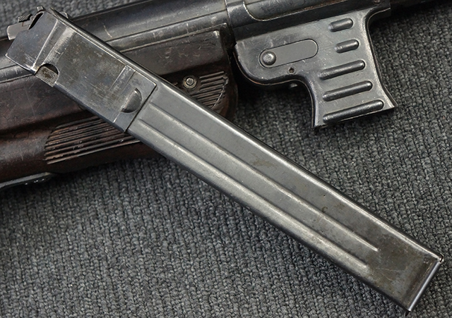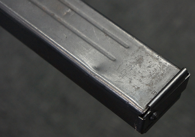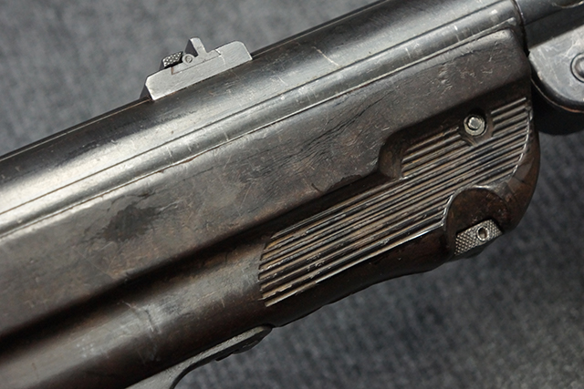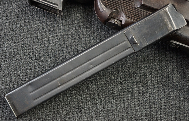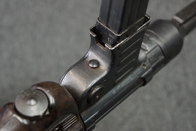 金属部は多くの部分に黒染め処理が残されており、擦れや小傷、若干の表面錆は見受けられますが、全体としては大きな欠損等は見られず、概ねしっかりとした状態が保たれています。 ベークライト部についても、全体的に擦り傷、小傷が見られる程度で、目立つ欠損はありません。 グリップ・パネルについても左右ともに色合いはほぼマッチしており、取り付けにもガタつき等は見られません。 折り畳みストックの展開収納についても問題なく、展開時の遊びも十分許容レベルです。 マガジン装着時にやや前後に遊びがございますが、本体への固定自体はしっかりとしています。 付属のマガジンは「98E 41」刻印が確認出来、こちらもやや小傷や擦れ、若干のアタリは見られますが、大きな変形等は見られず、比較的しっかりとした状態が保たれています。 尚、マガジン・スプリングは入っています。