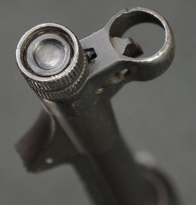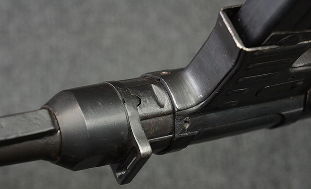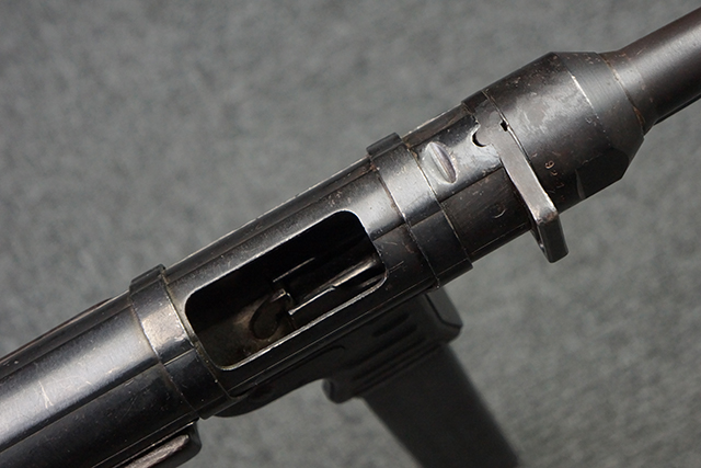 1943~1944年頃にステアー社で製造されたMP40短機関銃の最終型では、レシーバー・エンド・キャップとロア・レシーバーをプレスにより一体成型しているのが特徴です。 このタイプでは、プレスにより鋼板を折り込む方法でロア・レシーバー全体を成形しており、エンド・キャップ上面からロア・レシーバーの外縁部にかけて補強板のように見える板状の継ぎ目が見られます。 バレル・レストは1943年にエルマ社で製造されたタイプと同様にプレス製となっています。