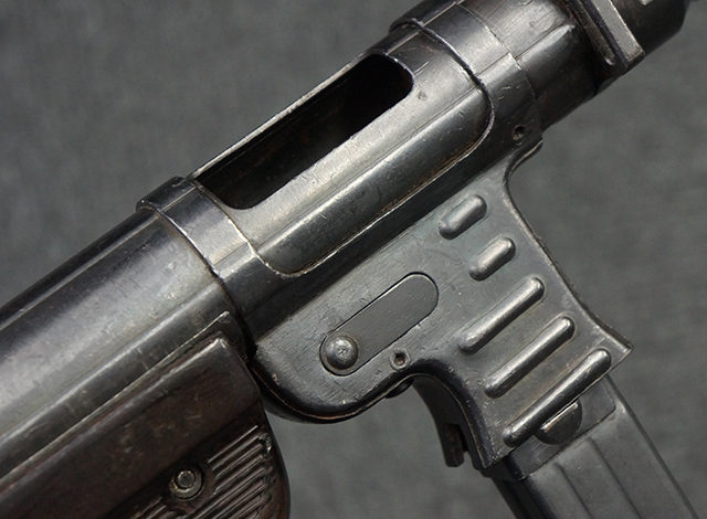 MP40のバリエーションの内、1941~1942年頃にエルマ社、ステアー社、ハーネル社で製造されたタイプは、マガジン・ハウジングの両側面に5本の強化リブが追加されているのが特徴で、これ以降に製造されたタイプでは全てマガジン・ハウジング表面にリブが追加されるようになりました。 グリップ・フレームは初期型と同様に前後二分割でプレス成型したものを溶接で組み合わせて製造されています。コッキング・ハンドルについては、1942年6月以降フォワード・ロック・セーフティ機能を備えたタイプの生産が本格的に開始された為、セーフティ機能付きのコッキング・ハンドルが付いた個体と初期型のフック型コッキング・ハンドルが付いた個体の両方が存在します。