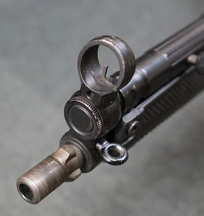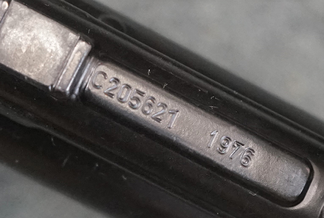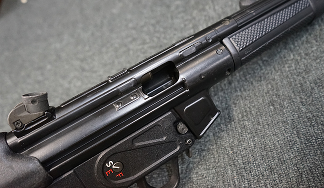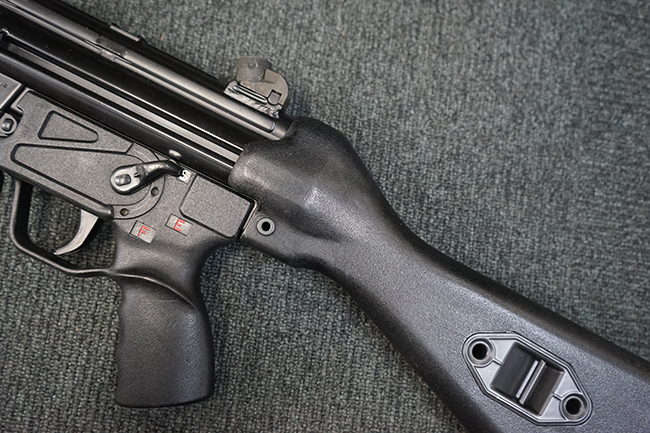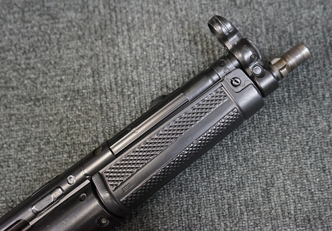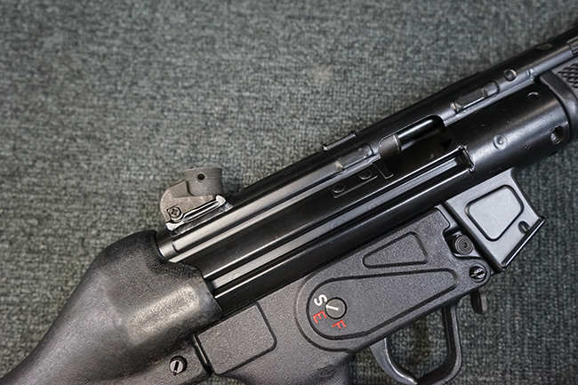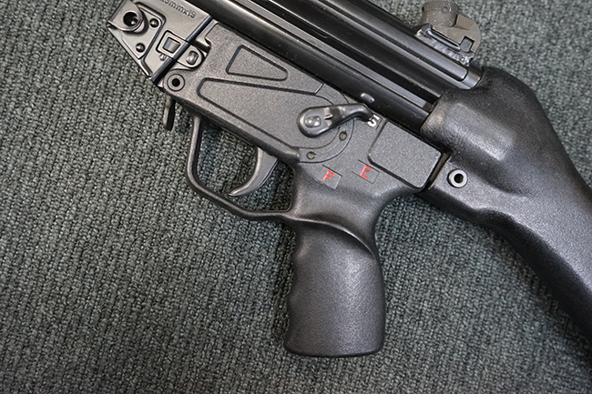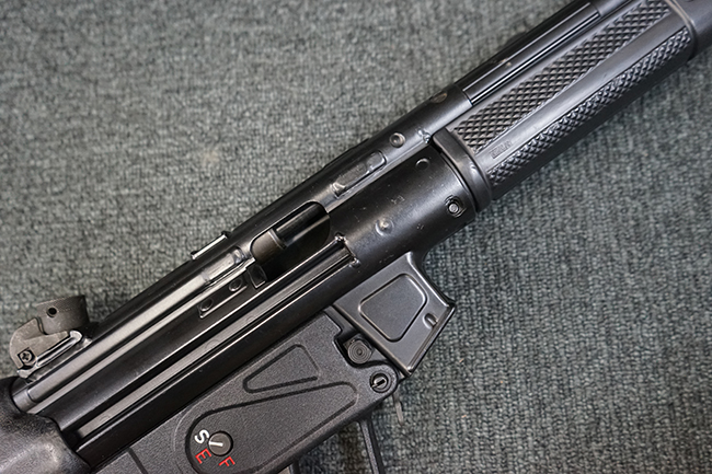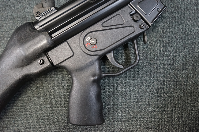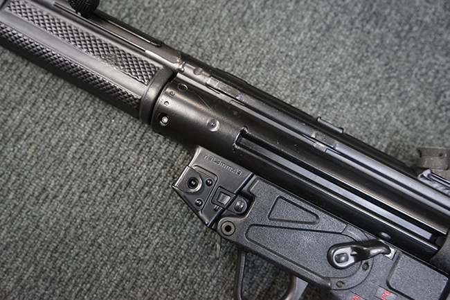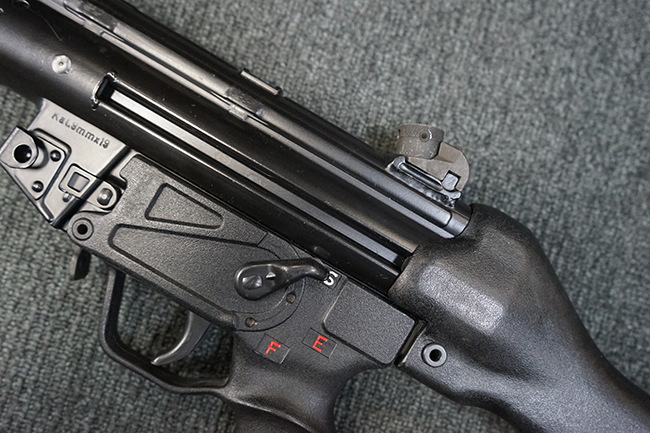 本品は固定ストックとセミ/フル・オートマチック射撃用のトリガー・ハウジングを備えたMP5A2短機関銃です。 本品のレシーバー上面には、シリアルNo.に加えて「HK MP5」のモデル名及び製造年を示す「1976」の刻印が入っています。 マガジン・ハウジング左側面の口径表示は「Kal.9mm×19」のドイツ語表記となっています。 トリガー・ハウジングはセレクターが「S-E-F」のアルファベット表示で、グリップ前部にフィンガー・チャンネルの有るタイプとなっています。