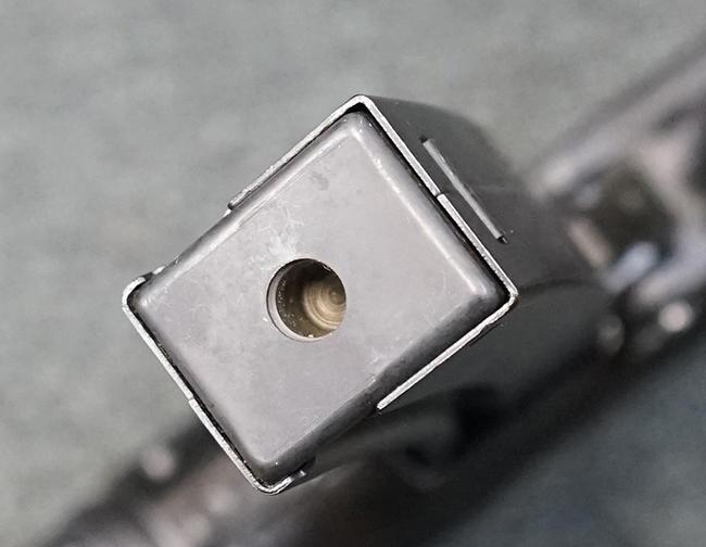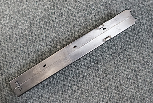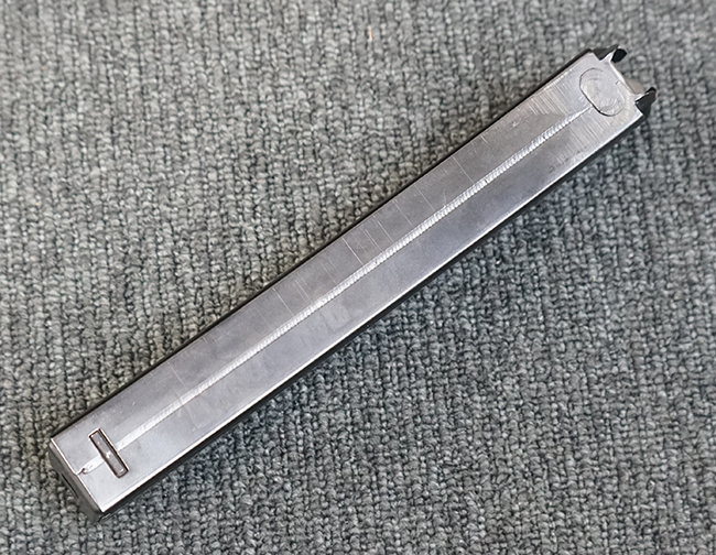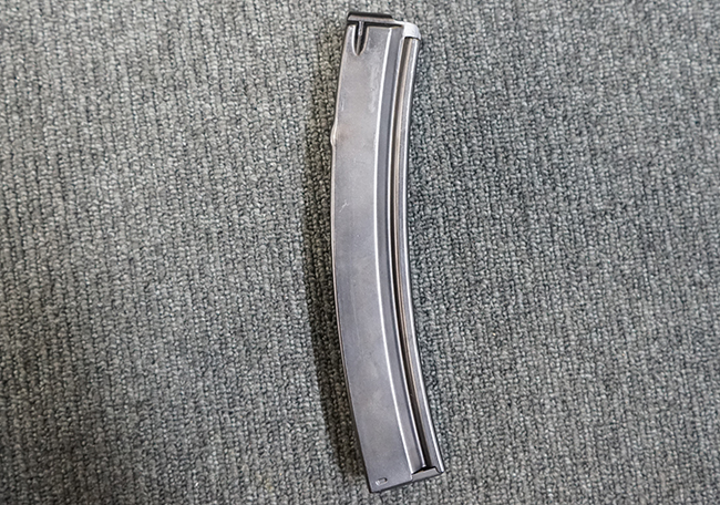 マガジンの着脱やリア・サイトの調整については問題なく行う事が可能です。 マガジンは装着時のがたつきも最小限です。 セレクター・レバーはE (単発) とF (連射) の各ポジションでトリガーの引きしろが変化しますが、安全位置でトリガーはロックされません。 付属の30連バナナ・マガジンには「9mm×19」の刻印が入っており、本体への装着に伴う擦れこそ見られるものの、目立った凹みや変形等は見られず、概ね良好な状態が保たれています。 尚、マガジン・スプリングは入っています。