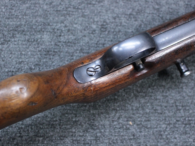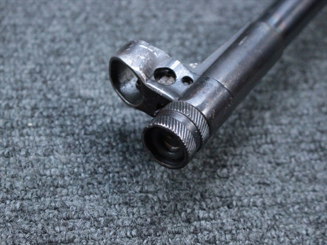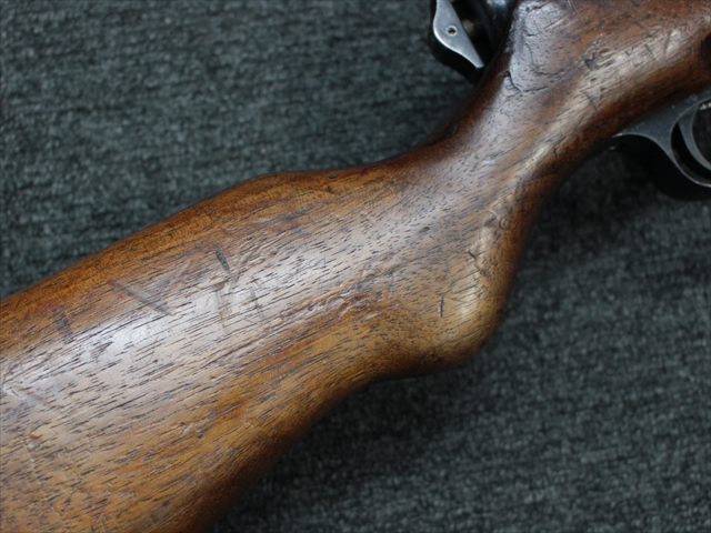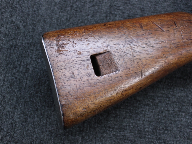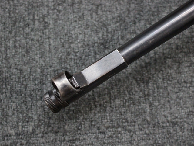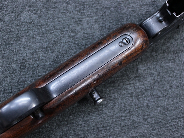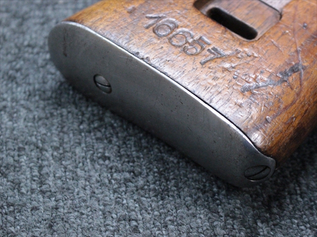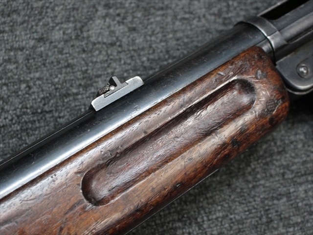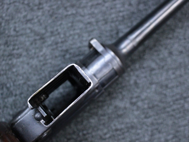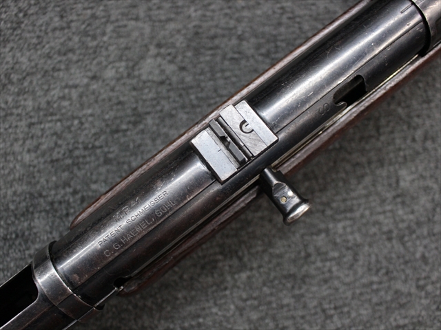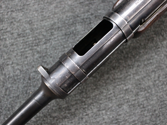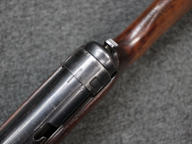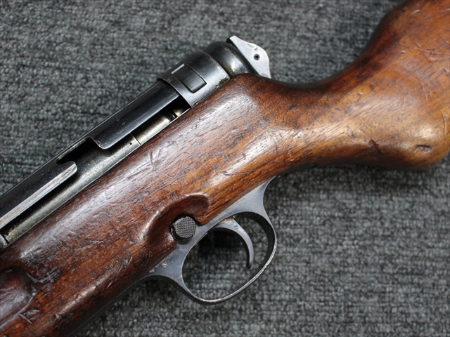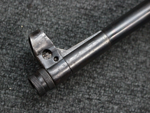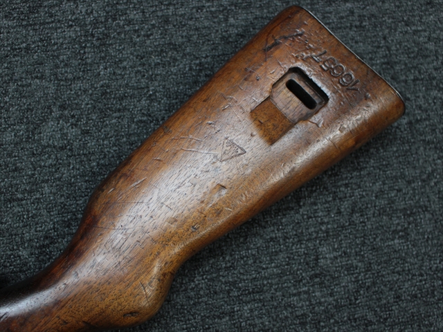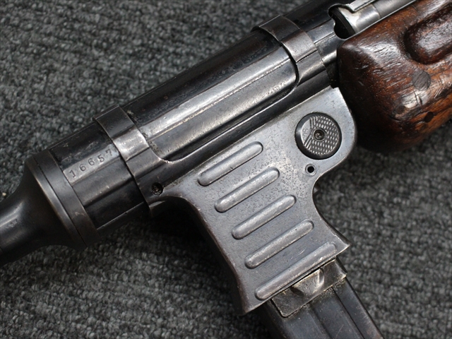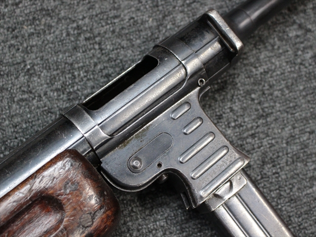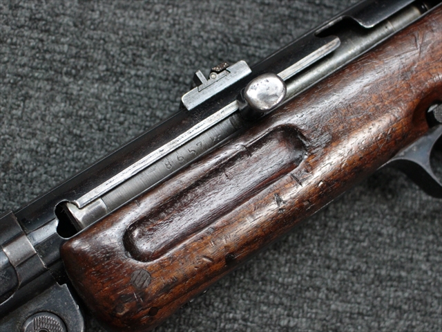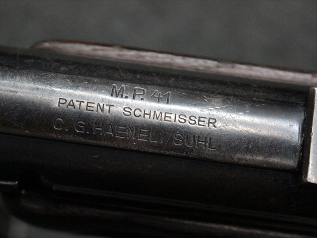 本品の金属部は時代なりに各所にスレや地金がでている部分が散見されますが、ブルーイングが残っている部分も多く、またそのブルーも美しい状態を保っています。 リア・サイトの前には「MP41 PATENT SCHMEISSER C.G.HANEL, SUHL」と刻印されています。銃身下部にも前後に渡って長く補修跡がありますが、綺麗に仕上げられている上に下面ということもあり、非常に目立ちにくくなっています。