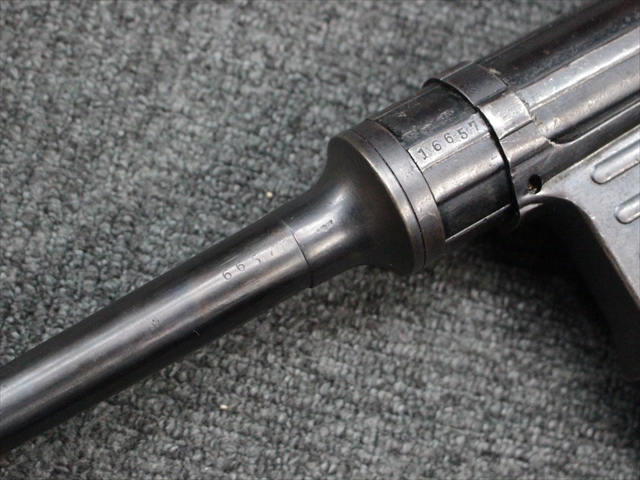 この他、MP40からMP41への大きな変更点として、銃身のレシーバーへの取り付け方法の変更が挙げられます。 MP40ではバレル・ナットを使用して銃身をレシーバーに固定していましたが、MP41ではバレル・ナットを使用せずに銃身を薬室に挿入し、薬室側から六角形のブロックにより銃身をネジ留めした上で、本体側面から六角ブロックをピンで固定する方式に変更されました。 尚、ヒューゴ・シュマイザーはこの銃身の取り付け方法に関する特許を取得しており、MP41本体にもそのパテント刻印が打刻されています。 また、連合国がMP40をシュマイザーによる設計と勘違いをしてシュマイザーと呼称していたきっかけとして、本銃のシュマイザー・パテント刻印を読んだ為とも言われています。
