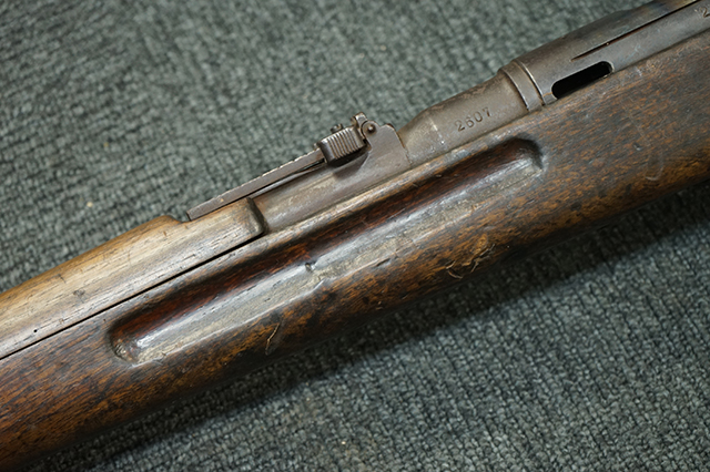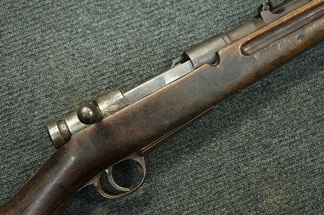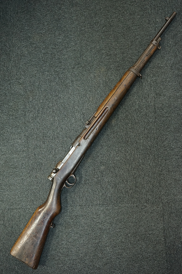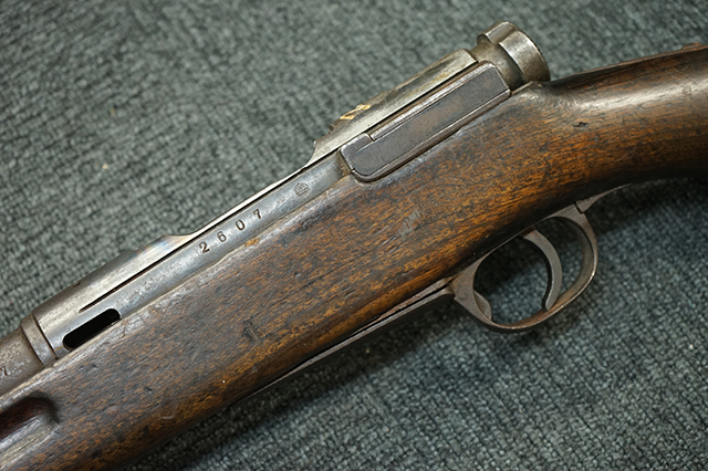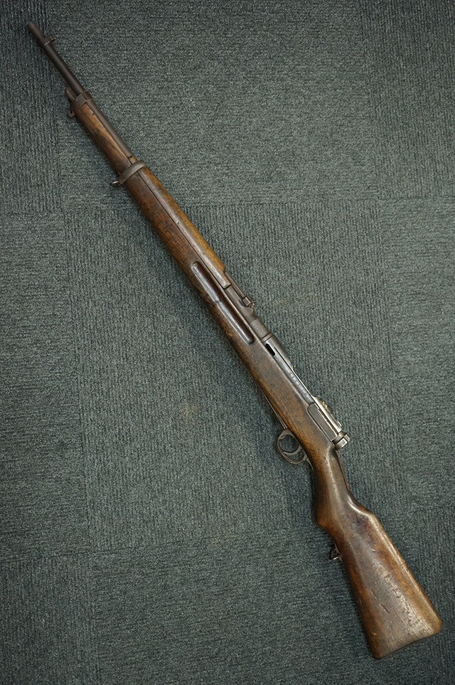 第二次世界大戦中に中国軍 (国民政府軍) が三八式系小銃を基にコピー生産した短小銃で、薬室の上面はに漢字の縦書きで「辛巳式」の刻印が入っています。 全長は三八式歩兵銃より短く三八式騎兵銃よりも長い、短小銃と呼ばれる長さとなっており、表尺 (リア・サイト) も2,000mまでの歩兵銃と騎兵銃の中間的なものです。 フロント・バンドはモーゼルGew.98系小銃と同様のスリング用フックを備えており、着剣装置も三八式系とは異なるデザインとなっているため、三十年式銃剣の取り付けは出来なくなっています。 薬室上面に打刻された「辛巳式」刻印の書体は旧軍の三八式等の書体に近く、他の中国製小銃の刻印とは異なる、深く刻まれたしっかりとしたものです。 本銃は米国のサイトでは「Type Xinsi Short Rifle」と呼ばれており、辛巳の刻印が入っている事から1941年型であると考えられています。 本銃の銃床は旧軍系小銃と同様に上下で木部を継ぎ合わせた構造となっています。 尚、銃床の材質は旧軍の品とは異なるウォールナット材となっています。 また、機関部には旧軍小銃と同様に遊底覆取り付け用の溝も設けられています。 モーゼル・ライフルの中国製コピー品に比べて旧軍小銃のコピー品は珍しく、その点では希少価値があります。