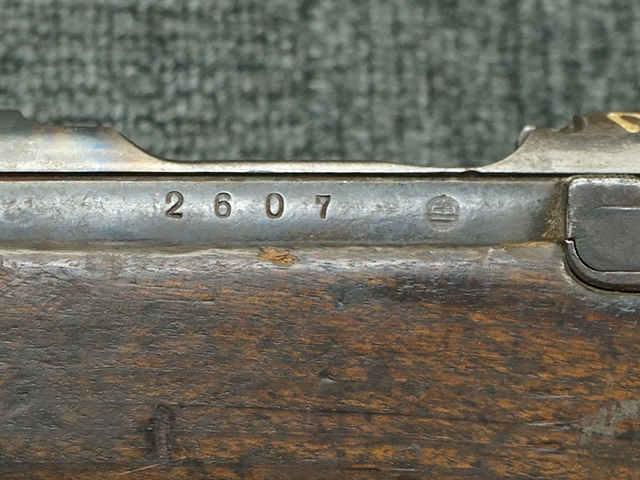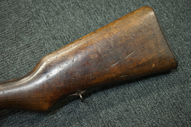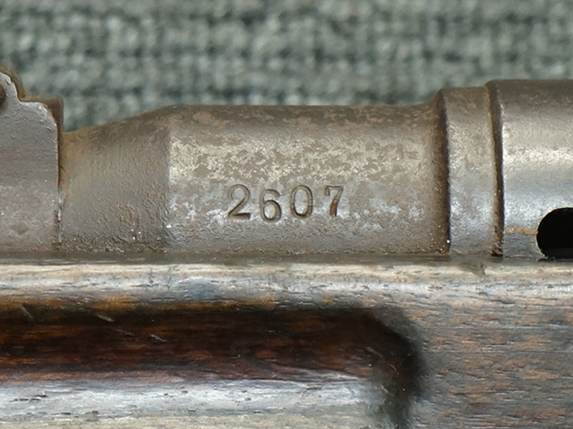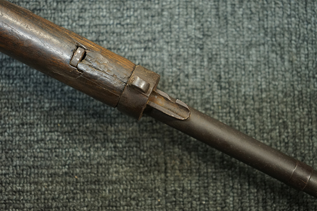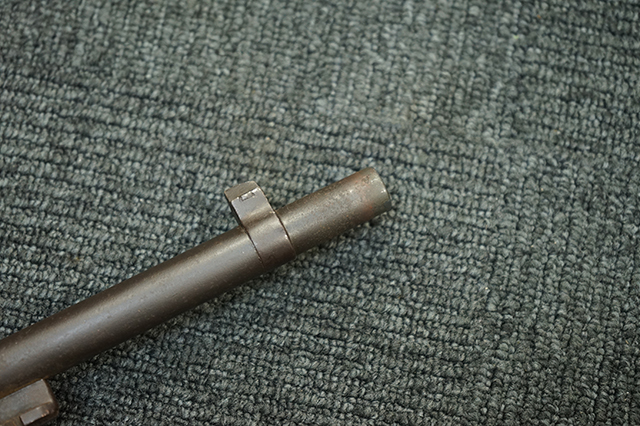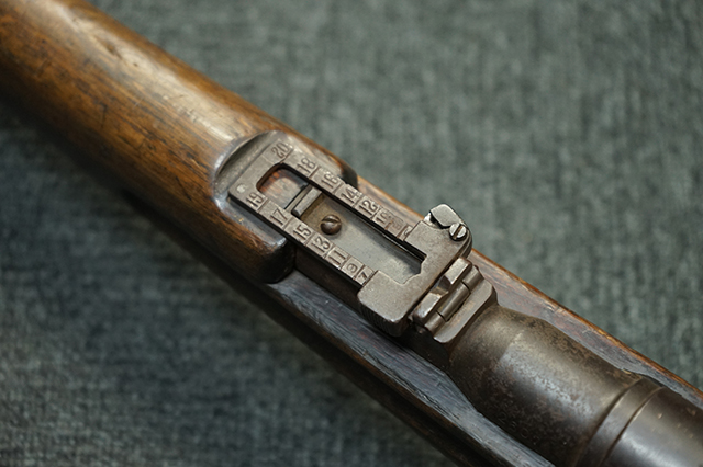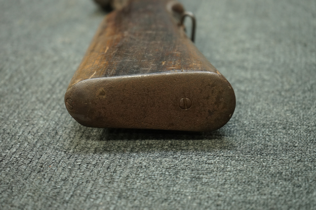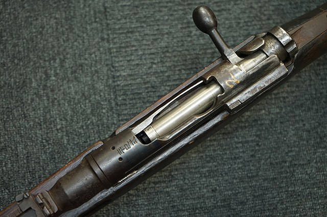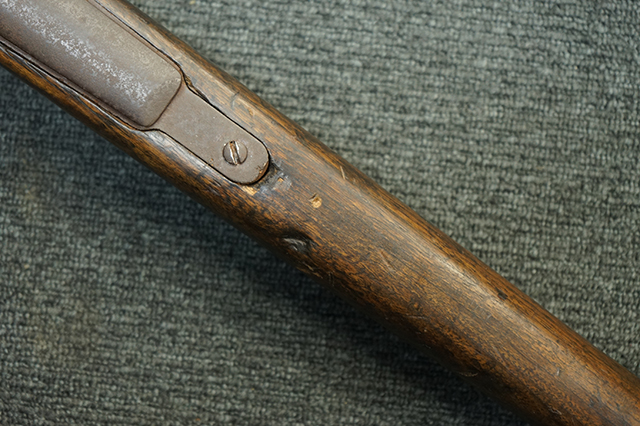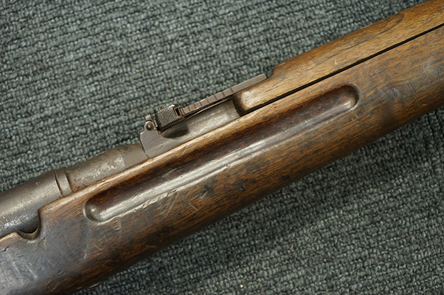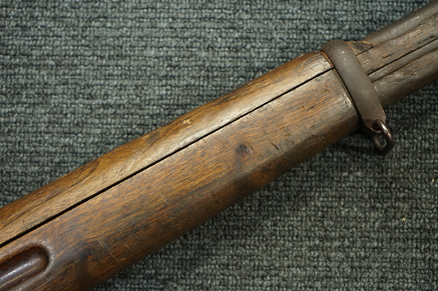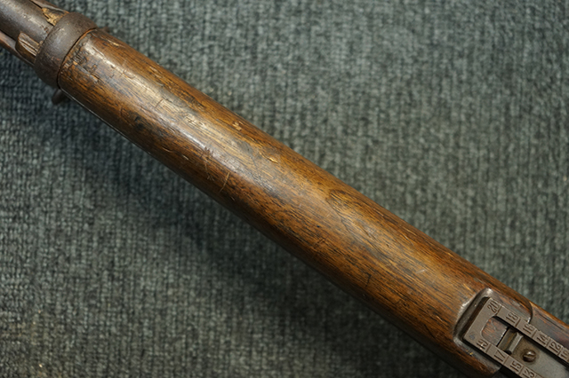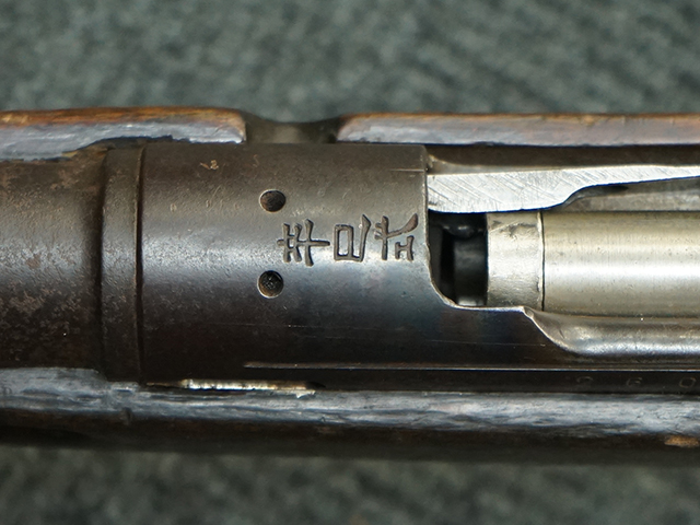 本品の薬室上面には「辛己式」の刻印がはっきりと入っており、シリアルNo.は機関部左側面及び銃身基部左側面でマッチしています。 機関部左側面のシリアルNo.後方には本品を製造したと思われる造兵廠のロゴも入っています。 本品は全体にやや使用感が見受けられ金属部は全体に表面錆や時代錆、経年による褪色等が表れているものの、現状大きな欠損等は見受けられず、比較的しっかりとした状態が保たれています。 槓桿 (ボルト・ハンドル) は僅かに後方に曲がりが見られますが、殆ど気にならないレベルのものです。 木部についても全体に使用感が見受けられ、打ち傷や線傷が見受けられます。 また、銃床前部左側面にひびを補修した痕跡が見られる他、右側面のリア・バンド・スプリング周辺に木部の痩せが見受けられます。 その他、木被 (アッパー・ハンドガード) の先端部に欠けが見られます。 銃床上下の木部の継ぎ目については現状大きな隙間やガタつきもなくしっかりとしています。 本品のクオリティは中国製とすればしっかりとしており、ストックの材質も悪くありません。 しかしながら、中国から出た品はその保存状態の悪さから他の品と比べ多くの問題点がありますので、現物をご確認の上ご注文していただきたい品です。 傷み易い床尾板についても全体に時代錆や表面錆が見られる他、銃床との取り付け部に僅かに隙間が見られるものの、取り付け自体はガタつきもなくしっかりとしています。 表尺 (リア・サイト) の起倒や調整については問題なく行う事が可能です。 弾倉内の弾受 (フォロワー) 及び弾倉バネは入っています。 さく杖 (クリーニング・ロッド) は付属致しません。