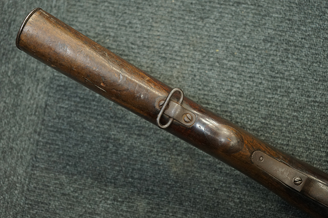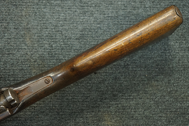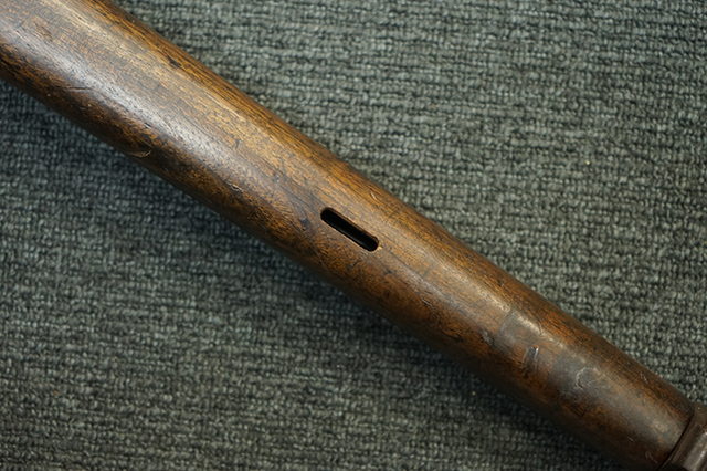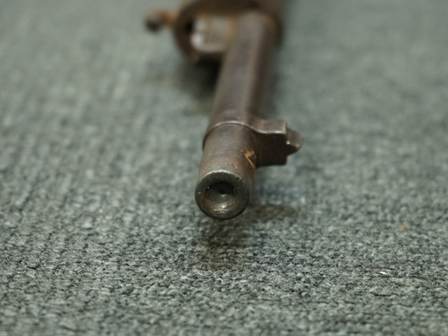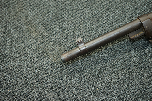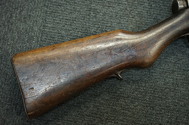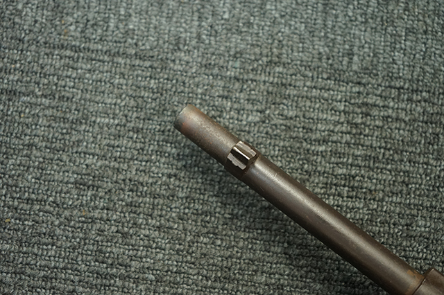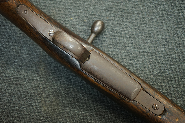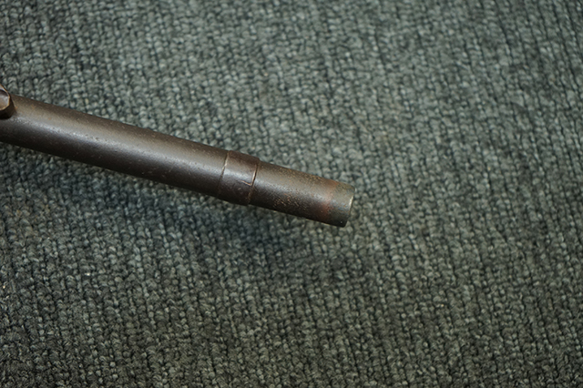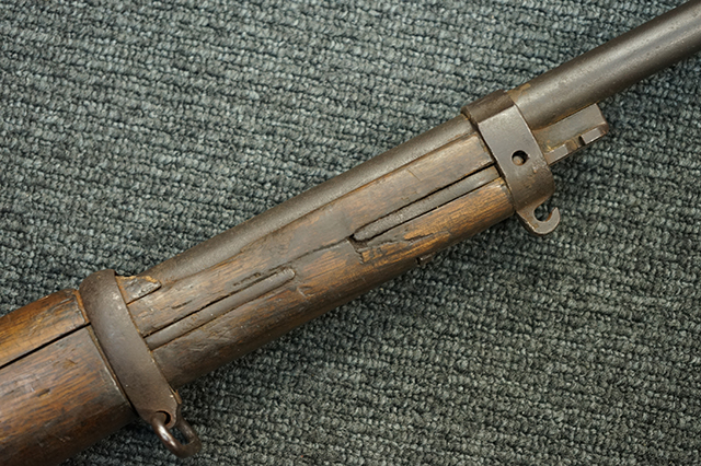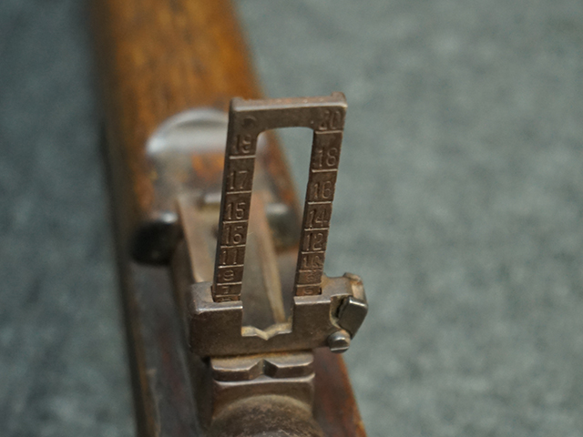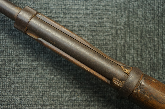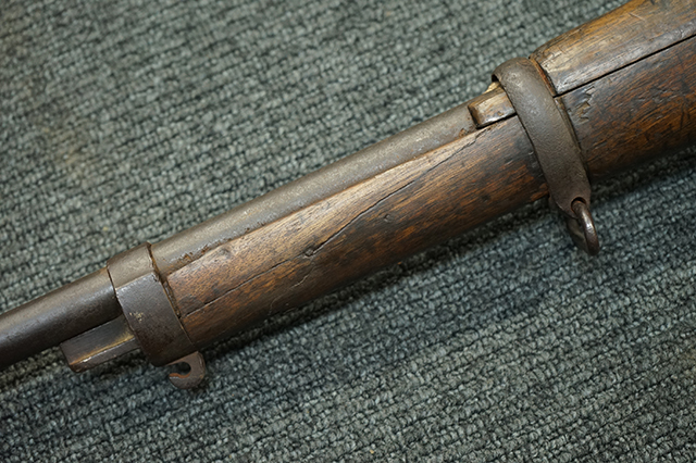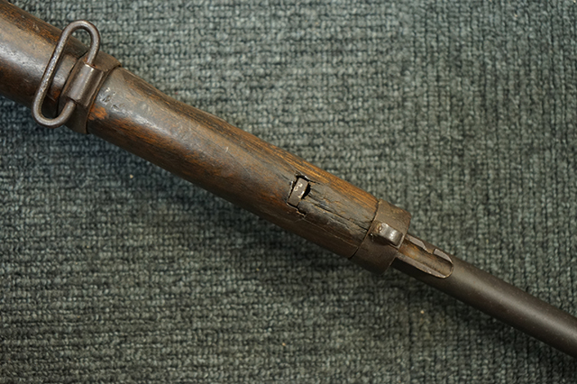 本品の薬室上面には「辛己式」の刻印がはっきりと入っており、シリアルNo.は機関部左側面及び銃身基部左側面でマッチしています。 機関部左側面のシリアルNo.後方には本品を製造したと思われる造兵廠のロゴも入っています。 本品は全体にやや使用感が見受けられ金属部は全体に表面錆や時代錆、経年による褪色等が表れているものの、現状大きな欠損等は見受けられず、比較的しっかりとした状態が保たれています。 槓桿 (ボルト・ハンドル) は僅かに後方に曲がりが見られますが、殆ど気にならないレベルのものです。 木部についても全体に使用感が見受けられ、打ち傷や線傷が見受けられます。 また、銃床前部左側面にひびを補修した痕跡が見られる他、右側面のリア・バンド・スプリング周辺に木部の痩せが見受けられます。 その他、木被 (アッパー・ハンドガード) の先端部に欠けが見られます。 銃床上下の木部の継ぎ目については現状大きな隙間やガタつきもなくしっかりとしています。 本品のクオリティは中国製とすればしっかりとしており、ストックの材質も悪くありません。 しかしながら、中国から出た品はその保存状態の悪さから他の品と比べ多くの問題点がありますので、現物をご確認の上ご注文していただきたい品です。 傷み易い床尾板についても全体に時代錆や表面錆が見られる他、銃床との取り付け部に僅かに隙間が見られるものの、取り付け自体はガタつきもなくしっかりとしています。 表尺 (リア・サイト) の起倒や調整については問題なく行う事が可能です。 弾倉内の弾受 (フォロワー) 及び弾倉バネは入っています。 さく杖 (クリーニング・ロッド) は付属致しません。