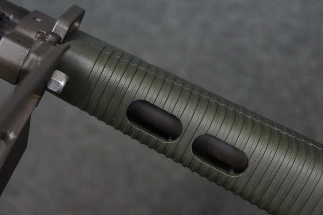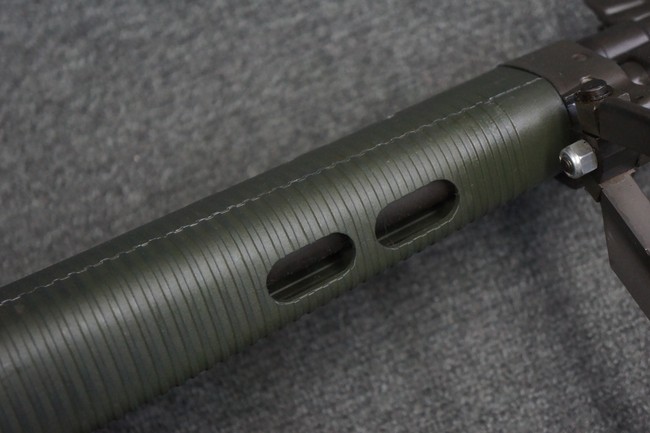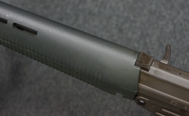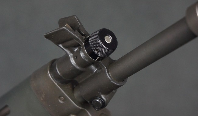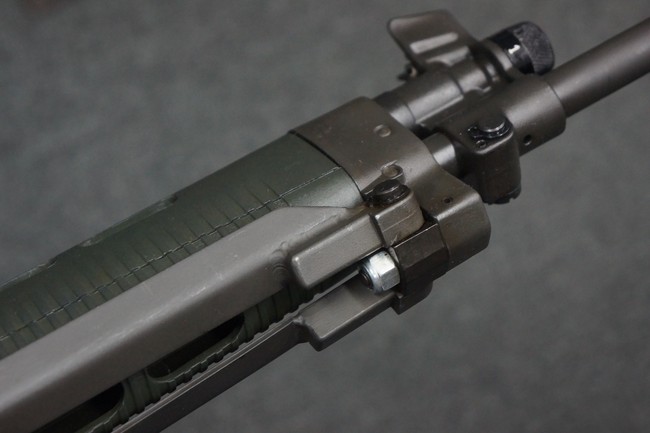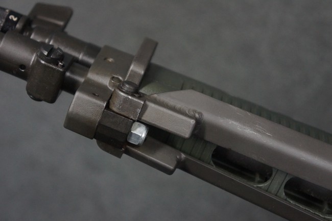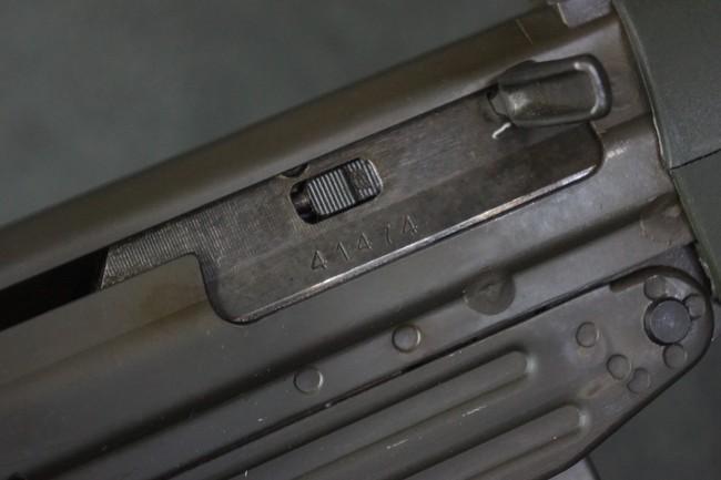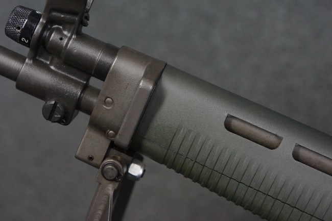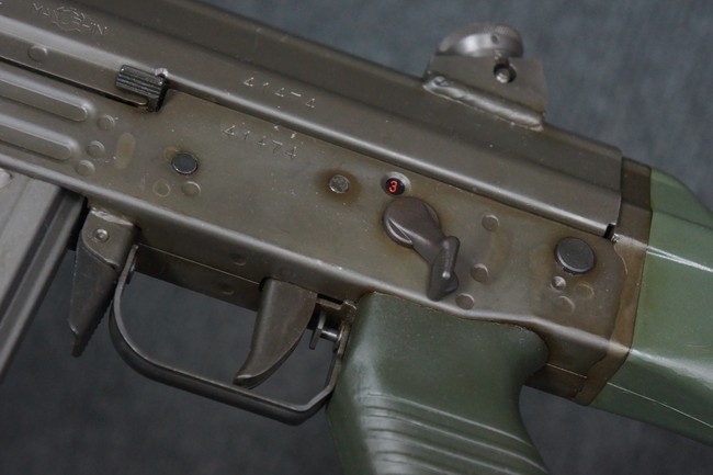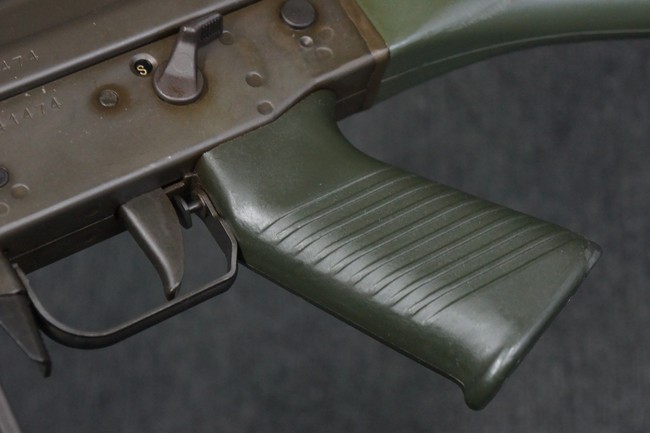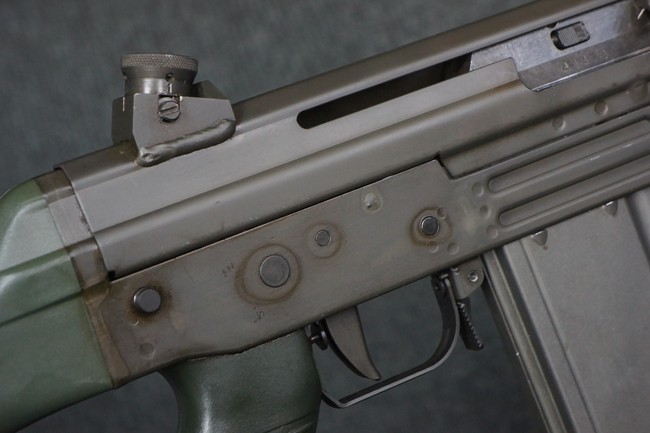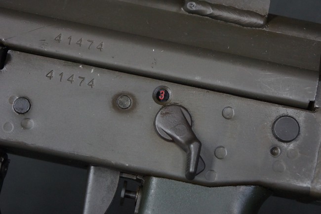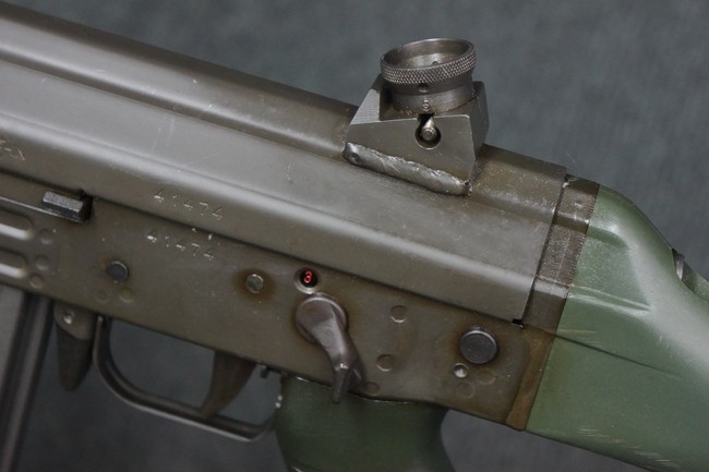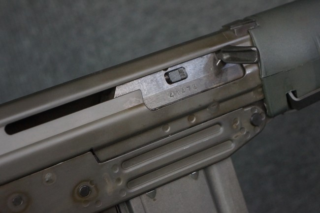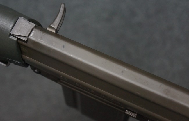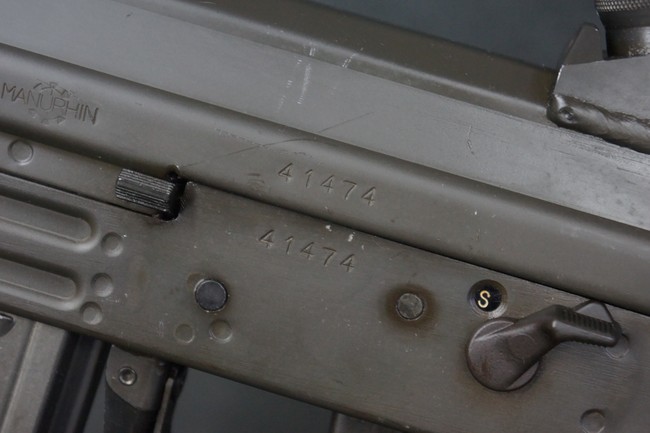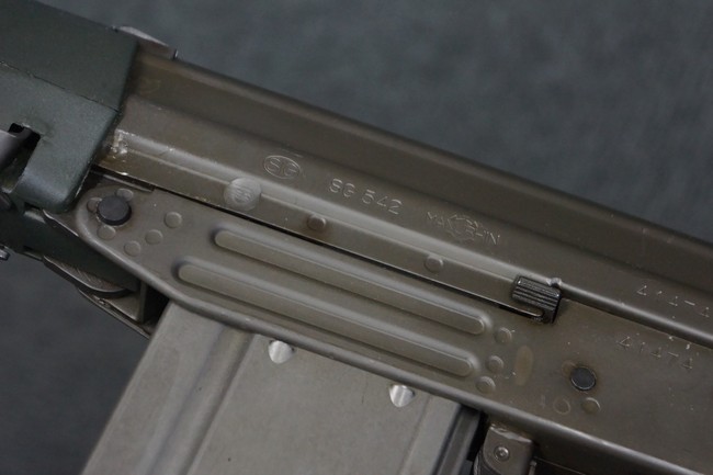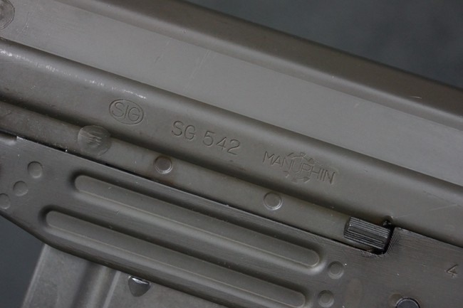 本品はSIG社と提携関係があったフランスのマニューリン社によるライセンス生産品で、機関部左側面にはSIG社のロゴや「SG542」のモデル名刻印の他、マニューリン社製を示す「MANURHIN」の刻印が見られます。 シリアルNo.は、アッパー/ロア・レシーバー及びボルト・キャリアでマッチしています。