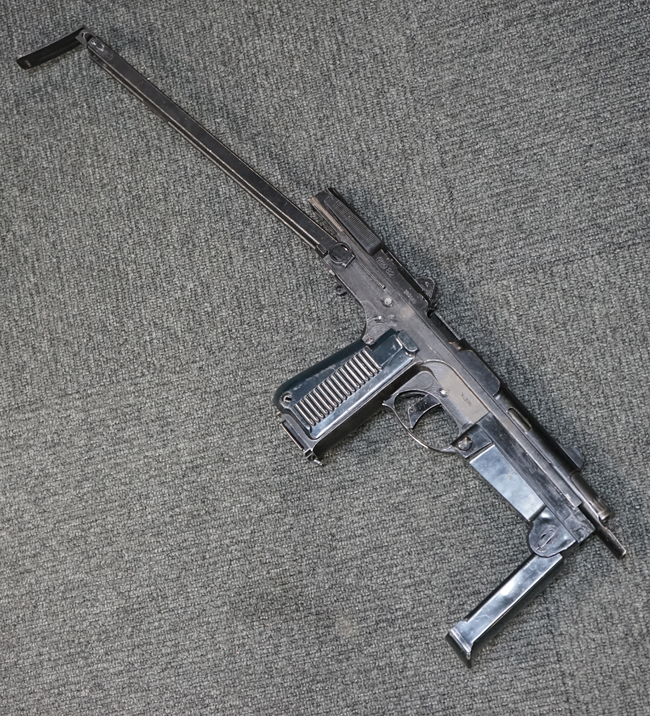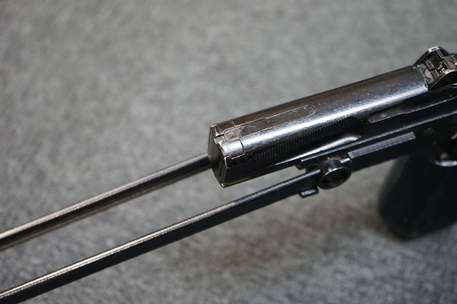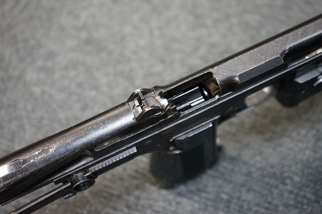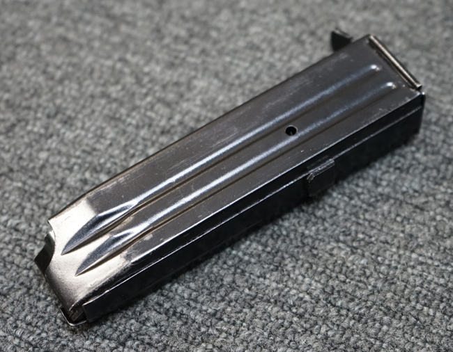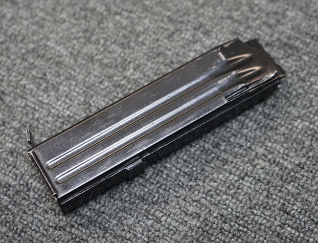 金属部は角や可動部等に若干の小傷や擦れは見受けられるものの、目立った欠損等は見受けられず、黒の焼付け塗装も大部分に残った良好な状態が保たれています。 樹脂部についても、やや打ち傷や擦れは見られるものの、現状目立った割れや欠け等は見られず、総じてしっかりとした状態が保たれています。 リア・サイトの切り替えやマガジンの着脱、フォア・グリップの折り畳み、引き出し式のストックの展開・収納操作については、問題無く行う事が可能です。 フォア・グリップやストックは展開時の遊びも十分許容レベルです。 尚、グリップ左側面のセーフティは可動致しません。 付属のマガジンは15連のショート・タイプで、こちらも本体同様黒色の焼付塗装仕上げとなっています。 マガジンについても若干の擦れは見られるものの、目立った凹みや変形は見られず、良好な状態が保たれています。 マガジン・スプリングは入っています。