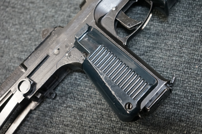 本品のスライド右側面排莢孔後方には、シリアルNo.に加えて造兵廠を示す楕円形の中に9726の刻印や、「82」のモデル名刻印が入っています。 ロア・フレームやスライドといった金属部は黒色の焼付塗装仕上げとなっています。