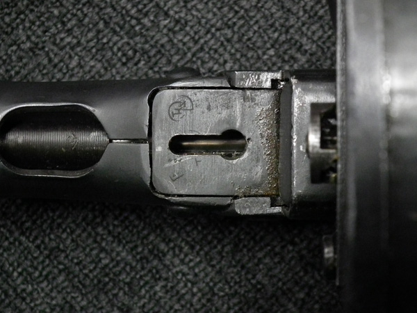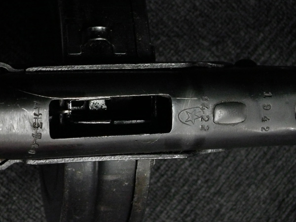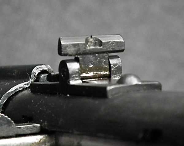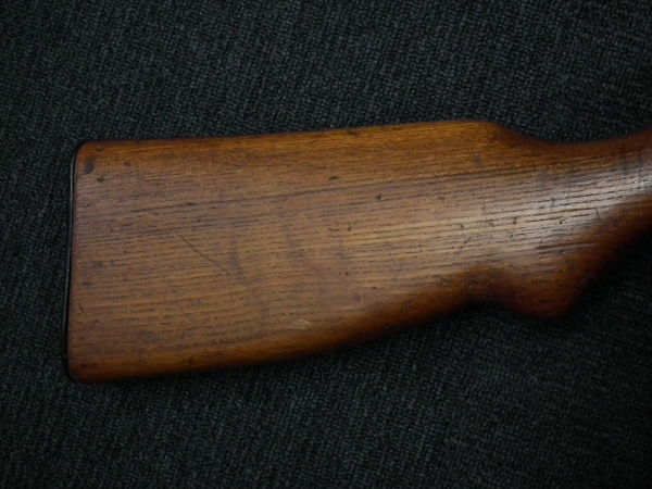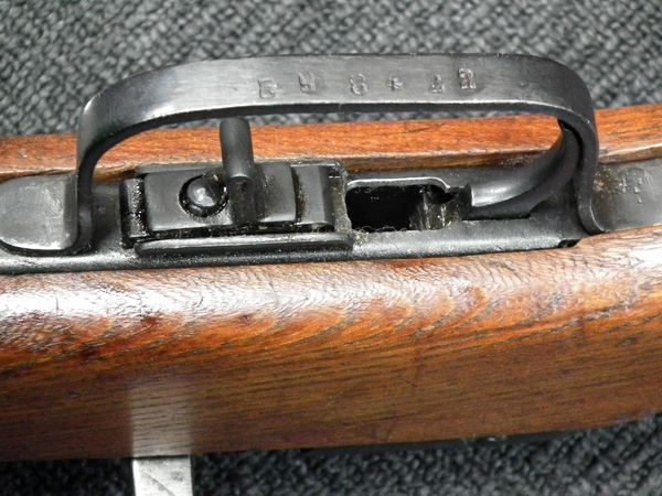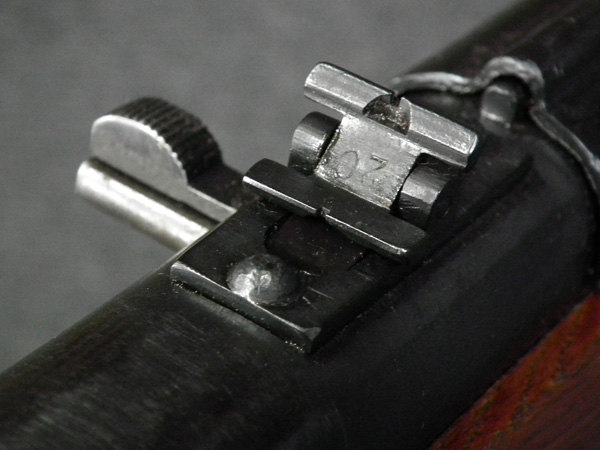 本品はリア・サイト・ガードが付かない大型のフリップ・アップ型リア・サイトを備えた中期型です。 ロア・フレームは両面に強化タブが付いた仕様となっています。 アッパー・レシーバー上面には製造年を示す1942の刻印の他、ヴャツキエ・ポリャニ 第367工場製を示す「盾と星」の刻印が入っています。 機関部のシリアルNo.は打ち直しにより8422と入っており、ボルト、アッパー・タング、トリガー・ガード、バット・ストックでマッチしている他、銃身についても打ち直しによりマッチしています。