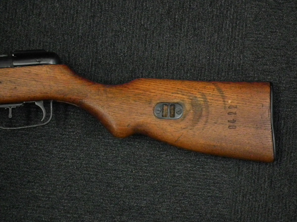 本品の金属部にはやや使用感は見られるものの、レシーバーや銃身といった金属部は若干の小傷や擦れを除いて目立った欠損や変形等は見受けられず、大部分に表面仕上げが残った概ね良好な状態が保たれています。 木製銃床についても、若干の打ち傷が見られるものの、大きな欠損等は見受けられず、概ねしっかりとした状態が保たれています。 バット・ストック左側面のスリング金具後方に、弧を描くような浅い抉れが3か所見受けられるものの、断面に時代が付いることから古い傷と見られ、大きな違和感はありません。 傷み易いバット・プレートについても若干の打ち傷や擦れは見られるものの、大きな変形等は見られず、ストック内コンパートメントの蓋の開閉についても問題なく行う事が可能です。 また、フリップ式リア・サイトの切り替えやレシーバーのテイクダウンの他、マガジンの着脱についてもやや固いものの問題なく行えます。 付属のマガジンは背面に電気ペンによる6843の番号が入っています。 マガジンは表面にやや小傷や擦れは見られるものの、大きな凹みや変形等は見られず、比較的しっかりとした状態が保たれています。 尚、マガジンは内部パーツの一部が固定されています。