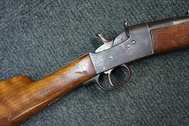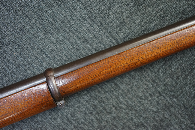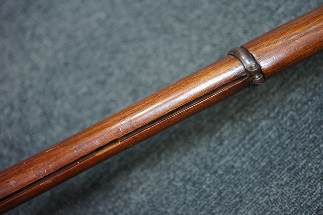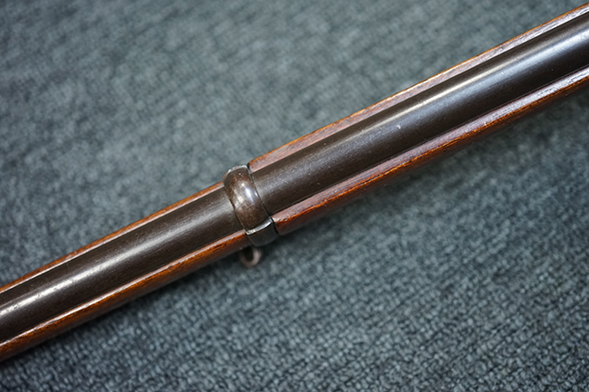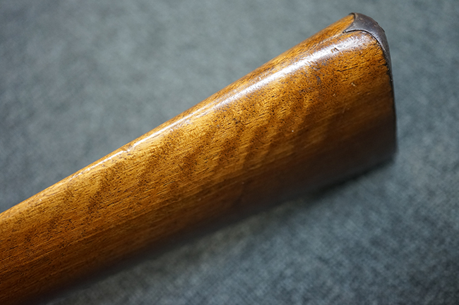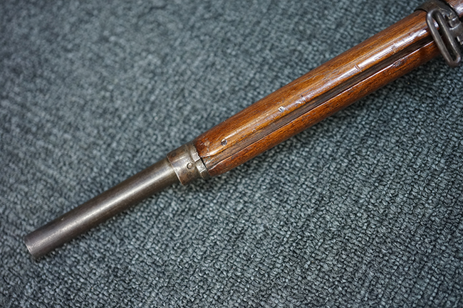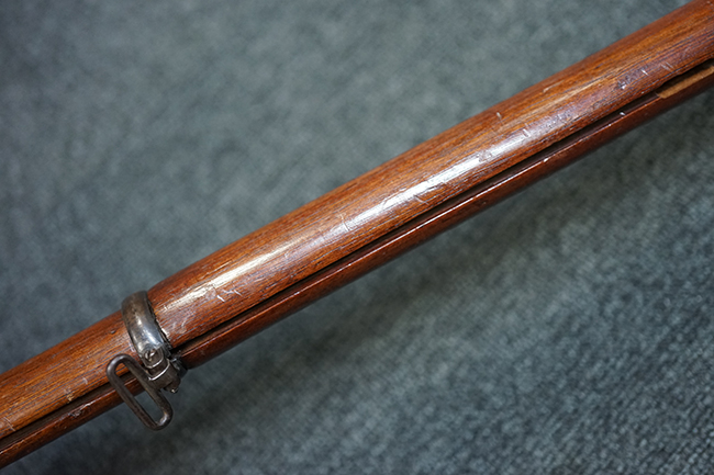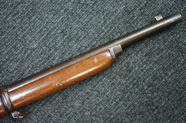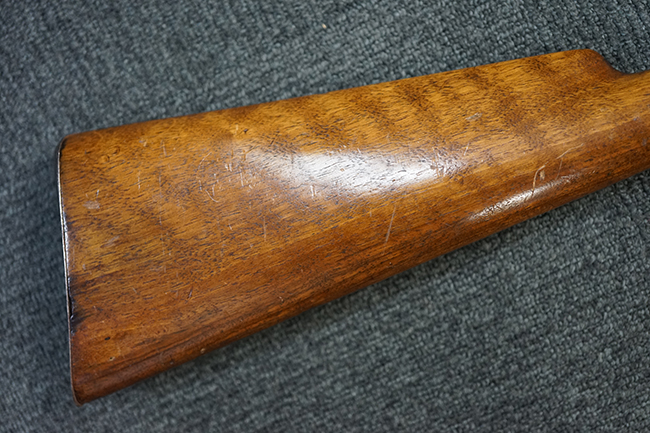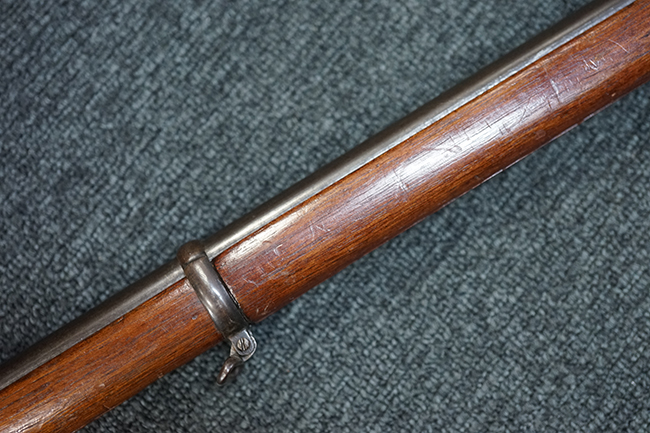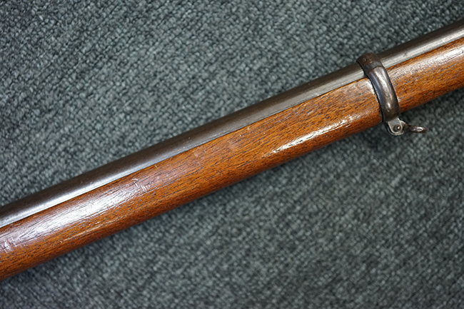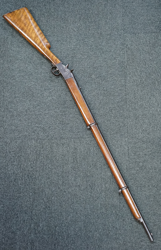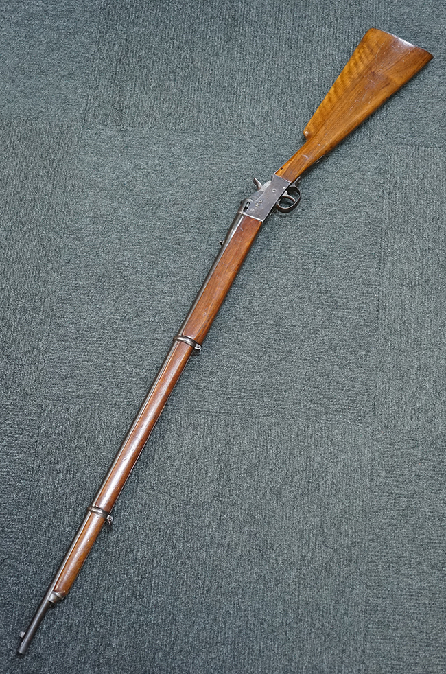 本品は通常のレミントン ローリング・ライフルより一回り小さく、19世紀の士官候補生用(Cadet)として特別に作られた品ではないかと思われます。 軍用の大型単発小銃をそのままスケール・ダウンさせた非常に興味深い品です。薬室左側面にペロンの刻印、機関部左側面に王冠にMLのプルーフ・マークが入っており、ベルギー製であることが判ります。 全体的な状態は百年以上経った品にしては当時の仕上げもある程度残っている程度の良い品です。 ストックは銃口部近くまでハンドガードが伸びた典型的な軍用ストックですが、ローリング・ブロック・ライフルではこの形状のストックは珍しいものです。 木部には多少の小傷が見られますが外見を損なう目立つ傷などはありません。 鉄部には若干の退色と表面錆が小さく見られますが、オリジナルの仕上げをよく残しています。 バットストックと機関部を結合している上の部分に当時の小さな修理跡(元々ある材質にかなり同化しているプロの仕事です)があります。 本品はレミントン・ローリング・ブロック・ライフルの専門書としては最も詳しいRemington Rolling Block Military Rifleにも載っていない非常に珍しい品です。 トリガーテンションのない、新加工品です。(YS)