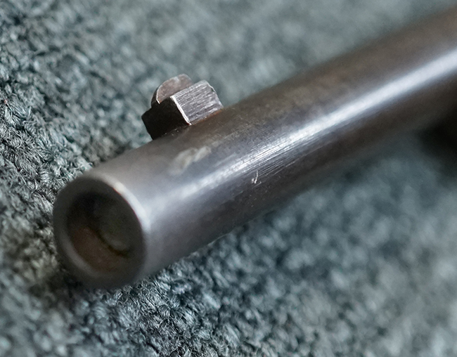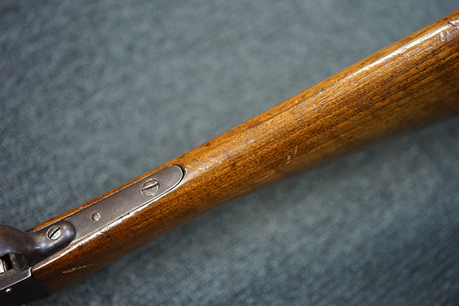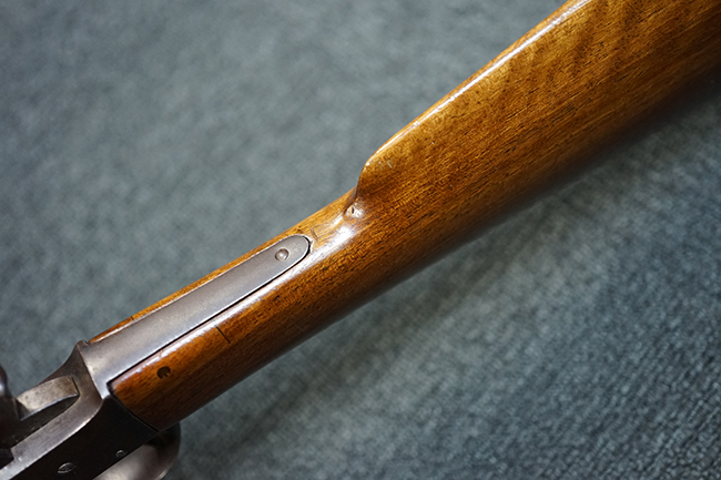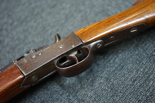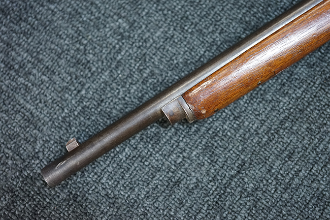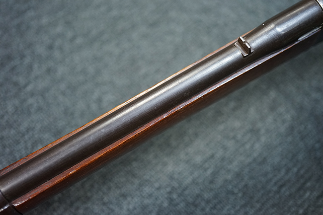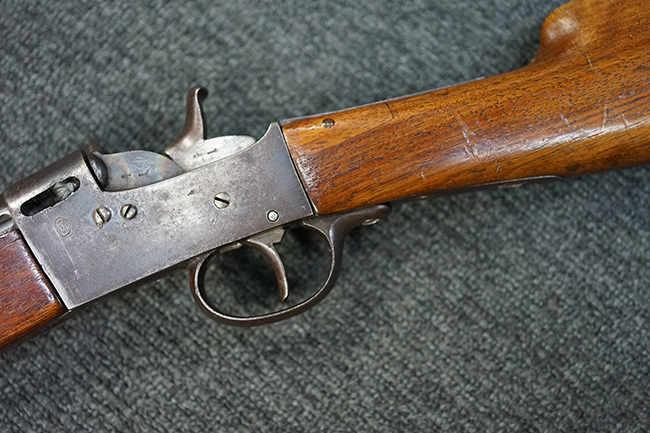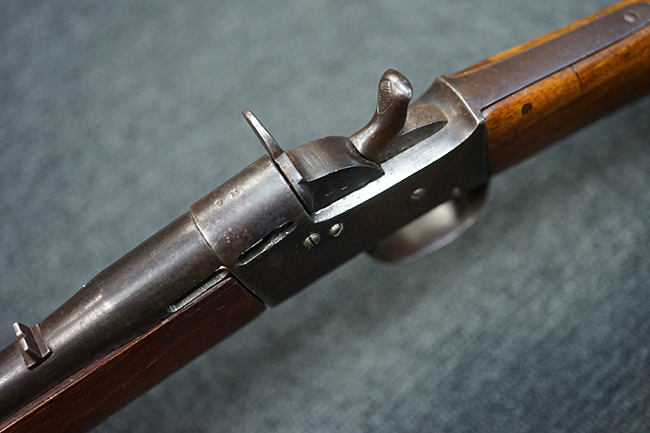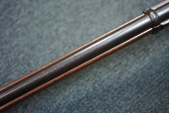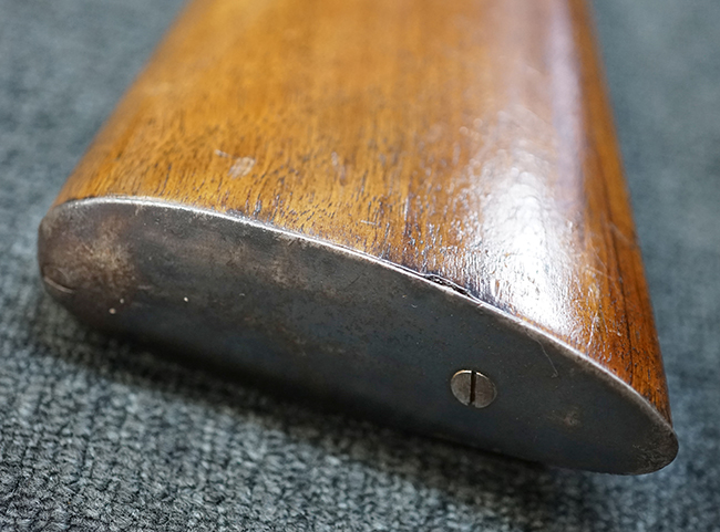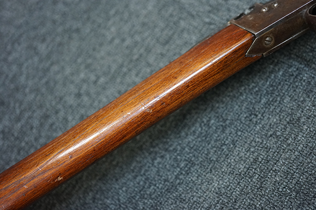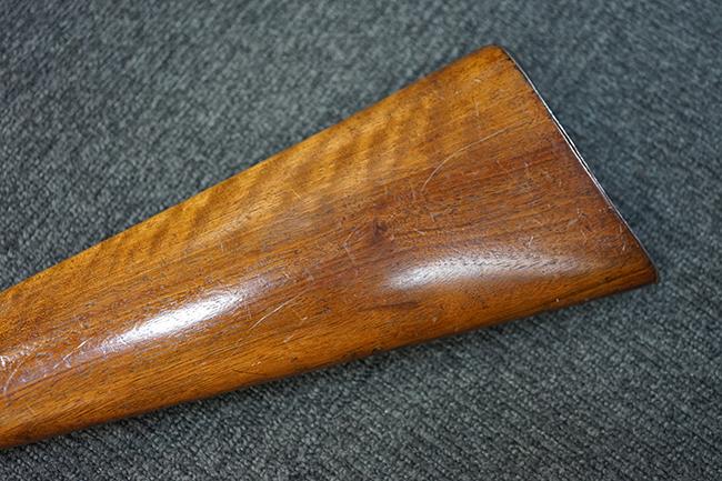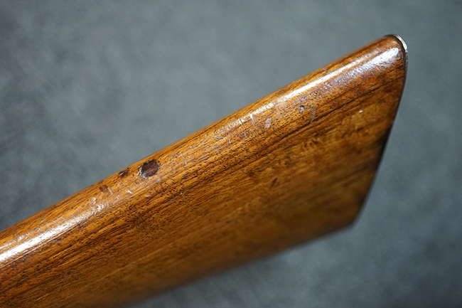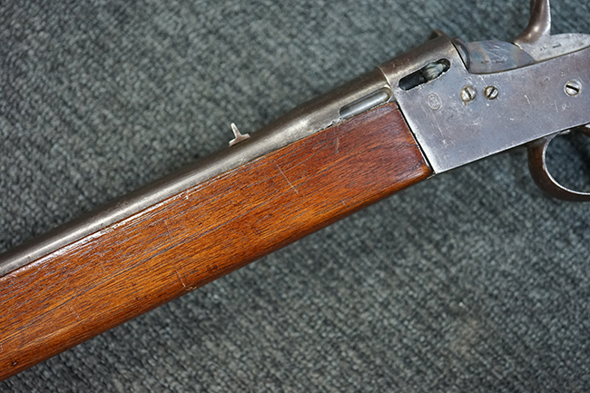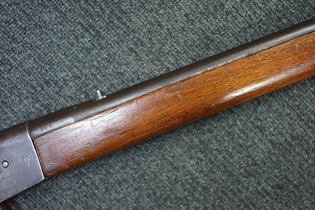 本品は通常のレミントン ローリング・ライフルより一回り小さく、19世紀の士官候補生用(Cadet)として特別に作られた品ではないかと思われます。 軍用の大型単発小銃をそのままスケール・ダウンさせた非常に興味深い品です。薬室左側面にペロンの刻印、機関部左側面に王冠にMLのプルーフ・マークが入っており、ベルギー製であることが判ります。 全体的な状態は百年以上経った品にしては当時の仕上げもある程度残っている程度の良い品です。 ストックは銃口部近くまでハンドガードが伸びた典型的な軍用ストックですが、ローリング・ブロック・ライフルではこの形状のストックは珍しいものです。 木部には多少の小傷が見られますが外見を損なう目立つ傷などはありません。 鉄部には若干の退色と表面錆が小さく見られますが、オリジナルの仕上げをよく残しています。 バットストックと機関部を結合している上の部分に当時の小さな修理跡(元々ある材質にかなり同化しているプロの仕事です)があります。 本品はレミントン・ローリング・ブロック・ライフルの専門書としては最も詳しいRemington Rolling Block Military Rifleにも載っていない非常に珍しい品です。 トリガーテンションのない、新加工品です。(YS)