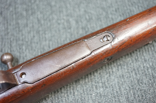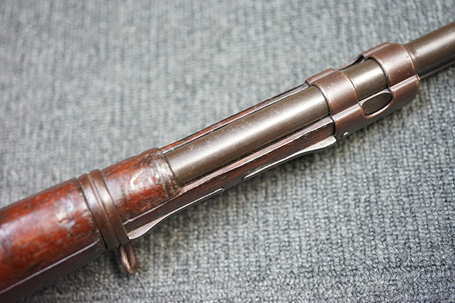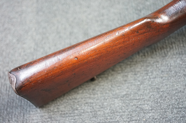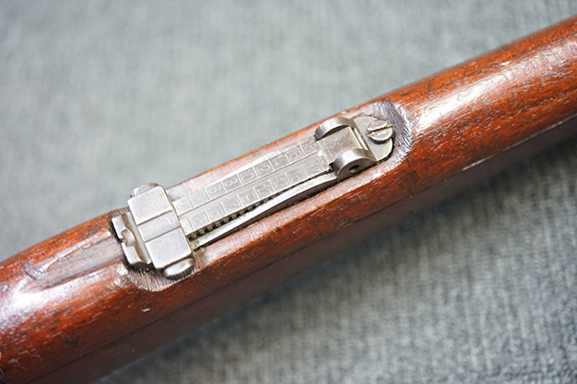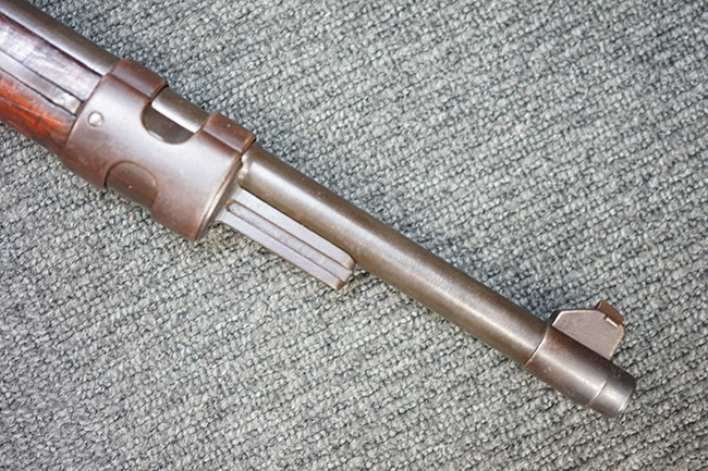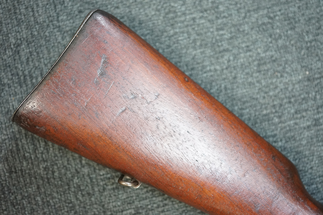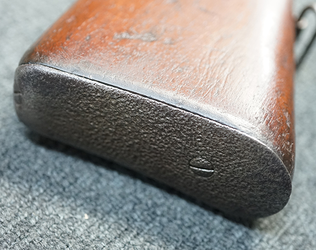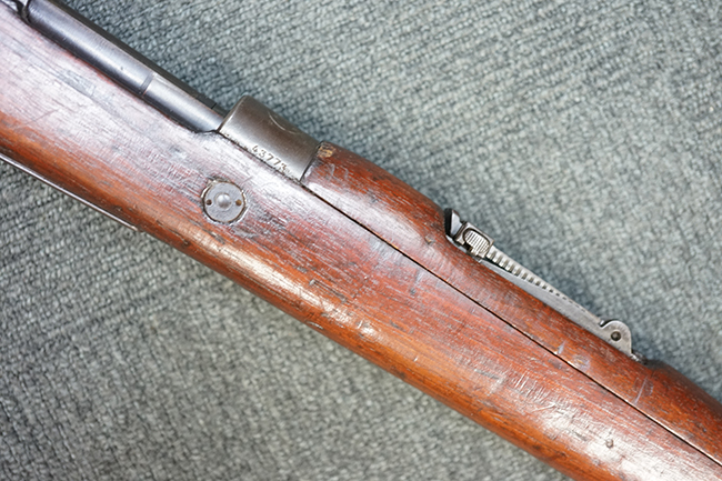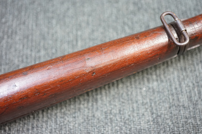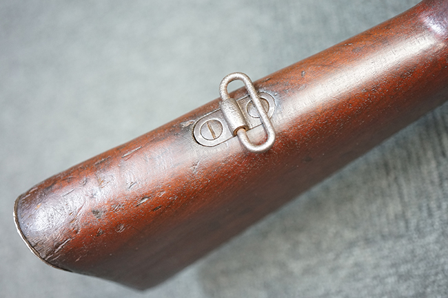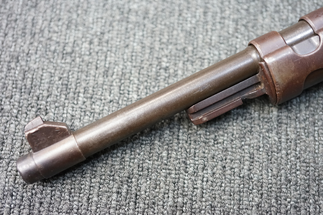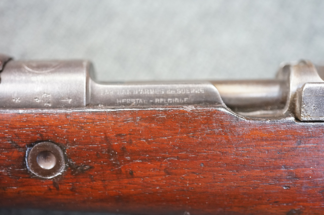本品の薬室上部にはFN社の楕円型ロゴが大きく入っています。 レシーバー左側面にフランス語で「FAB. NAT. D'ARMES de GUERRE, HERSTAL-BELGIQUE」と入っています。 「de」部分の刻印が小文字となっている事から、本品が1937年もしくは1938年以降に製造された事が窺えます。 ハンドガード形状及びリア・スリング・スイベルの取り付け位置についてもFN モーゼル M1930の仕様とマッチしています。 各部のシリアルNo.は、薬室が43773、セーフティ・レバーが7888、ボルト・ハンドルがH142となっています。 本品は適度な使用感が見受けられ、金属部はやや小傷や擦れ、若干の表面錆が見られる他、ストックによって隠れている機関部下部と銃身には若干の朽ち込み錆が見受けられますが、全体としては大きな欠損は見受けられず、比較的しっかりとした状態が保たれています。 木製銃床については若干の打ち傷が見受けられ、アッパー・ハンドガード後部左側面に一部欠けが見られるものの、それ以外には大きな破損や欠損等も見受けられず、全体に艶のある仕上げが残ったしっかりとした状態が保たれています。 バット・プレートは全体に仕上げが落ちて金属の地肌が表れており、表面全体にやや朽ち込みが目立ちますが、銃床への取り付けについてはガタつきもなくしっかりとしています。 フロント・バンド及びスリング・スイベルの環はややガタつきが見られますが、簡単に外れてしまうような事はありません。 銃口部は若干の摩耗が見られるものの、クラウンの形状が残った丁寧な処理が行われています。 リア・サイトの調整については問題なく行う事が可能です。 弾倉内のスプリング及びフォロワーは入っています。 尚、さく杖は付属致しません。