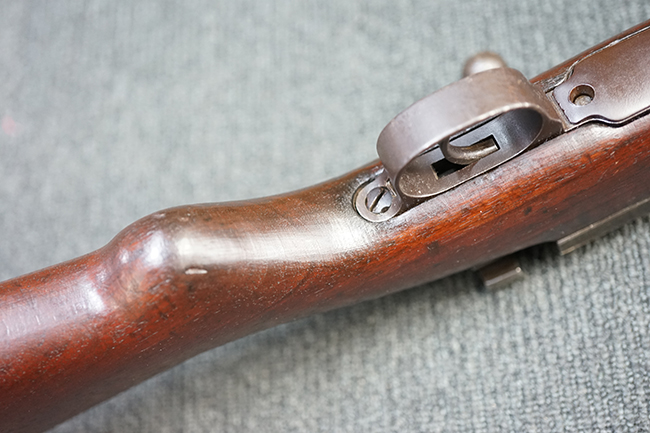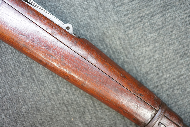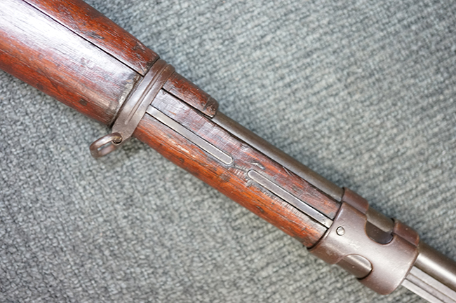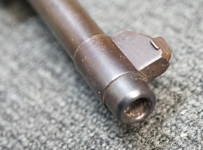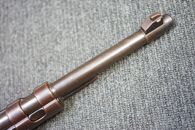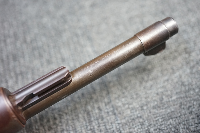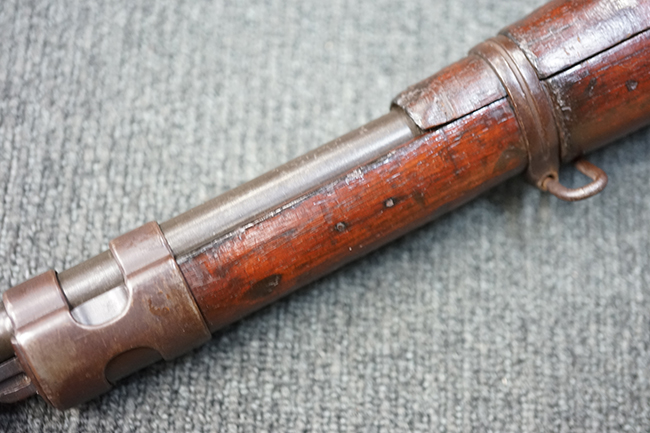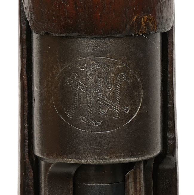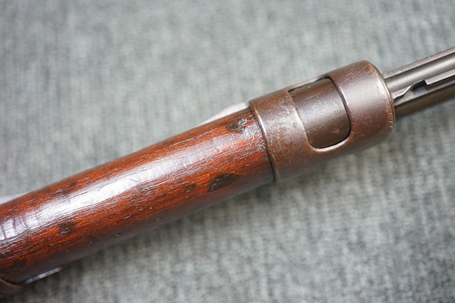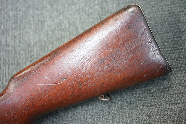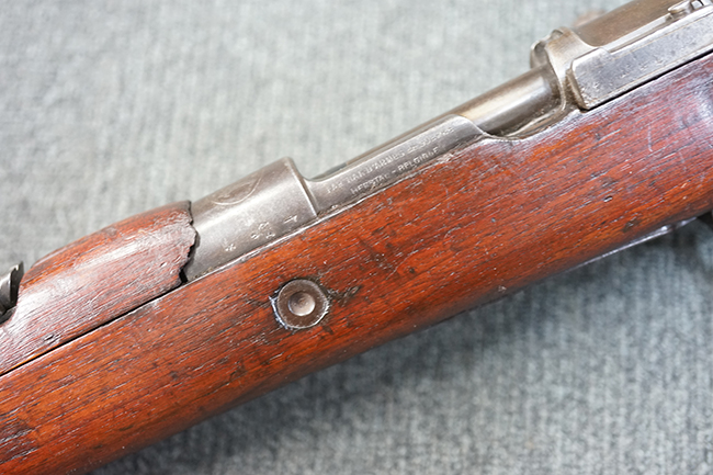 本品の薬室上部にはFN社の楕円型ロゴが大きく入っています。 レシーバー左側面にフランス語で「FAB. NAT. D'ARMES de GUERRE, HERSTAL-BELGIQUE」と入っています。 「de」部分の刻印が小文字となっている事から、本品が1937年もしくは1938年以降に製造された事が窺えます。 ハンドガード形状及びリア・スリング・スイベルの取り付け位置についてもFN モーゼル M1930の仕様とマッチしています。 各部のシリアルNo.は、薬室が43773、セーフティ・レバーが7888、ボルト・ハンドルがH142となっています。 本品は適度な使用感が見受けられ、金属部はやや小傷や擦れ、若干の表面錆が見られる他、ストックによって隠れている機関部下部と銃身には若干の朽ち込み錆が見受けられますが、全体としては大きな欠損は見受けられず、比較的しっかりとした状態が保たれています。 木製銃床については若干の打ち傷が見受けられ、アッパー・ハンドガード後部左側面に一部欠けが見られるものの、それ以外には大きな破損や欠損等も見受けられず、全体に艶のある仕上げが残ったしっかりとした状態が保たれています。 バット・プレートは全体に仕上げが落ちて金属の地肌が表れており、表面全体にやや朽ち込みが目立ちますが、銃床への取り付けについてはガタつきもなくしっかりとしています。 フロント・バンド及びスリング・スイベルの環はややガタつきが見られますが、簡単に外れてしまうような事はありません。 銃口部は若干の摩耗が見られるものの、クラウンの形状が残った丁寧な処理が行われています。 リア・サイトの調整については問題なく行う事が可能です。 弾倉内のスプリング及びフォロワーは入っています。 尚、さく杖は付属致しません。