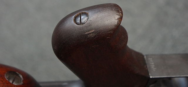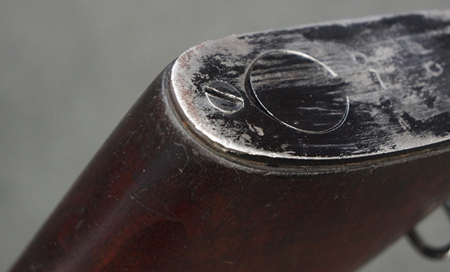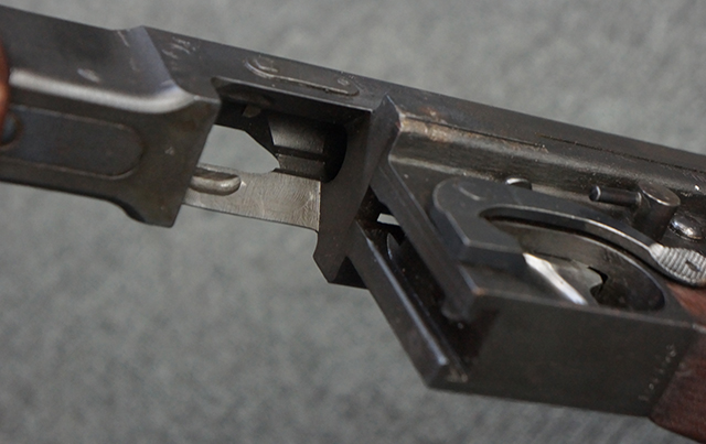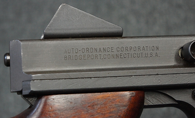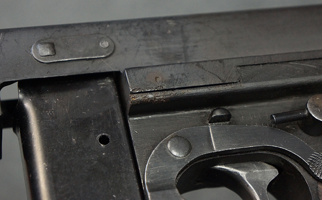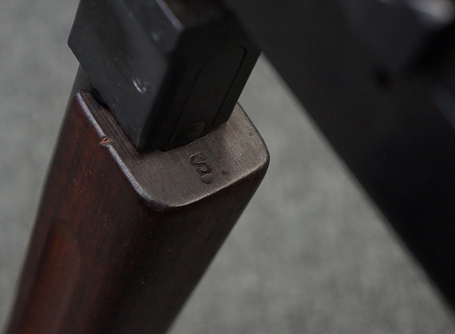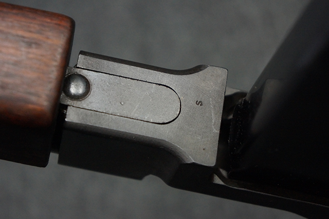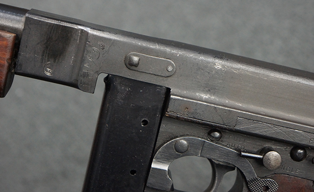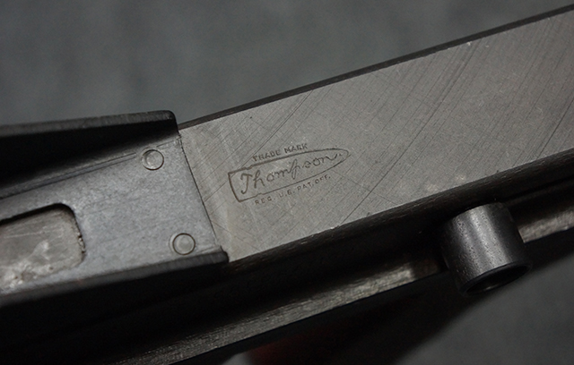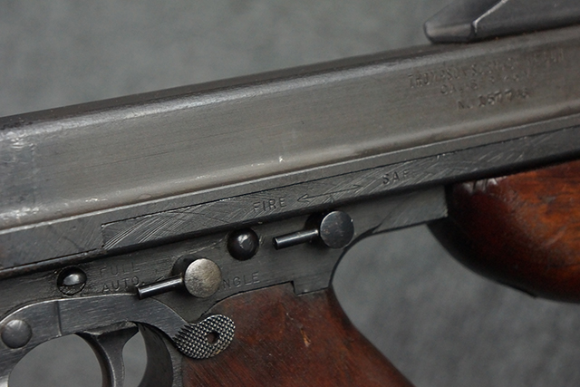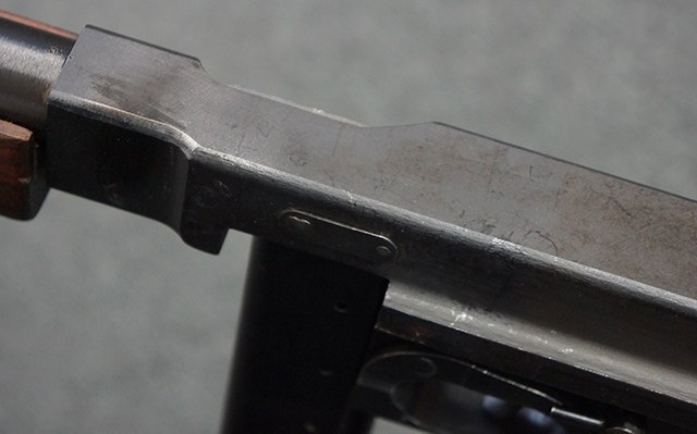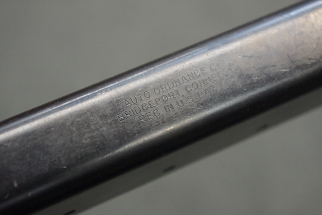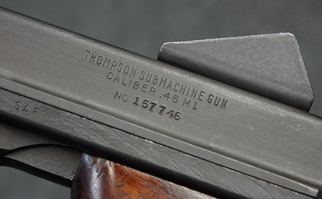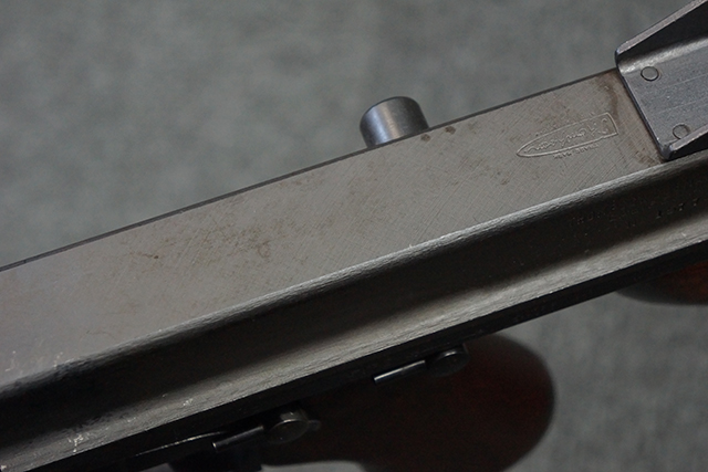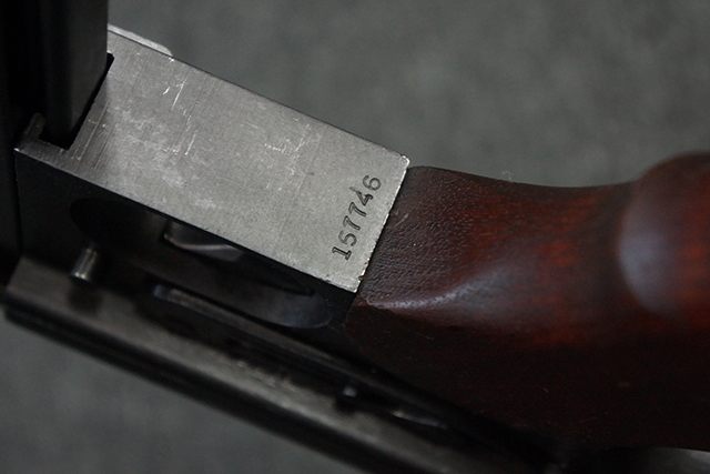 本品はレシーバー左側面に「THOMPSON SUBMACHINE GUN CALIBER .45 M1」の刻印及びシリアルNo.157746の刻印が見られます。 モデル名刻印にA1は追加されていませんが、リア・サイトは三角形のガード付きのM1A1タイプとなっています。 また、レシーバー右側面には「AUTO-ORDNANCE CORPORATION BRIDGEPORT, CONNECTICUT, U.S.A」の刻印が入っています。 その他、レシーバー上面にはトンプソンのロゴが入っています。 ロア・レシーバーのシリアルNo.は157746でアッパー・レシーバーとマッチしています。 また、アッパー・レシーバー、ロア・レシーバー、スプリング・ガイド、セーフティー・レバー及びセレクター・レバー、ハンド・ガードにはサベージ社製を表すSの刻印が入っています。