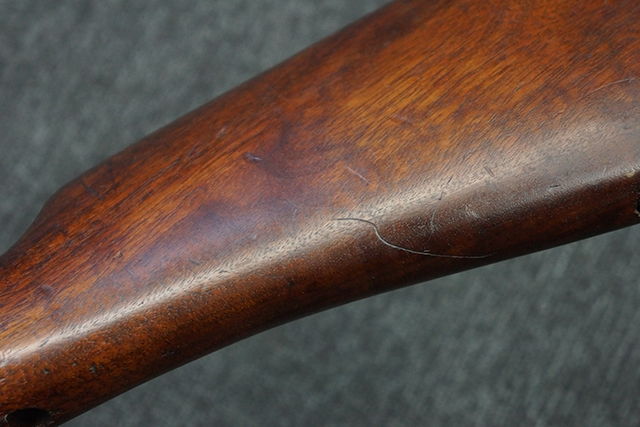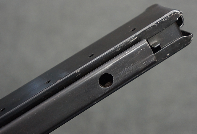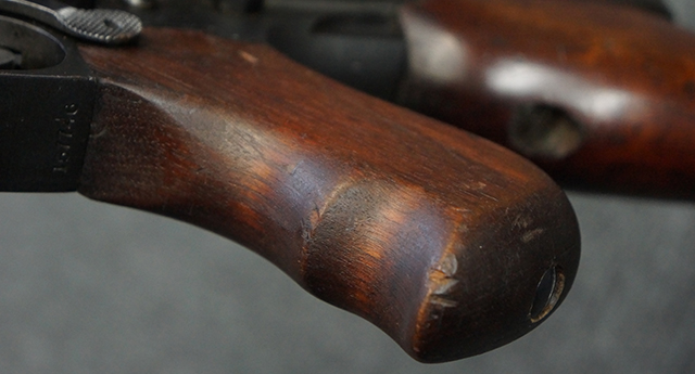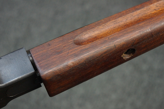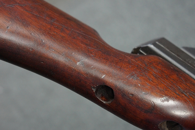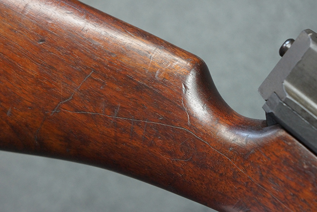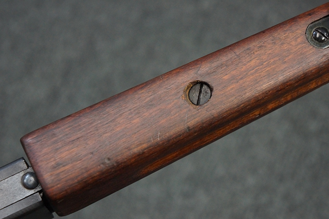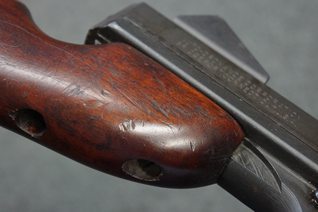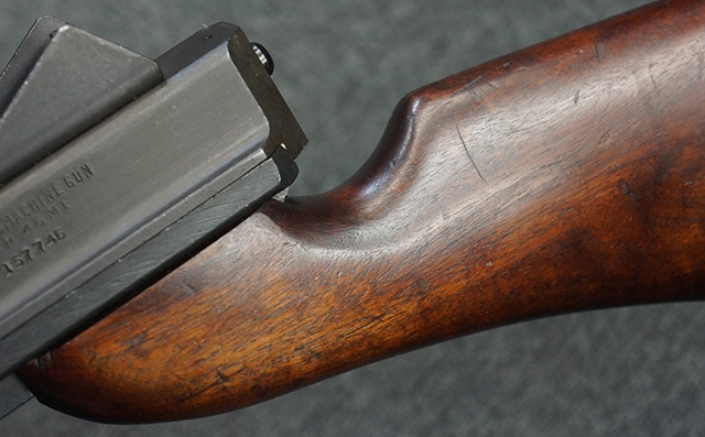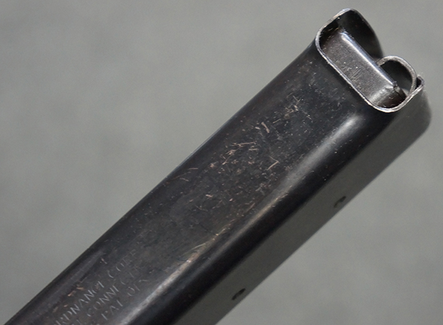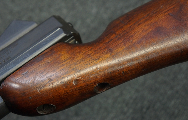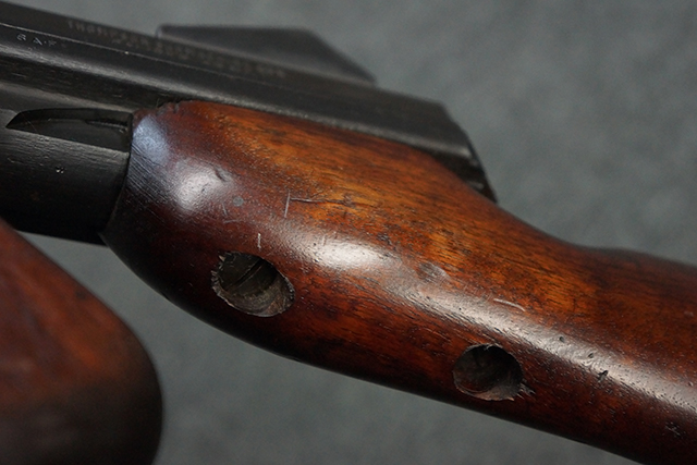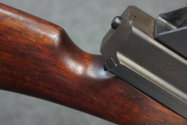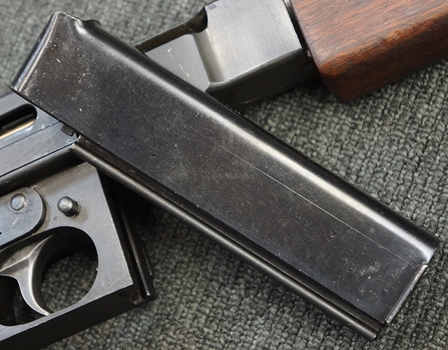 本品は全体に適度な使用感が見受けられ、金属部はやや小傷や擦れ、若干の経年による褪色が見受けられる他、マガジン取付部付近のレシーバー左側面に一部朽ち込み痕が見られるものの、大きな欠損等は見られず、オリジナルの仕上げも大部分に残っています。 ハンドガードやグリップ、バット・ストックといった木部については、バット・ストックにやや艶が有るものの各部の色合いは比較的マッチしており大きな違和感は感じられません。 木部はやや打ち傷や線傷の他、グリップ下部等に僅かな欠けが見られるものの、全体としては目立った割れや欠け等は見受けられず、比較的しっかりとした状態が保たれています。 ハンドガードの取り付けにやや遊びが見受けられます。 バット・プレートは黒色の塗装仕上げとなっており、仕上げが落ちて金属の地肌が表れている箇所が見られますが、大きな変形等は見られず、バット・ストックへの取り付けもがたつきもなくしっかりとしています。 ストック内コンパートメントの蓋の開閉については問題なく行う事が可能です。 セレクター及びセーフティ・レバーの切り替えは可能ですが、トリガーとの連動等は有りません。 付属のマガジンはAUTO ORDNANCE製の20連タイプで、前面にメーカー・アドレス刻印が入っています。 マガジンにはやや小傷や擦れが見られますが、目立った凹みや変形等は見られず、本体への着脱についても問題なく行う事が可能です。 尚、マガジン・スプリングは入っています。