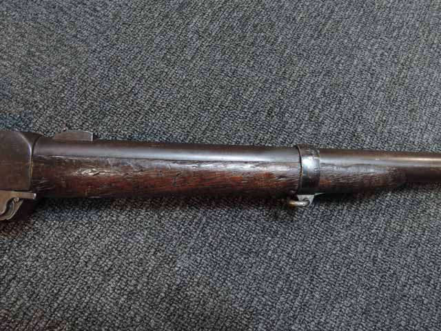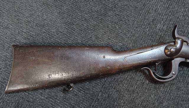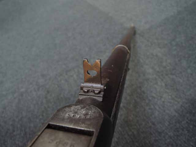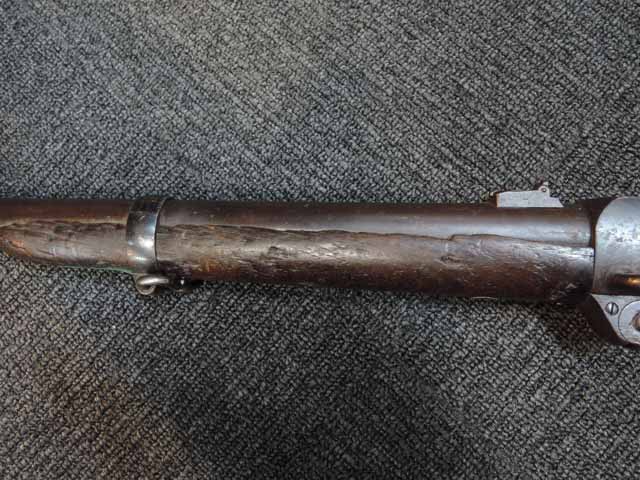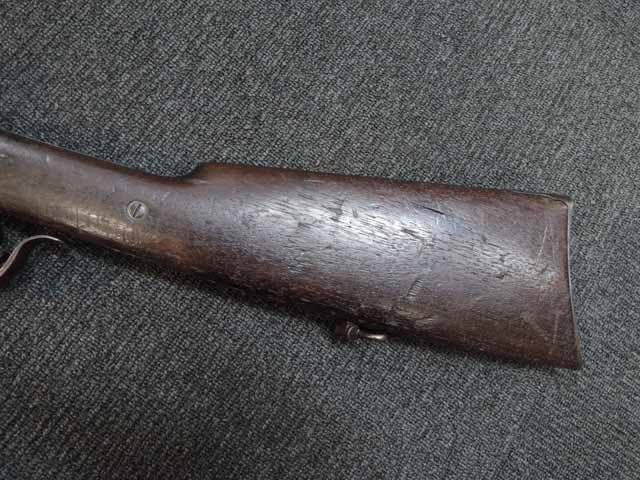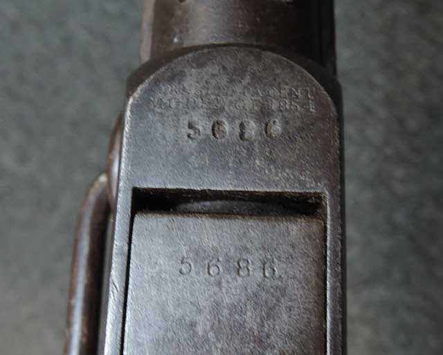 本品はシリアル#5686はフレームとブリーチで一致しています。 また銃のシリアルの上に「BURNSIDE PATENT」と「MODEL OF 1864」の刻印が有り、またフレームのストック基部付近には「BURNSIDE RIFLE Co. PROVIDENCE RI」の刻印がそれぞれ経年によりやや掠れてはいますが読むことができます。