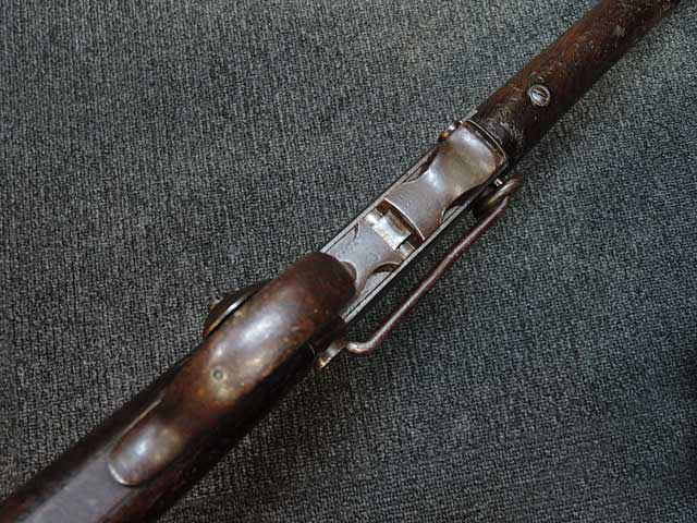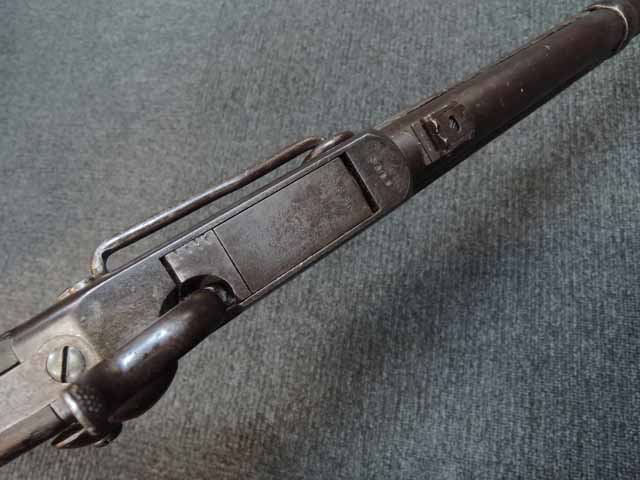 無可動実銃ですが、レバー部は可動し、それに付属する機関部一部が可動します。ウィンチェスターのような連発式のレバーアクションではなく、ブロックが回転するような独特の動きを持つ面白い無可動実銃です。 トリガーテンションのある、旧加工品です。 (TY)