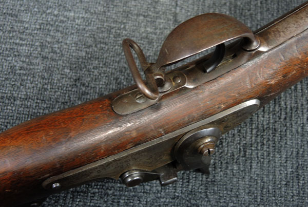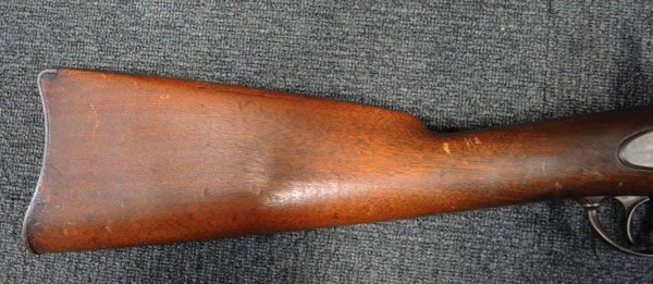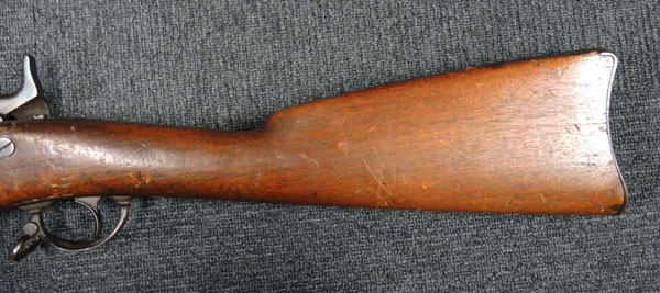 本品は金属部全体に錆も殆どなく、非常に状態の良い品です。 オリジナル・フィニッシュのままと思われるストックも非常に時代感のある良い感じです。 ブリーチ上面にはUS MODEL1870とあります。 サイドプレートには若干の黒錆が見られますが、Springfeild造兵廠のイーグル紋章とUS SPRINGFIELDの刻印が入っており、しっかりと視認可能です。 バット・プレートにUSの刻印があります。 銃床の先端右側の一部が欠けています。 極初期の輸入と思われる旧加工品です。