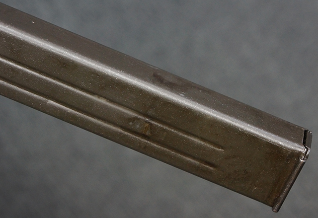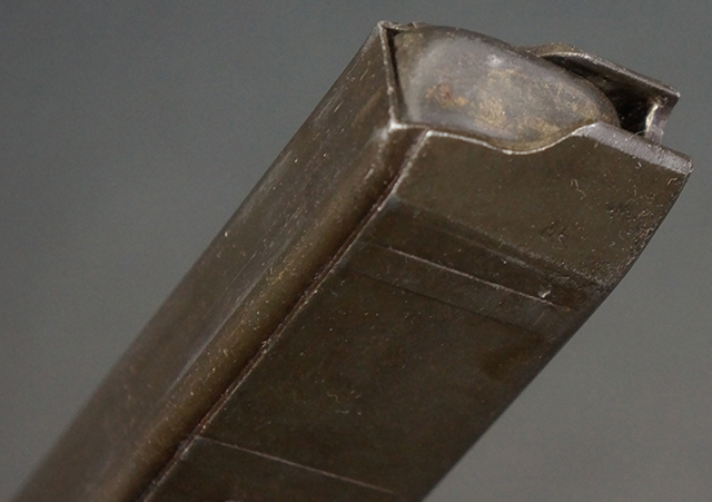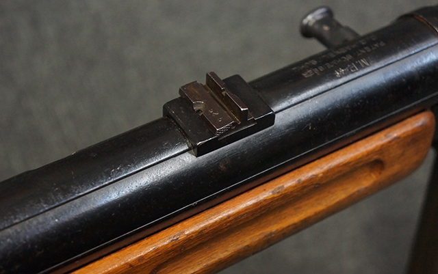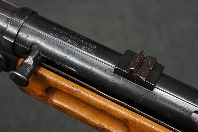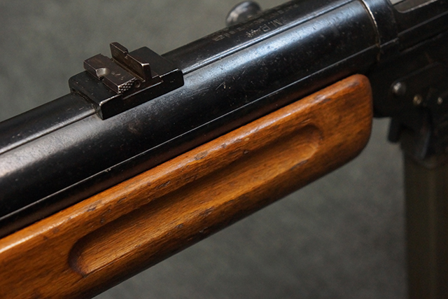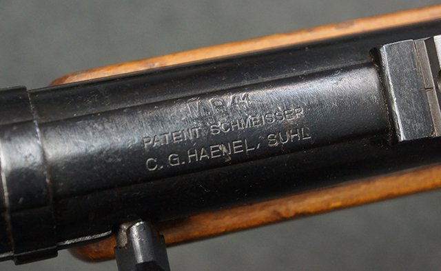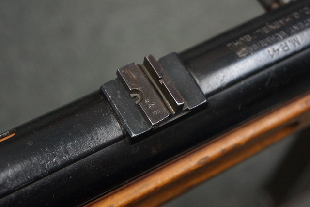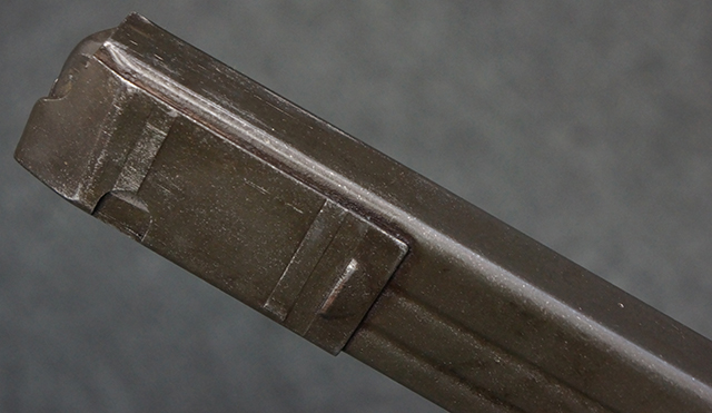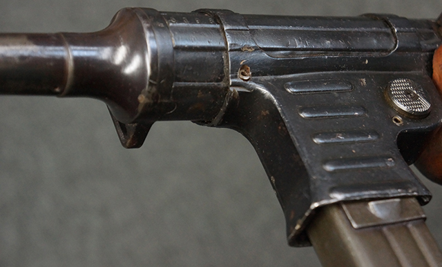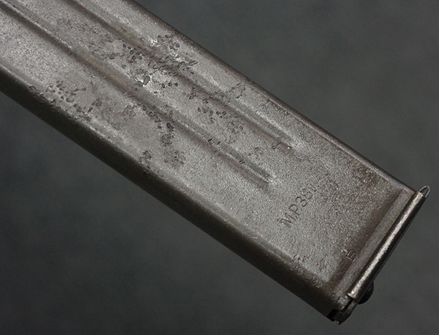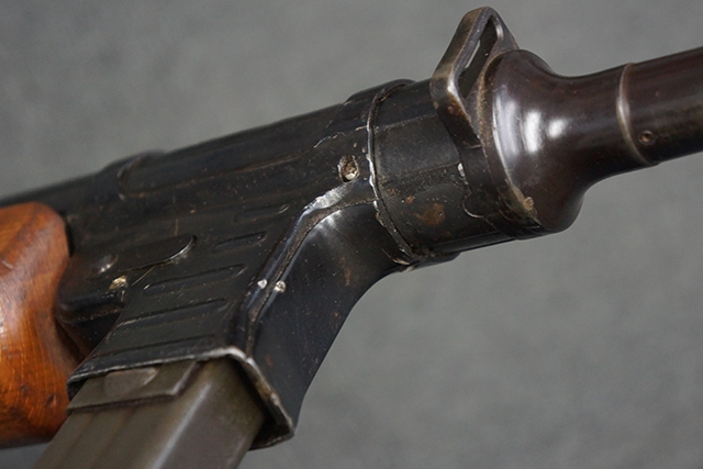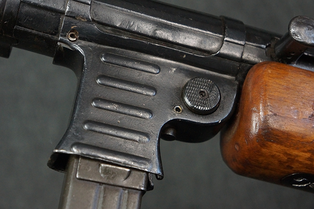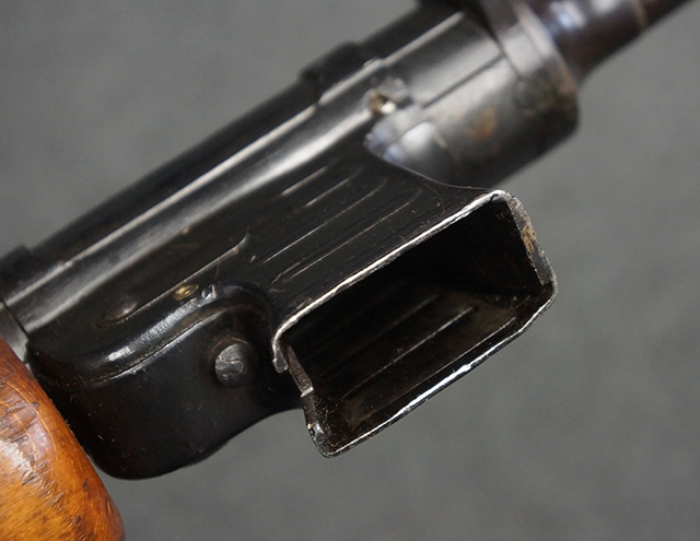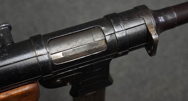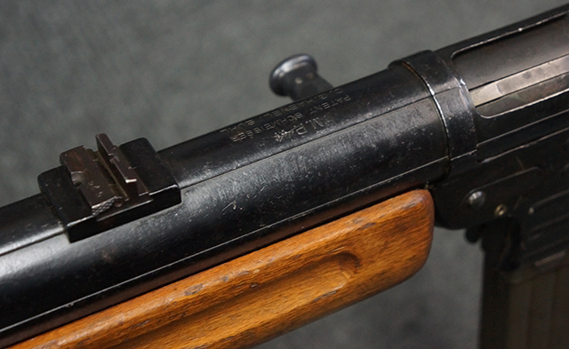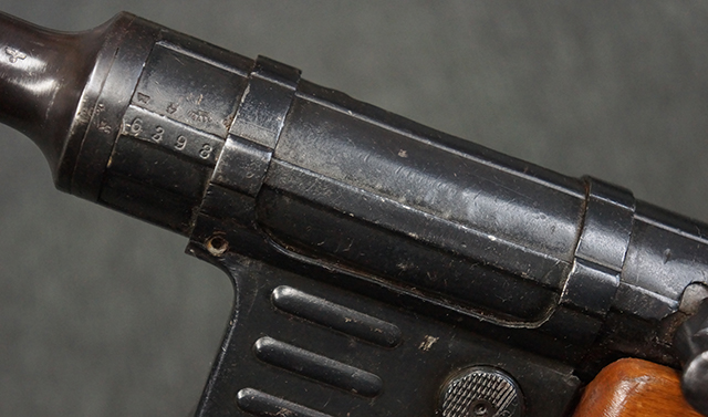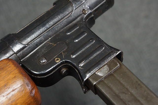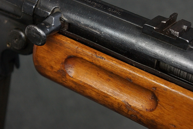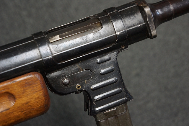 本品のレシーバー上面には「MP41 PATENT SCHMEISSER C.G.HANEL, SUHL」のパテント刻印がはっきりと入っています。 金属部分については若干の擦れや小傷は見受けられるものの、全体にオリジナルの黒染めの表面仕上げが残っており、良好な状態が保たれています。 レシーバー・エンド・キャップには金属の地肌が表れている箇所が見受けられ、銃身下部に前後に渡って補修跡がありますが、綺麗に仕上げられている上に下面ということもあり、非常に目立ちにくくなっています。