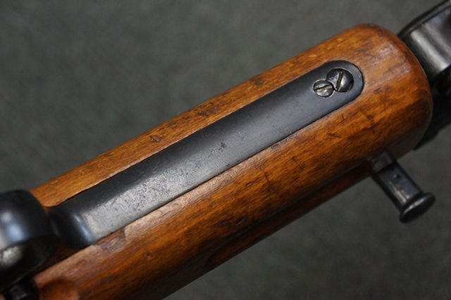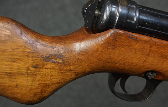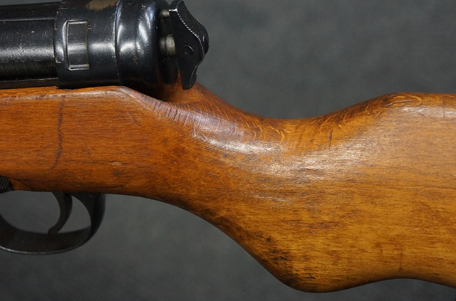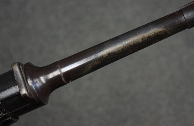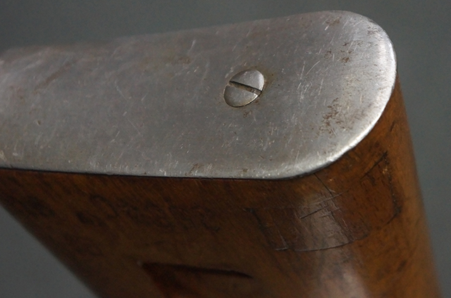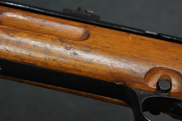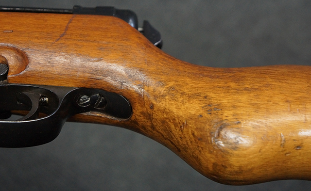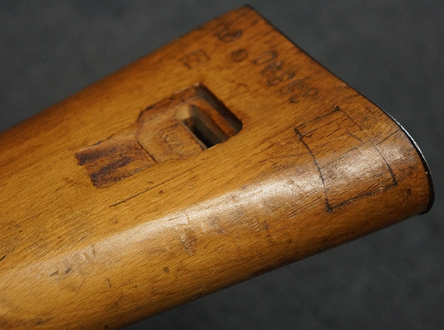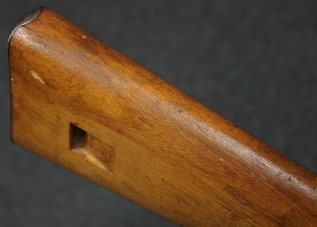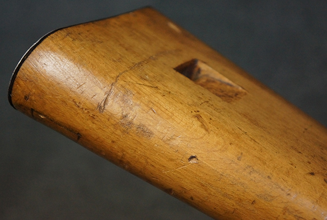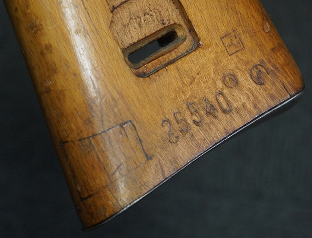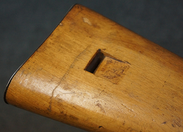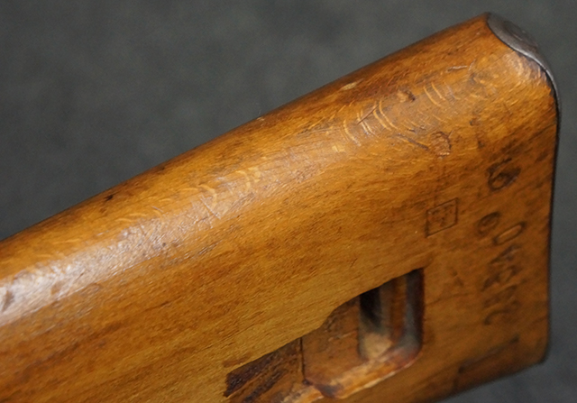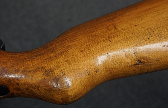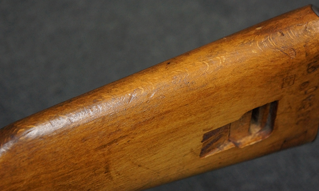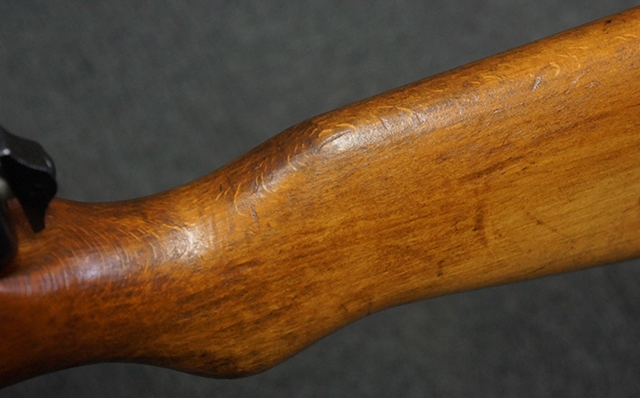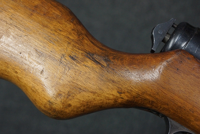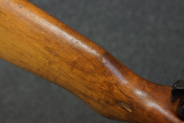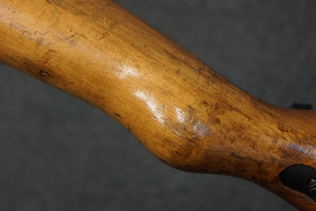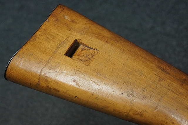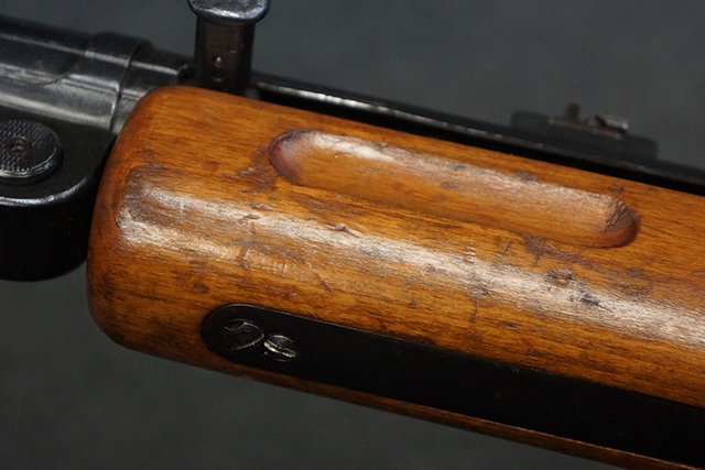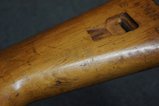 木製ストックはやや明るい色合いで、やや打ち傷や線傷が見受けられるものの、目立った破損等は見受けられず、艶の有る仕上げが残ったしっかりとした状態が保たれています。 銃床右側面のハンドガード下部、銃把付近及びバット・ストック後端上部にやや目立つ打ち傷が見受けられますが、いずれも強度的には影響の無いレベルです。 バット・プレート近くの左側面下部に接ぎ木による当時の修理跡が見受けられます。 傷みやすいバット・プレートについては全体に白磨きのような状態となっており、若干の小傷や表面錆は見受けられるものの、目立った変形などは見受けられず、比較的良好な状態が保たれています。